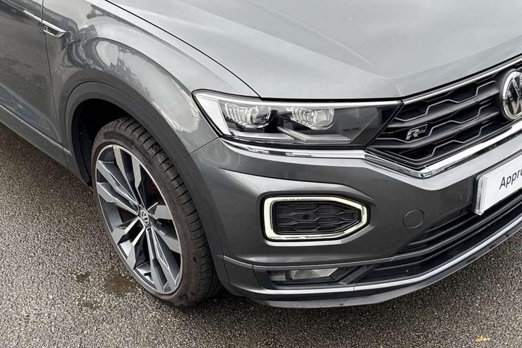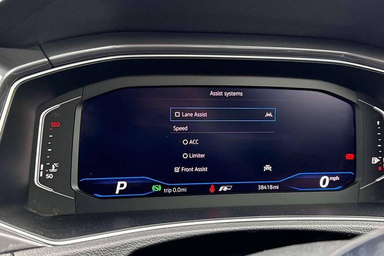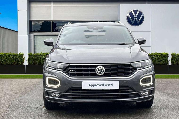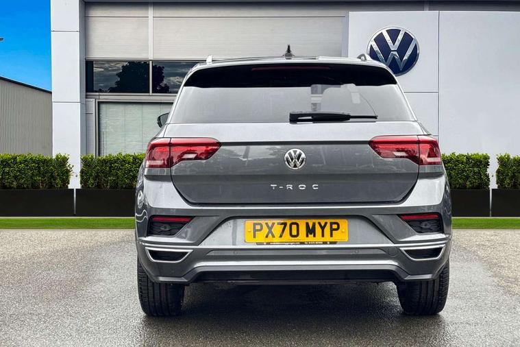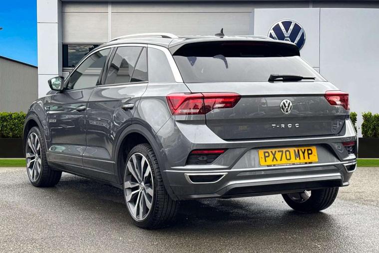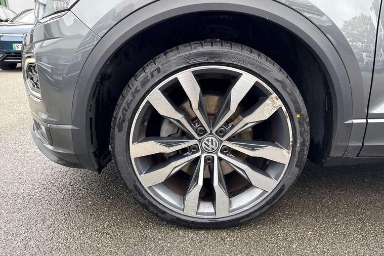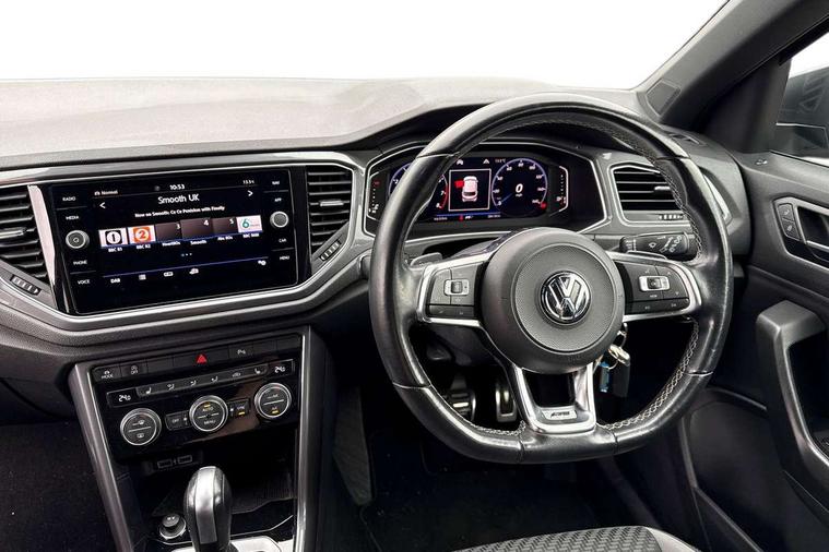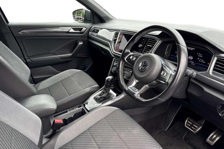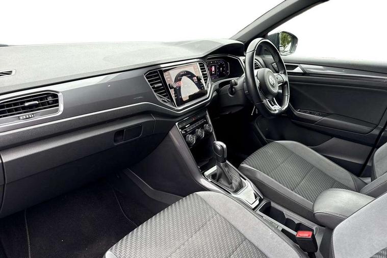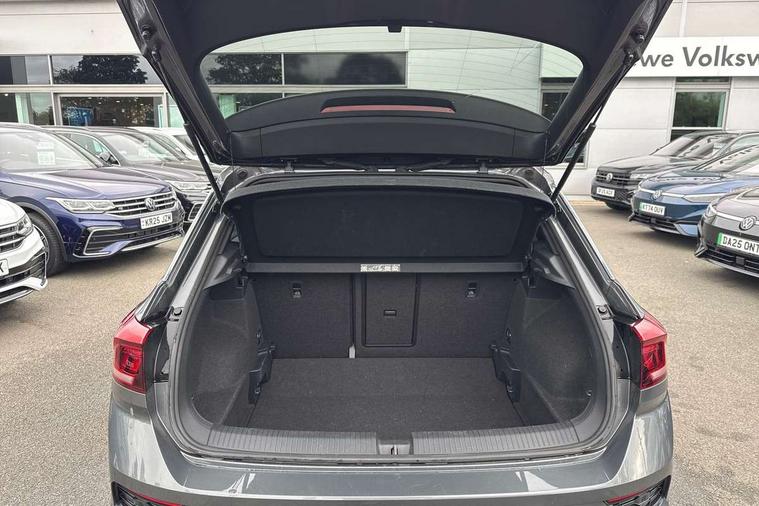 'Lights On' Reminder warning buzzer, Adaptive cruise control with front assist, radar sensor controlled distance monitoring, city emergency braking, Automatic start/stop system, Bluetooth telephone and audio connection for compatible devices, Car information display, Digital Cockpit Pro - Active info display, Discover navigation including 8" touch screen display, streaming and internet, Driver alert system with audible and visual fatigue detection system, Driver tips and journey analysis, Lane assist with warning text instrument cluster, Modified key software - reduce switch off time for key status change to Long no motion, Multifunction computer with visual gear change recommendation for fuel consumption, Service interval indicator, Think blue trainer driver tips and journey analysis, Voice activation, Wireless app connect for apple carPlay, Battery regeneration during braking, Centre arm rest including USB type C interface and USB charging socket, DAB Digital radio, Diversity antenna for FM reception, Front USB type C Interface 2X and USB charging socket, Music playback - MP3, WMA and AAC files, Premium USB cable in choice of either Apple or Android smartphone compatibility, SD card slot, Simultaneous pairing of 2 compatible mobile devices, SMS functionality - read, compose and send SMS messages using touch-screen display, Storage compartment with longitudinal and height adjustable in armrest and two rear air vents, Three route options - Fast, Short, Eco, Title and cover art display, Auto dimming interior rear view mirror, Black grained lower door protectors, Body colour door handles, Body colour rear roof spoiler, Chrome effect left and right trapezoid exhaust tailpipe fascia surround, Chrome trim on upper and lower radiator grille, Dusk sensor, Electrically foldable, adjustable and heated door mirrors with puddle lights and reverse activated kerb-view adjustment on passenger's door mirror, Front and rear electric windows, Front fog lights with static cornering function, Front windscreen wiper with intermittent wipe and 4 position delay, Fully galvanised body, Heated rear window, High level 3rd brake light, LED darkened rear light clusters, LED rear number plate lights, Manual coming/automatic leaving home lighting function, Rain sensor, Rear tinted glass from B-pillar backwards approx 65% tinted, Rear wash/wipe with intermittent wipe setting, Volkswagen roundel, 2 Front and rear reading lights incorporating LED technology, 3 rear head restraints, 4 load lashing points in luggage compartment, Aluminium pedals, Ambient lighting in front footwell and light strips below trim in front doors, Black roof lining and sun visors, Branded points of interest, Carbon flag cloth upholstery, Climate control - 2 zone electronic air conditioning with automatic air recirculation and allergy filter, Drawer under drivers seat, Front + rear carpet mats, Front cupholders x 2, Front seat back storage pockets, Front sports seats with R-Line logo on seat backrest, Glovebox, Height adjustable front seats, Height/reach adjust steering wheel, Illuminated vanity mirrors, Instrument lighting, white adjustable panel illumination, Interior light delay, Isofix easy fit child seat preparation for 2 outer rear seats, Load through provision with single cup holder when folded down, Luggage compartment cover, removable, Luggage compartment lighting, R Line badge, Split folding rear seat backrests with centre armrest, Storage compartment in left and right luggage area, Storage compartment in rear doors, Storage compartments in driver and front passenger doors, Three spoke multi function leather trimmed steering wheel and gear knob including paddle shift, Unique R Line door sill protectors, R line styling pack - T-Roc, 3 rear three point seatbelts, ABS, Curtain airbags, Driver and front passenger safety-optimised head restraints, Drivers and front passengers airbags with passengers deactivation switch, Drivers seatbelt reminder, Electronic parking brake with auto hold, Electronic stability control (ESC) includes ASR, EDL, EDTC and trailer stabilisation function, Front seat side impact airbags, Predictive pedestrian protection, Rigid safety cell with front and rear crumple zones, Three point height adjust front seatbelts + pretensioners, Tyre pressure loss indicator, Ventilated front and rear disc brakes, Volkswagen roadside assistance, Alarm with remote central locking and interior protection, Electronic engine immobiliser, Remote central locking with 2 remote folding keys, Shadow steel decorative inserts in dash and door panel, 19" Suzuka alloy wheels with low rolling resistance tyres and anti wheel bolts,
