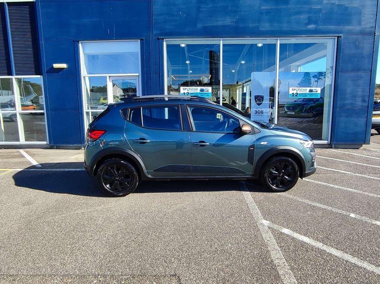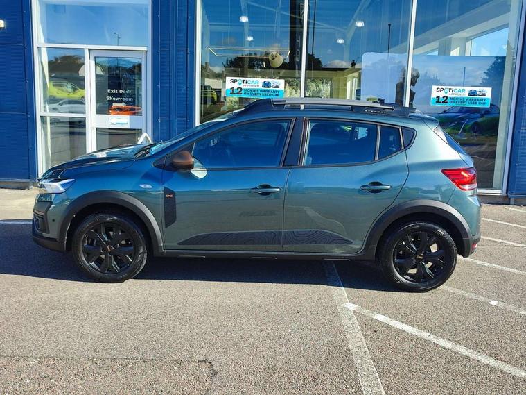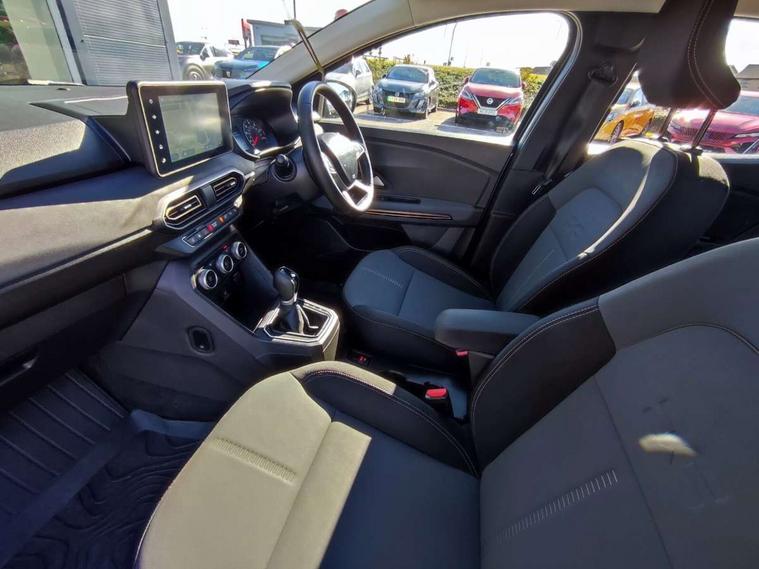 3.5" TFT instrument panel with on-board computer, Blind spot warning, Cruise control with speed limiter, eCall emergency call system, Eco mode, Electric power assisted steering, Extended grip switch, Front parking sensors, Rear parking sensors, Rev counter, Reversing camera, Stop/start system, 8" MediaNav with DAB Radio + Smartphone replication + Bluetooth + 6 Speakers with Apple Carplay and Android Auto, USB connection for data transfer and charging, USB socket, 3 speed windscreen wipers, Auto lighting, Automatic wipers, Black radiator grille with white inserts stepway inscription, Body colour door handles, Body coloured bumpers, Copper Brown Dacia inscription on tail gate, Copper brown deco part on fog lamp area, Copper brown door mirrors, Copper brown stepway inscription on roof bars, Door sills in topographic pattern, Drivers one touch electric windows, Electrically adjustable and heated door mirrors, Front electric windows, Front fog lights, Heated rear window, High level third brake light, Lateral sticker with topographic pattern, LED automatic daytime running lights, LED Y-shape Dacia signature lighting, Megatith modular roof bars, Rear electric windows, Rear side wing doors, Rear wash/wipe, Shiny black shark antenna, Snorkel sticker with topographic pattern, Tinted windows, 1/3 to 2/3 split folding rear seats, 12 volt front socket, 12 volt rear socket, 3 height adjustable rear headrests, 3 seat rear bench, Automatic air conditioning, Copper brown doors deco parts, Driver and passenger vanity mirror with cover, Fabric upholstery, Fixed smartphone holder on dashboard, Fog grey animation on air vents, Fog grey interior door handles, Front and rear rubber mats with topographic pattern, Height adjustable drivers seat with armrest, Height adjustable front headrests, Height/depth adjustable steering wheel, High central armrest with console storage, Isofix points for child seats in both outer rear seats, Micro-cloud grey fabric on dashboard, Single front passenger seat, Soft feel steering wheel, Steering wheel controls, 3x3 point rear seatbelts, ABS and Emergency brake assist, Automatic emergency braking system, Child locks on rear doors, Door open visual and audible warning, Driver airbag, EBD - Electronic brakeforce distribution, Electronic parking brake, ESC (Electronic Stability Control), ESP + Hill Start Assist, Front curtain airbags, Front seatbelt pretensioners, Front side airbags, Height adjustable front seatbelts, Passenger airbag, Seatbelt reminder for driver and front passenger, Tyre pressure monitor, Automatic central locking, Immobiliser, Keyless entry, Remote central locking, Decopart on instrument panel and door with textile, 16" Full Black Diamond-effect alloy wheel with Copper brown Dacia logo on wheel centre caps,