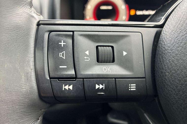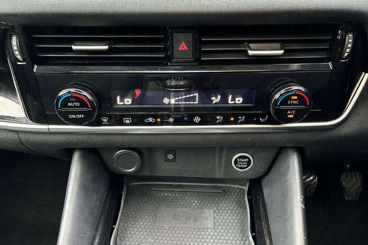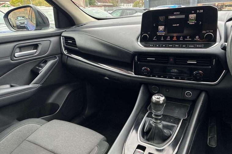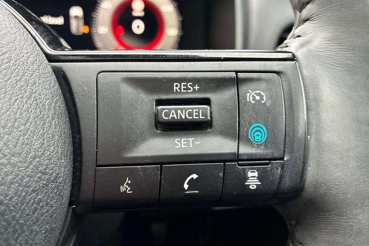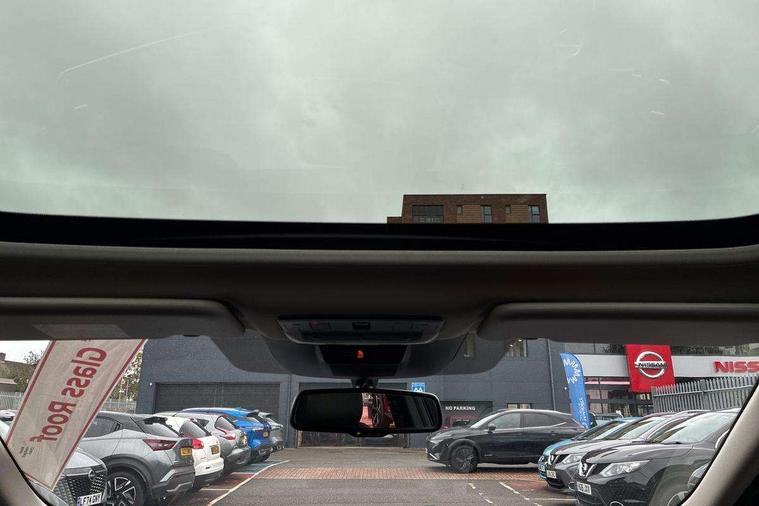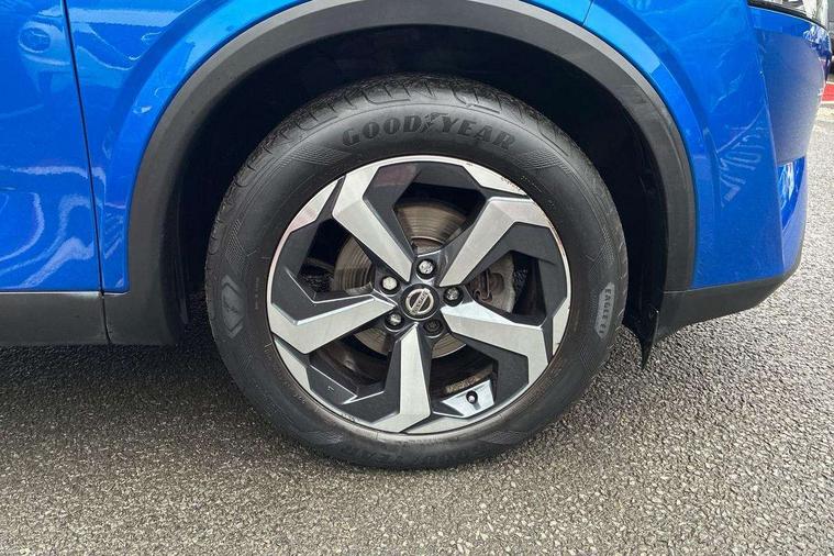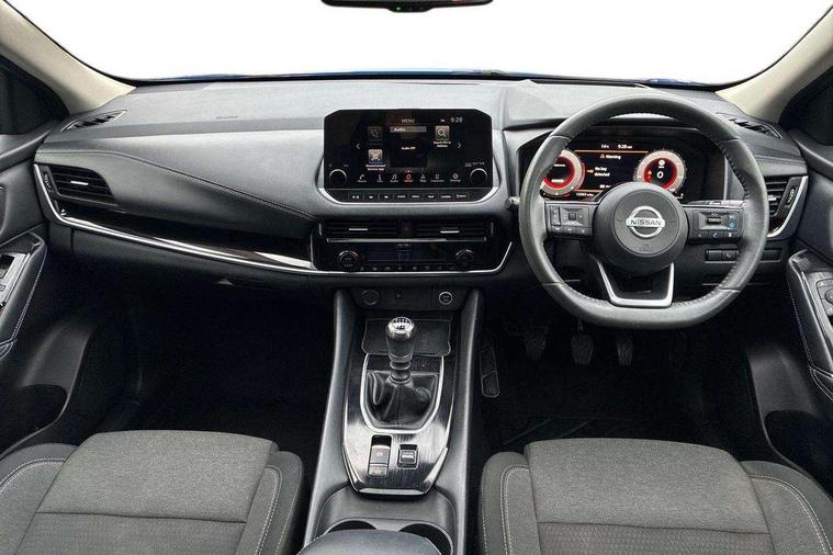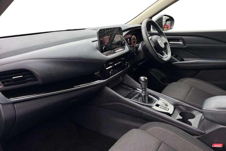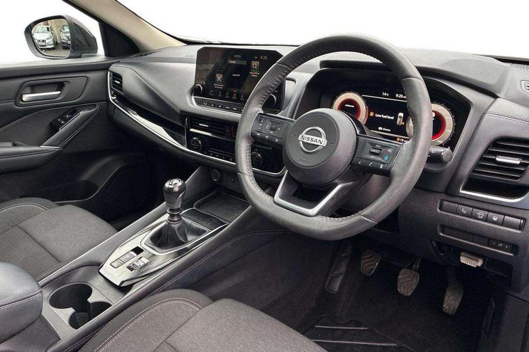Android auto/Apple CarPlay (Wired), Blind spot warning, Drive modes (sport, normal, eco), Electric speed sensitive power steering, Emergency and breakdown call, Front and rear parking sensors, Full Digital 12.3" TFT Digital Combimeter, Idle stop/start system, Intelligent Cruise control (ICC), Intelligent driver alert system, Intelligent forward collision warning, Intelligent lane intervention, Lane departure prevention, Lane departure warning system, Moving object detection, Push button starter, Rear cross traffic alert, Traffic sign recognition, Trip computer, 6 speakers, AM/FM audio system with DAB, Bluetooth audio streaming, Front USB connections (Type-A and Type-C), Rear USB charging only ports (Type-A and Type-C), Auto dimming rear view mirror, Auto rear wiper when reversing, Body colour mirror caps, Body coloured door handles, Bodyside mouldings, Chrome side window finisher, Electric auto folding door mirrors, Electrically adjustable and heated door mirrors with LED turn indicator, Fixed panoramic glass roof with electric sunshade, Follow me home headlights, High beam assist, Intelligent auto headlights, LED daytime running lights, LED headlights with adaptive driving beam, LED rear lights, One touch front and rear electric windows with remote opening and closing, Partially body coloured bumpers, Privacy glass, Rear roof spoiler, Rear styling plate, Roof rails, Shark fin antenna, Splash free rain sensing wipers, Super UV and infrared cut glass, Three blink turn signal, 12v power socket in dashboard and luggage, 2 way electrical driver lumbar adjustment, 2x Rear coat hooks, 3 rear headrests, 4 grab handles, 6 Luggage hooks - 4 on floor, 2 on side, 60/40 split folding rear seat, Ambient lighting around centre console, Centre console storage tray, Chrome interior door handles, Cloth monoform upholstery, Driver and front passenger sunvisors with illuminated vanity mirrors, Driver seat back pocket, Dual zone automatic climate control with pollen filter, Front centre console and armrest, Front cupholder, Front door with bottle holders, Glovebox with light, Hard trunk cover, Height adjustable front headrests, Leather shift knob, Leather steering wheel, Luggage board system, Luggage space lighting, Manually adjustable passenger (slide recline + lifter), Multifunction steering wheel, Passenger seat back pocket, Rear armrest with 2 cupholders, Rear door bottle holders, Soft PVC kneepad, Steering wheel switches, Tilt/telescopic adjustable steering wheel, Two rear isofix child seat anchorage points with top tether, Welcome light and console tray ambient lighting, Connectivity Pack - Qashqai, Tech Pack (Drive Assist + HUD), 3x3 point rear seatbelt pretensioners + load limiters, ABS, ESP, EBD and brake assist, Active brake limited slip, Auto hold function, Child locks on rear doors, Curtain and front side, far side airbags, Driver and passenger airbags, Driver, passenger and 2nd row rear seat belt reminder, Electronic parking brake, Front seatbelt pretensioners + load limiters, Height adjustable front seatbelts, Hill start assist, Intelligent blind spot intervention, Intelligent front emergency braking with pedestrian, cyclist recognition and junction assist, Intelligent rear automatic braking, Tyre pressure monitoring system, Vehicle dynamic control, Capless fuel filler, Engine immobiliser, Nissan i-key, Remote central door locking with deadlocking, Thatcham Cat.1 alarm, 18" Diamond cut alloy wheels,