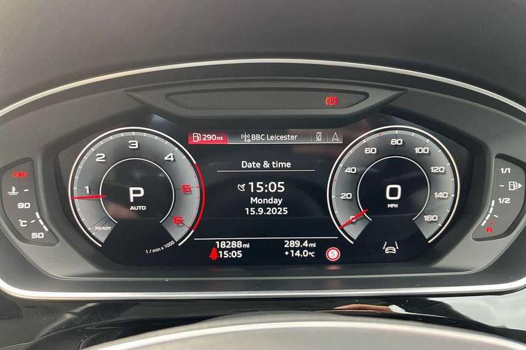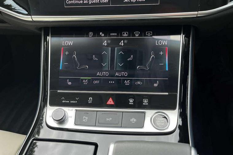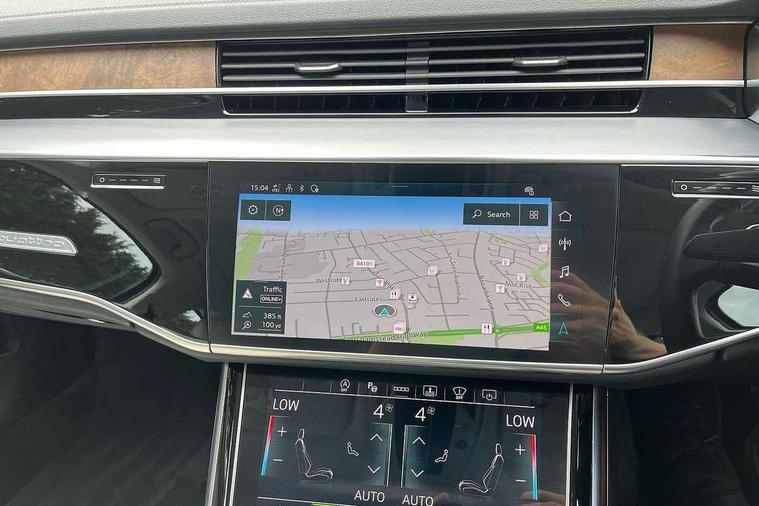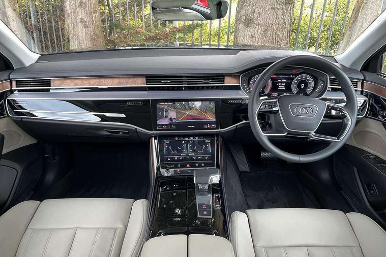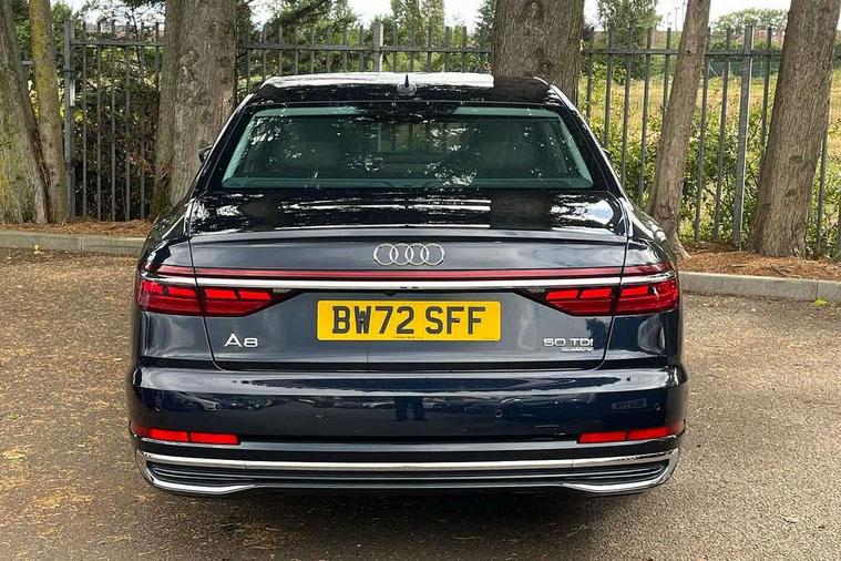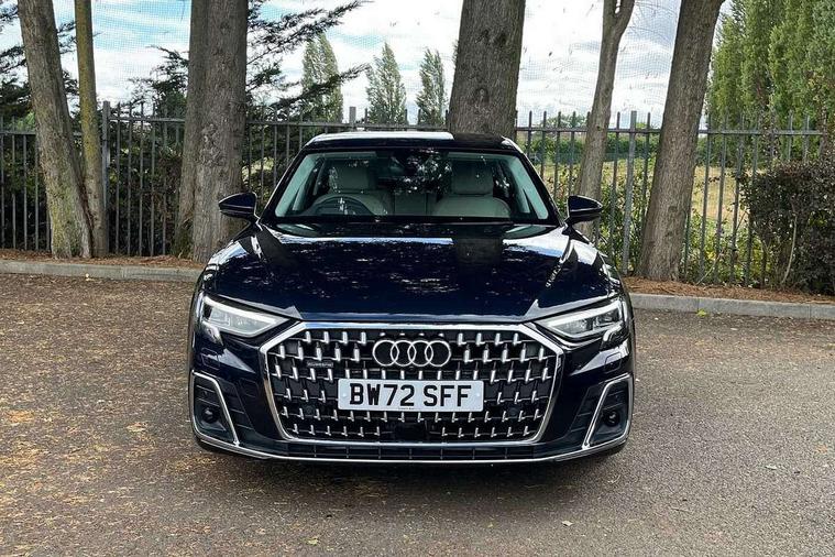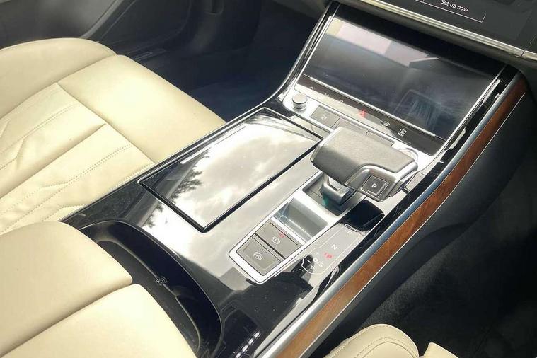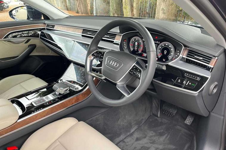 'Lights On' Reminder warning buzzer, Adaptive cruise control with cruise assist, emergency assist, efficiency assist, swerve assist, turn assist and speed limiter, Audi connect safety and service (e-call), Audi drive select, Audi parking system plus with front and rear sensors, Audi phone box with wireless charging, Audi virtual cockpit, Audi wireless smartphone interface, Bluetooth interface, Camera based traffic sign recognition, Convenience key, Electro - mechanical power assisted steering, Head up Display, MMI navigation plus with MMI touch + Twin touch screens with haptic feedback, Operating buttons in black, glass look with haptic feedback, Power door closure, Power operated tailgate, Rear central control unit, Rear view camera, Remote fuel filler release, Service interval indicator, 24 litre AdBlue tank, 48V Mild hybrid technology, 8 speed transmission with hill hold assist, 82 litre fuel tank, Adaptive air suspension, Diesel particulate filter, Quattro all wheel drive with self locking centre differential, Audi music interface, Audi sound system, DAB digital radio module, DVD System, MMI radio plus, USB connection, USB ports with charging function in the rear, Audi space frame, Auto dimming rear view mirror, Body colour bumpers, Body colour door handles, Body colour exterior mirror housings, Body colour side protection with aluminium trim strips, Electric front windows, Electric rear windows with isolation switch, Electrically adjustable heated folding + automatically dimming exterior mirrors with memory function and integrated LED indicators, Front wash/wipe with interval delay, Heat insulating darkened glass in side and rear windows, Heat insulating glass windscreen, Heated rear window, Heated windscreen washer jets, High beam assist, LED brake lights, LED daytime running lights, LED Headlights, LED third brake light, OLED rear lights with changeable rear light signature, Rear boot, Rear side wing doors, Side skirts, Welcome/leaving lighting, 4 zone control automatic air conditioning, Centre console with cupholders, Comfort centre armrest, Comfort rear headrests, Door pockets with bottle holder, Driver and front passenger side sunvisors with illuminated vanity mirrors, Dust/pollen filters, Electric front seats with memory function, Front floor mats, Glove compartment cooling, Heated front seats, Heated rear seats, Height/reach electric steering column with easy exit function, Isofix child seat mounting points on outer rear seats, Leather gearknob, Passenger footwell storage net, Roof mounted sunglasses holder, Silver cloth headlining, Single front passenger seat, Valcona leather upholstery with contour comfort front seats, Chrome exterior pack - A8, High gloss styling pack - A8, LED interior lighting pack - A8, 3 point seatbelts on all rear seats, ABS/EBD, Active front headrest system, ASR traction control, Audi pre sense basic, Audi pre sense front, Black brake calipers, Driver/Front Passenger airbags, EDL traction control, Electromechanical parking brake, ESP, Extended pedestrian protection measures, Front and rear disc brakes, Front and rear side airbags with head airbag system, Front passenger airbag deactivation, Rear child proof door locks, Seatbelt reminder + electric contact in buckle + advanced safety equipment, Tyre pressure loss indicator, Warning triangle and first aid kit, Anti theft alarm tow away protection, Anti-theft wheel bolts and wheel loosening detection, Remote central locking, Dark matt brushed aluminium lower inlays,