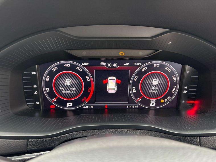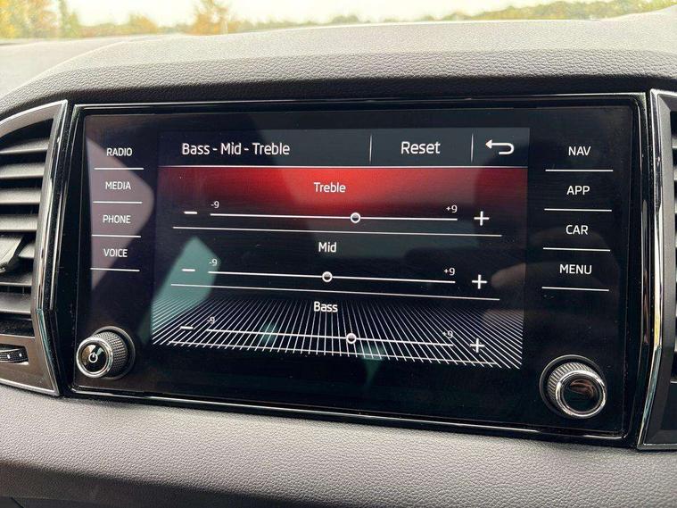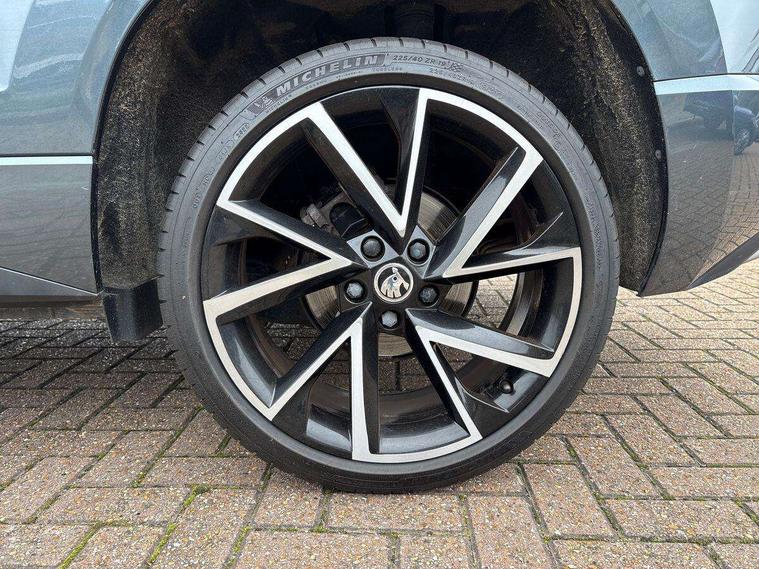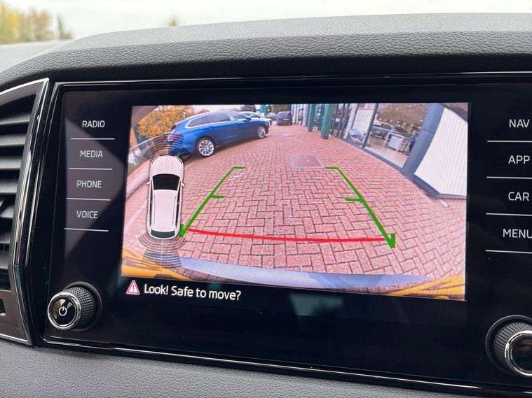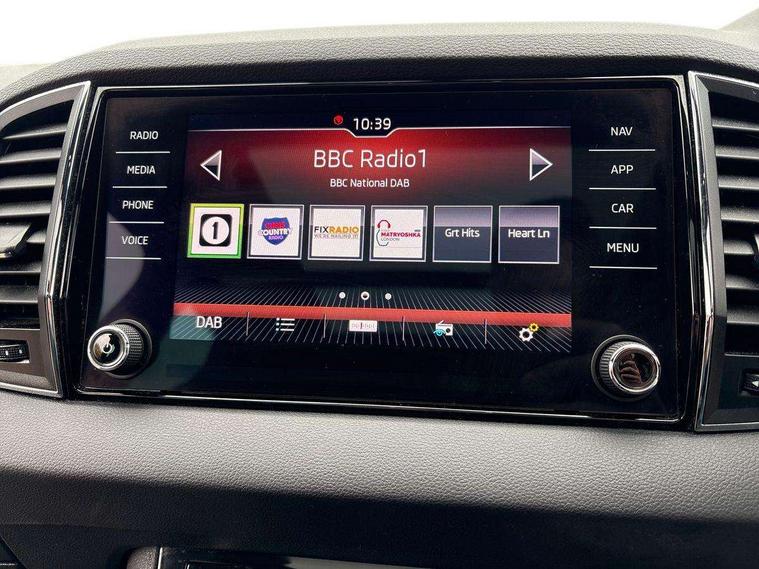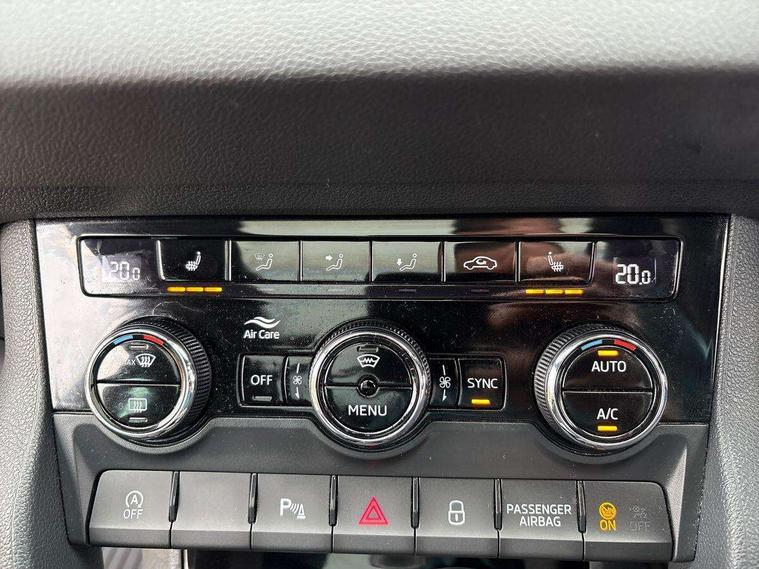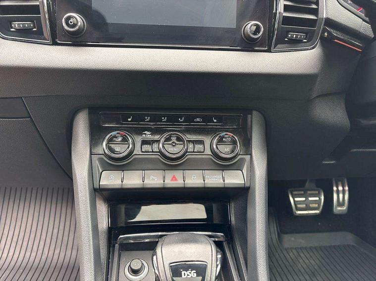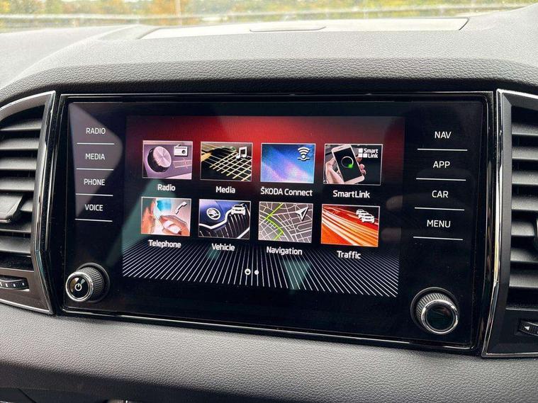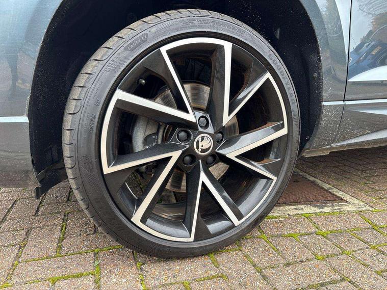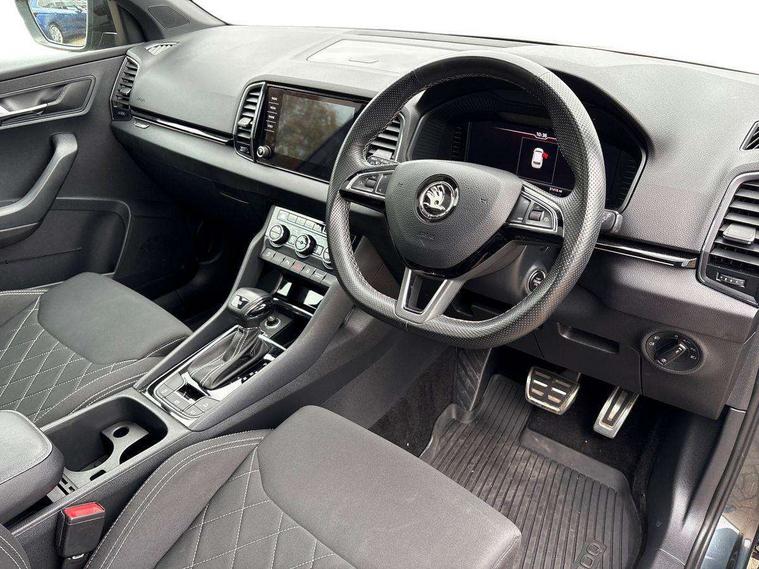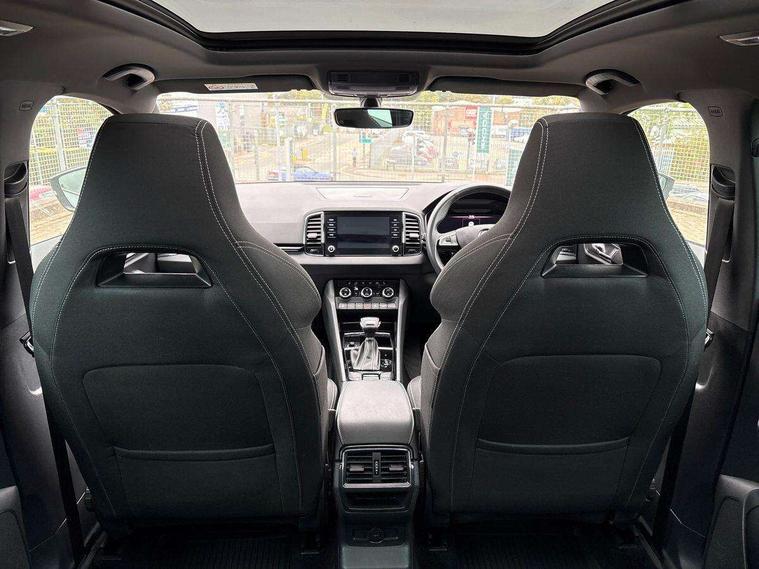 Drive mode selector, Driver alert system, Driver fatigue sensor, Driver profile selection, Multifunction colour trip computer, Outside temperature gauge, Rear view camera, Service interval indicator, Start/stop system with regenerative braking, DAB radio with Bluetooth, SD card slot, USB connection, Acoustic glass, Aero front windscreen wipers with intermittent function, Automatic headlight control system, Black electric window control buttons, Black roof rails and door mirrors with radiator grille, Body colour door handles, Electric front and rear windows with child proof lock, Front door steps with SportLine logo, Full LED headlights + adaptive front light system + LED daytime running lights and front cornering fog lights, Headlight washers, Heated rear windscreen, LED rear lights with high functionality, Light assistant (coming/leaving home/tunnel light), Panoramic sliding sunroof, Privacy glass, Protective door side sills in body colour, Rear diffuser, Safety reflectors on front doors, Skoda lettering on tailgate in black, Sportline badge on front fender, Sportline decorative inserts with badging, Sports front and rear bumpers, Third brake light, 1.5 litre bottle holders in driver and front passenger door panels, 12V socket in boot, 12v socket in front centre armrest with storage compartment and rear air vents, 2 Folding hooks and nets in boot, 2 Front readings lights for driver and passenger, 3 rear height adjustable headrests, 3 spoke sports leather multi-function steering wheel with silver stitching + paddle shift, 4 foldable roof handles with rear coat hooks, 4 lashing points on luggage floor, Aluminium pedals, Backrest release, Black roof headlining, Cargo elements in boot, Chrome inner door handles, Driver and passenger seats height adjust, Dual zone climate control, Front head restraints, Front seat and rear pockets, Height adjustable front three point seats belts with tensioners, Height/reach adjust steering wheel, Ice scraper, Illuminated and cooled glovebox, Illuminated luggage compartment, Isofix child seat preparation outer rear, Manual lumbar support for front seats, Net programme in boot, Pen holder, Pollen filter, Rear boot cover, Rear reading lights, Rear seats fixed folding and divided 60:40, Retractable parcel shelf attachable to tailgate, Safety vest holder, Storage box in upper central dashboard closed, Storage compartment below the passenger seat, Sunvisors with illuminated vanity mirrors, Textile floor mats, Umbrella under passenger seat, Welcome animation with sportline logo, LED Interior lighting pack with Skoda welcome logo - Karoq, Airbags - Front side, head, knee and curtain, Automatic door unlocking in case of crash, Automatic fuel cut off in case of crash, Driver airbag, Electronic parking brake with auto hold function, Emergency rear braking signal, ESC including ABS, MSR, ASR, EDS, HBA, DSR, RBS, MKB and traction control, Front assist radar scanning of the space in front of the car with automatic braking, Hill hold control, Passenger airbag with switch-off function, Pedestrian monitor, Seatbelt reminder signalisation and pretensioner for all seats, Three point seatbelts rear, Two tone horn, Tyre pressure display, Tyre pressure monitor, Alarm with interior monitoring, back up horn and tilt sensor with safe function, Electronic engine immobiliser, Keyless entry and keyless start with safe system, Remote central locking with 2 remote folding keys, Black air vent surround, 19" Vega anthracite alloy wheels, Anti-theft wheel bolts protection, Storage on wheel cover,