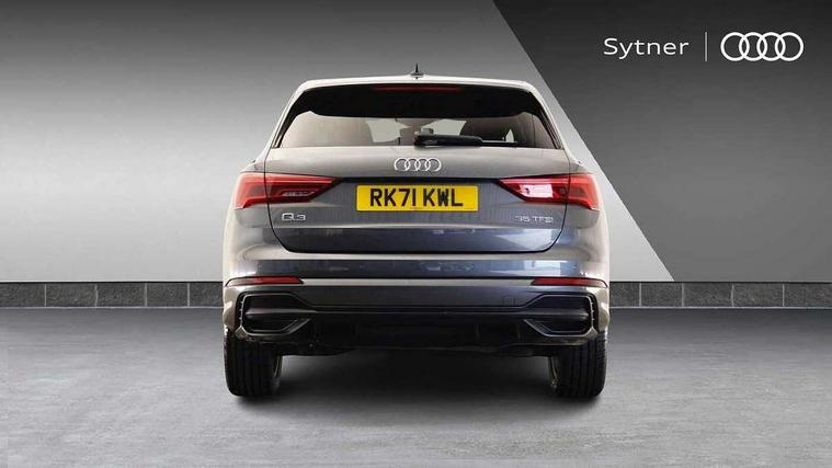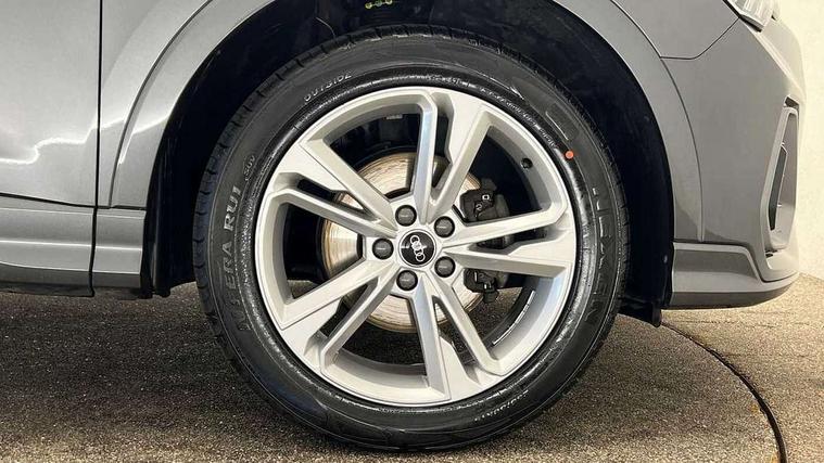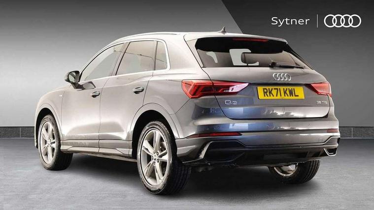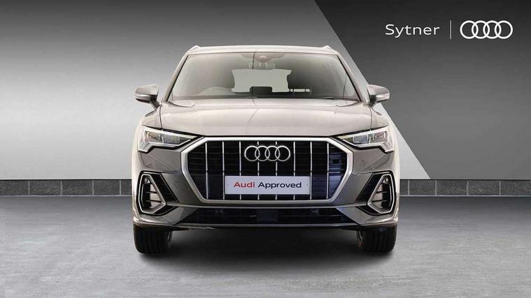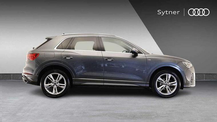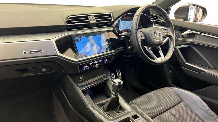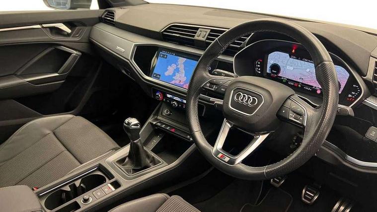 Amazon alexa Integration, Audi connect safety and service (e-call), Audi drive select, Audi lane departure warning, Audi Virtual Cockpit - 10.25" display, Bluetooth interface, Camera based traffic sign recognition, Cruise control + speed limiter, MMI Navigation Plus with high resolution 10.1 inch touchscreen colour display, Power operated tailgate, Progressive steering, Rear parking sensors, Service interval indicator, Smartphone interface includes wireless Apple carplay/Android Auto, Start stop system with recuperation, Voice control system with natural language interaction, Sports suspension, 2 USB-C ports with charge and data functions, 6 passive loudspeakers, DAB digital radio module, Acoustic windscreen, Aluminium roof rails, Aluminium window trim, Auto dimming frameless rear view mirror, Body coloured bumpers, Electrically folding, adjustable and heated door mirrors with integrated LED side indicators and kerb view function for passenger side, Front and rear electric windows, Front fog lights, Front side air inlets in matt platinum grey, Front spoiler blade in matt platinum grey, Grille vertical bars in aluminium silver/Matt, High gloss black finish B and C pillars, LED headlights with LED daytime running lights and dynamic rear indicator, LED rear lights, Privacy glass dark tinted rear and rear-side windows (from B-pillar backwards), Rain and light sensors, Rear diffuser strip in matt titanium black, Rear side wing doors, Rear wiper, S line badges on front wings, S Line front and rear bumpers, Side skirt insert in matt Platinium grey, Silver chrome grille surround, Third brake light, Tinted rear windows, Titanium black radiator grille, Variable front intermittent wipers, 12V socket in rear centre console, 3 seat bench in 2nd row, 40:20:40 folding with manual adjustment for 60:40 forwards/backwards position and backrest angle, Adjustable rear seat bench/backrest with centre armrest and cupholder, Black cloth headlining, Dual zone electronic climate control, Front and rear black floor mats with contrast stitching in rock grey, Front and rear headrests, Front and rear roof module including reading lights, Front centre armrest, Glove compartment lighting, Height and reach adjustable steering wheel, Illuminated door sill trims with S logo, ISOFIX child seat mounting for front passenger with airbag deactivation and outer rear seat including top tether attachment point for outer rear seats, Luggage compartment light, Manual front seats with height adjustment, Perforated leather gearknob, Single front passenger seat, Stainless steel luggage compartment sill finisher, Stainless steel pedals, Non smoking pack - Q3, 3x3 point rear seatbelts, 6 airbags - Driver, front passenger, curtain and side windows, Audi pre-sense front with pedestrain and cyclist recognition, Electrically operated child locks on rear doors, Electromechanical parking brake, Electronic stabilisation control including ABS, ASR and EDL, Front seatbelt reminder, Hill descent control, Hill hold assist, Pre sense basic, Seatbelt monitoring, Tyre pressure warning, Warning triangle and first aid kit, Anti theft alarm, Anti theft wheel bolts, Immobiliser, Remote central locking, Dark matt brushed aluminium inlay, Detail dashboard around MMI touch colour display in glass look, black with surround in aluminium look, Leatherette door armrest,