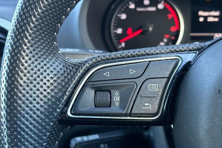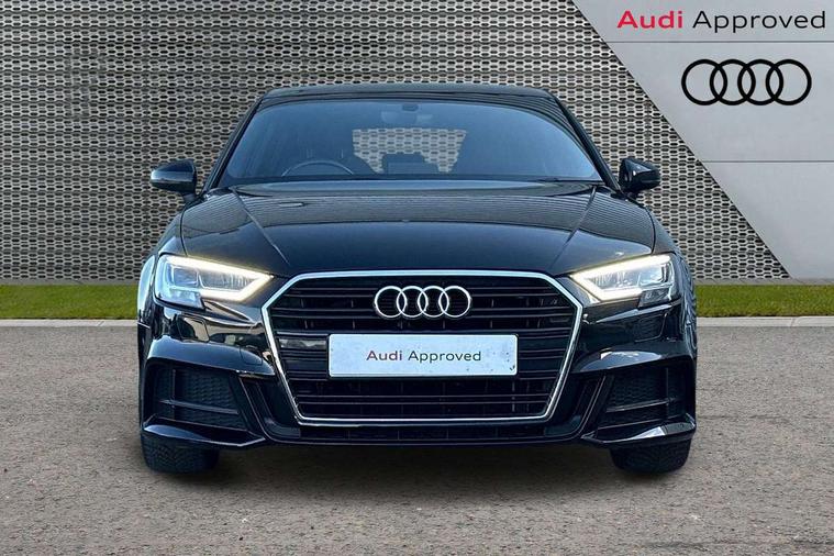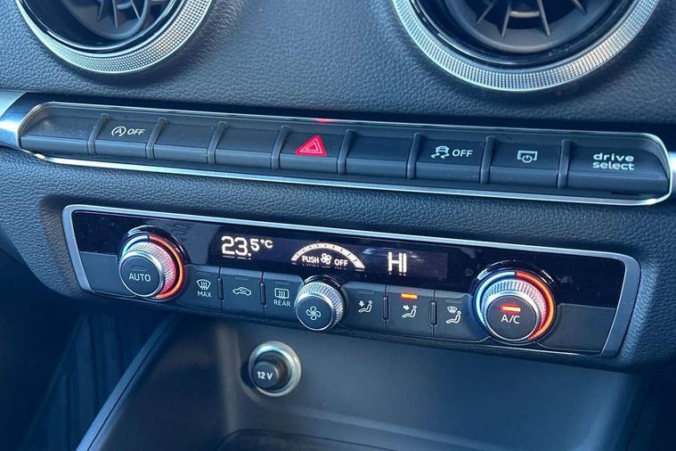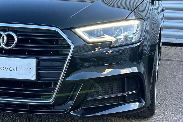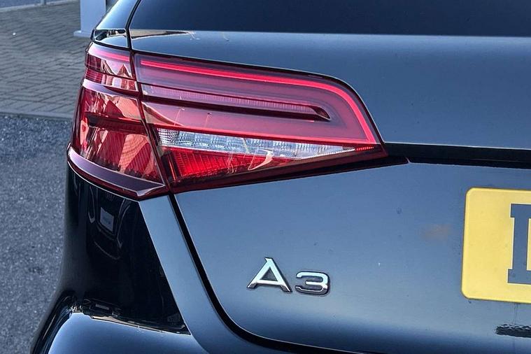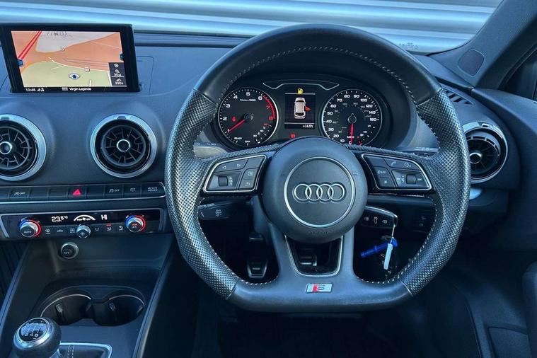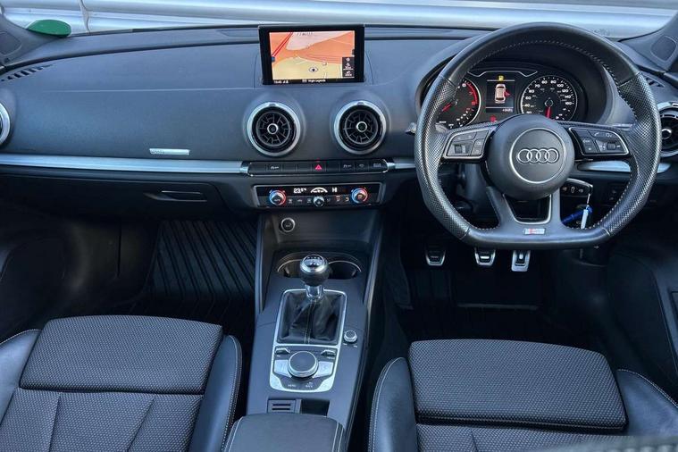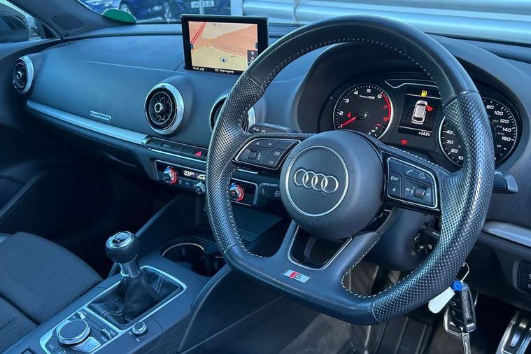 Audi drive select, Audi smartphone interface, Automatic start/stop system, Colour driver's information system display, Electro - mechanical power assisted steering, Mobile telephone preparation - bluetooth interface, SD card based MMI navigation, Service interval indicator, Speed limit display, Voice control system, Voice recognition for navigation system, Sports suspension, 2 USB interfaces and Aux-In jack, Audi music interface, CD player, DAB Digital radio, MMI radio plus with 7" colour MMI screen and MMI controller, Online entertainment, Aluminium window trim, Auto dimming interior rear view mirror, Body colour door mirrors, Chrome exhaust tailpipes, Electric front windows, Electric rear windows, Electrically adjustable and heated door mirrors with integrated LED side indicators, Heated windscreen washer jets, LED daytime running lights, Light and rain sensors, Matt black radiator grille, Rear wiper, S line badges on front wings, S Line body styling with front & rear bumpers and side skirts, radiator grille and rear diffuser insert, roof spoiler, Sport specific side air inlet grille and diffuser insert, 3 adjustable rear headrests, 3 spoke flat bottomed multi-function leather sport steering wheel, 60/40 split folding rear seat, Adjustable front centre armrest, Black cloth headlining, Dual zone electronic climate control, Front and rear interior lights with delay, Front/rear floor mats, Height and reach adjustable steering wheel, Illuminated door sill trims with S logo, Isofix child seat preparation for front passenger/outer rear seats inc passenger airbag deactivation including top tether, Lashing point in luggage compartment, Manual height adjustable front seats, Stainless steel pedals, Storage compartments in doors side trims, centre console and under front drivers seat, LED interior light pack - A3/RS3, Non smoking pack - A3, Storage and luggage pack - A3/RS3, 3 point seatbelts on all seats, ABS/EBD, Active bonnet, Active front headrests, Airbags - front driver/passenger, front & rear side, curtain, drivers knee, ASR, EDL, Electromechanical parking brake, ESC - Electronic Stability Control + traction control, Front passenger airbag deactivation, Hill hold assist, Manual rear child locks, Multi-Collision braking, Seatbelt warning, Tyre pressure warning, Warning triangle and first aid kit, Anti theft alarm, Anti-theft wheel bolts, Remote control central locking, Thatcham category 1 alarm + immobiliser, Aluminium air vent surrounds, Aluminium trim elements, Matt brushed aluminium inlays, Tool kit, Tyre repair kit,