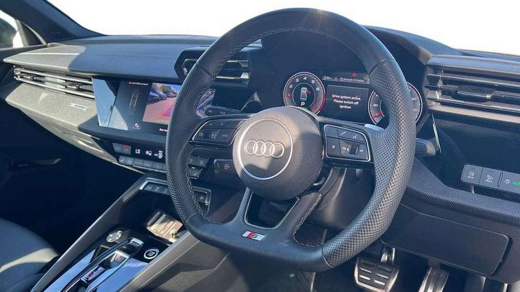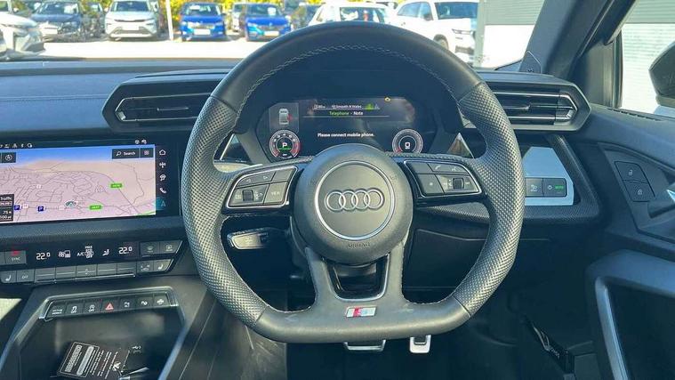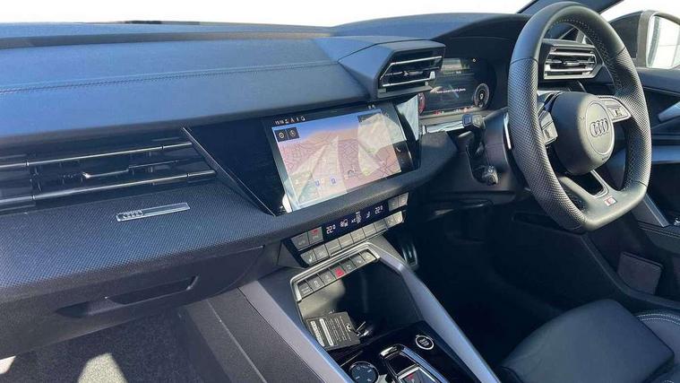 Adjustable speed limiter, Audi drive select, Audi smartphone interface with app store includes wireless Apple carplay, Android auto and Amazon alexa integration, Audi virtual cockpit plus - 12.3" full HD resolution dynamic digital instrument cluster, Automatic start/stop system with recuperation, Bluetooth interface, Camera based traffic sign recognition, Collision avoidance assistant, Cruise control, Distraction and Fatigue warning, e-Call (emergency call), Electromechanical power speed sensitive steering, Lane departure warning system, MMI Navigation Plus with high resolution 10.1" colour touch screen display, Park Assist with parking system Plus, Service indicator, Trip computer, Voice control system with natural language interaction, Sports suspension, Audi Phonebox light with wireless charging, Audi sound system - 10 loudspeakers including centre loudspeaker and subwoofer, DAB Digital radio, USB ports with charging function in the rear, Acoustic glass windscreen, Anthracite grey Audi rings (front and rear), Audi beam uses LEDs to project the Audi logo onto the ground as you exit your A3, Auto dimming frameless rear view mirror, Black accents front and rear bumpers, Black accents in the area of the Audi single frame grille, Black accents window trims strips, Electrically adjustable/heated/folding/auto dimming door mirrors with integrated LED indications + kerb view function for passenger side, Exterior model badging, Front electric windows, Heat insulating glass windscreen, Illuminated door sills with aluminium inserts at the front with S logo, LED 3rd brake light, LED daytime running lights, LED headlights with LED rear lights and dynamic rear indicators, Light and rain sensors, Privacy glass - dark tinted rear window, rear door and side windows, Rear boot, Rear electric windows, Rear side wing doors, 12V socket and storage compartment in front centre console, 3 seat bench in 2nd row, 3 spoke flat bottomed leather multifunction sport steering wheel with gear shift paddles, 3-zone deluxe automatic air conditioning, 4 way electrically adjustable lumbar support for driver and front passenger, 40/20/40 split folding rear seat bench, Black cloth headlining, Front and rear centre armrest in artificial leather, Front and rear centre armrest in artificial leather with contrasting stitching on armrests and instrument panel, Front and rear headrests, Front/rear floor mats, Heated front seats, Height and reach adjustable steering wheel, Manual boot compartment lid, Manually adjustable front seats, Rear cup holders, S badging on the steering wheel, Seat side bolsters, Single front passenger seat, Stainless steel pedals and front footrest in black, Twin leather upholstery with front sports seats S embossed logo, Aluminium interior elements pack - A3, Multi-coloured LED interior lighting package - A3 Black Edition, 3x3 point rear seat belts, Driver and front passenger airbag with passenger airbag deactivation, Electronic Stabilisation Control (ESC) including ABS, ASR and EDL, First aid kit with warning triangle and 2 safety vests, Front side airbags with head airbags and interaction airbag, Hill hold assist, Pre-sense front with pedestrian and cyclist detection, Seatbelt monitoring, Tyre pressure loss indicator, Anti theft alarm, Anti-theft wheel bolts, Electronically operated child locks, Immobiliser, Remote central locking with safelock, Inlays in black Impressum woven textile,