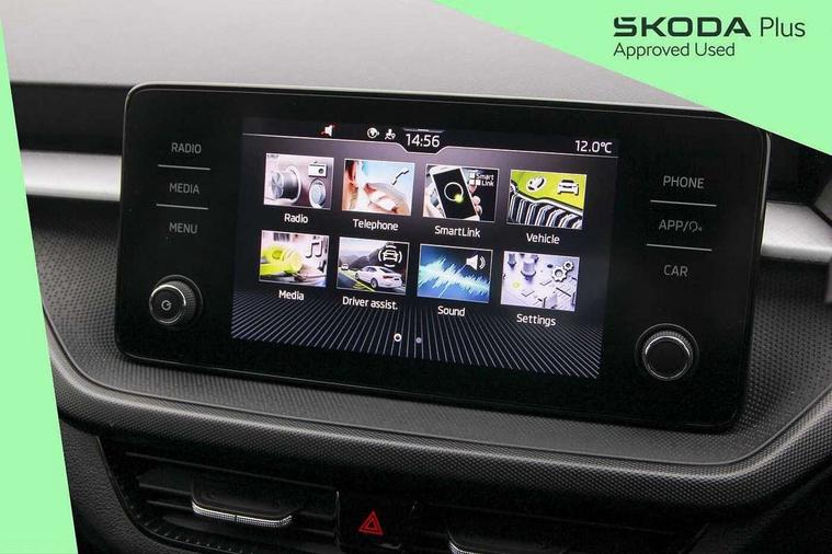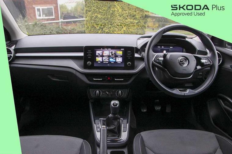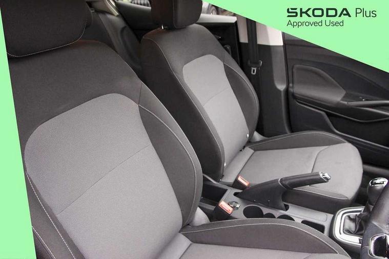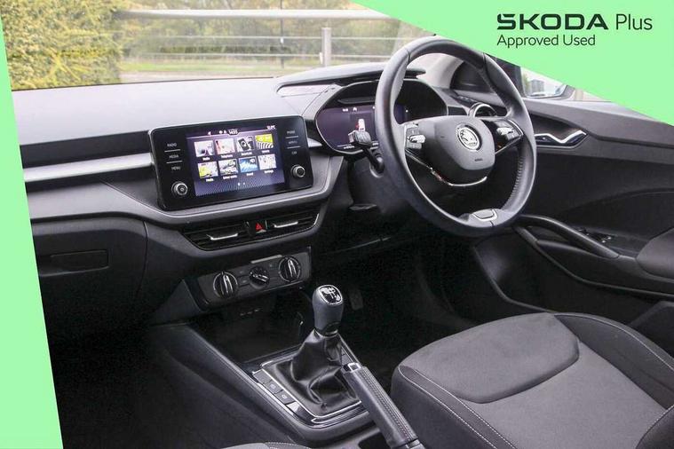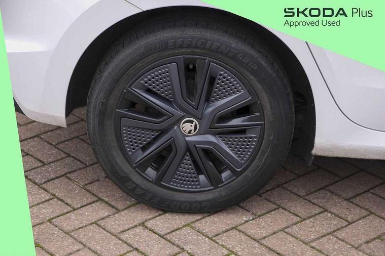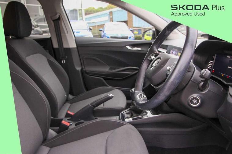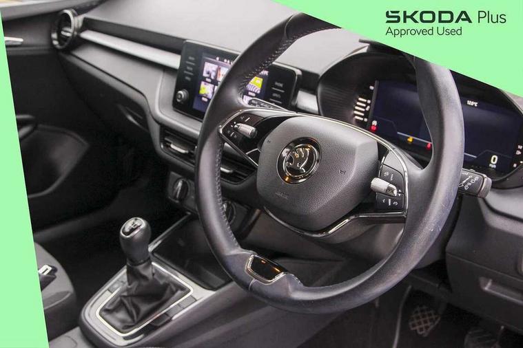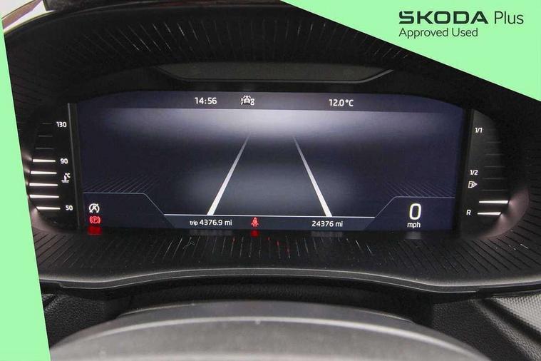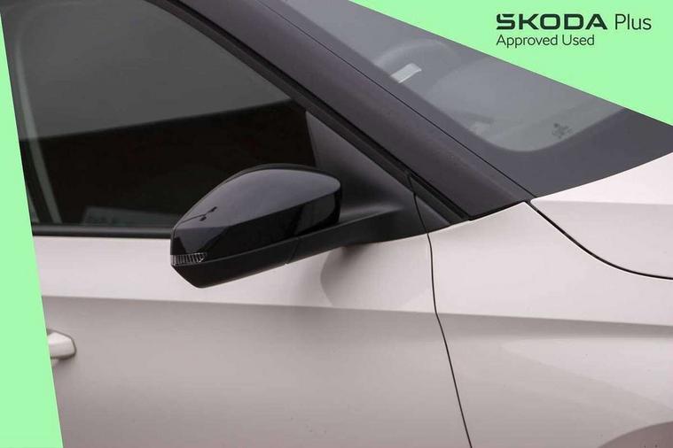 Bluetooth connection, Driver alert system - DAS, Electromechanical power steering, Exterior temperature gauge, Lane assist including road edge detection, Service interval indicator, Virtual cockpit with 10.25" colour display, 2x USB-C in the front (for data transmission and charging), 6 Speakers (4 in front and 2 in rear), Auxiliary socket for external MP3 player, Bolero radio with 8" colour display, DAB digital radio reception, Basic rear lights, Body coloured bumpers, Dimming rear view mirror with black frame, Door mirror integrated indicators, Electrically adjustable and heated door mirrors, Electrically adjustable front windows with function auto up/down, Front window wiper intermittent control, Headlight range control - Automatic, Ice scraper in fuel cap, LED daytime running lights with coming and leaving home feature, Mechanical adjustable rear windows, Privacy glass, Rear LED fog light, Rear side wing doors, Rear window wiper with washing nozzles, Roof colour door mirrors, Roof mounted spoiler, SKODA tailgate lettering in chrome, Third brake light, 3 rear headrests, Backrest split and folding, Central console with fixed cup holder and storage box, Chrome handbrake release button, Fabric upholstery, Gearshift knob/handle in leather, Grain satin black interior door handles, Hand brake lever handle in leather, Height adjustable front headrests, Height adjustable steering wheel, ISOFIX and TopTether anchorage points to the outer rear seats, ISOFIX and TopTether on the front passenger seat, Luggage compartment lighting, Pollen filter, Rear seat bench unsplit, Single front passenger seat, Storm grey headlining, Sun visors with mirror and airbag label on passenger side, Ticket holder, Umbrella in drivers door, 3-point height adjustable front seats belts with pretensioner and force limiter, Automatic warning lights in case of crash, Driver and passengers airbag with switch off function, e-Call+, ESC including ABS, MSR, ASR, EDS, HBA and XDS, Front and rear seat belt warning, FRONT ASSIST (AEB City and AEB Inter Urban), Front side airbags, Head airbags, One tone horn, Pedestrian protection, Three rear 3-points safety seat belts with pretensioner and force limiter including stop function for outer rear seat belts, Tyre pressure monitoring system, Anti-theft alarm system including immobiliser, interior monitoring, backup horn, and towing protection, Anodized cross line upper decorative trim, Colour Edition air vents, Grain satin black central console cover, Grain satin black lower decorative trim, Satin black door and side trim panel in front, Anti-theft wheel bolts protection, Super-low rolling resistance tyres,