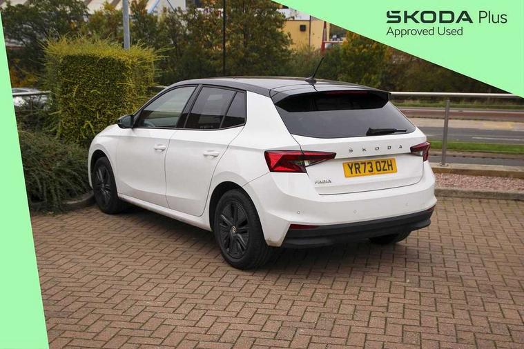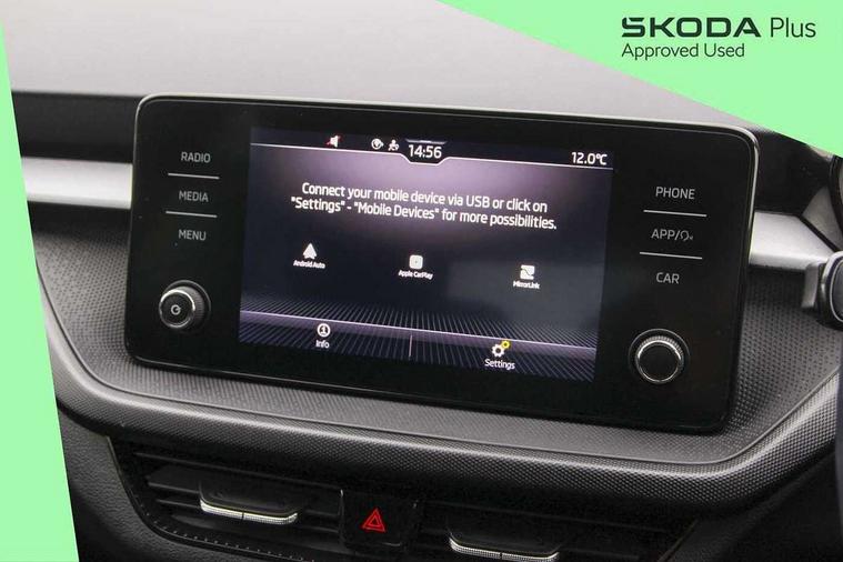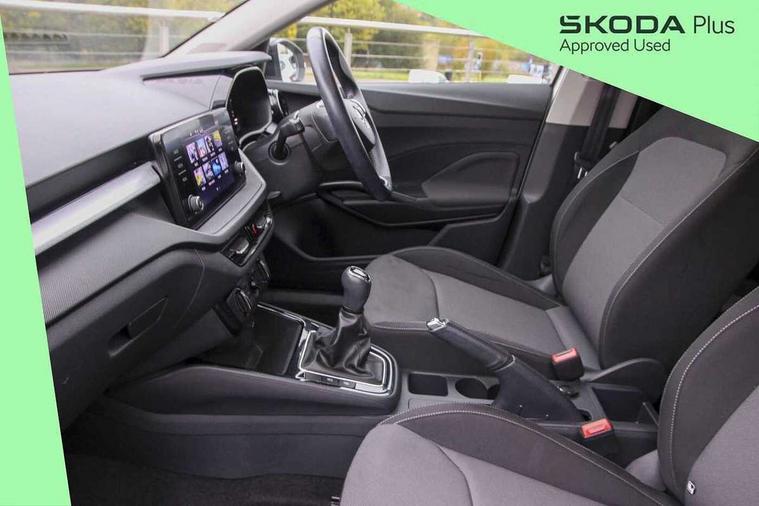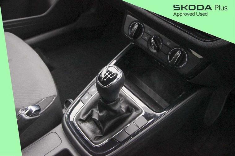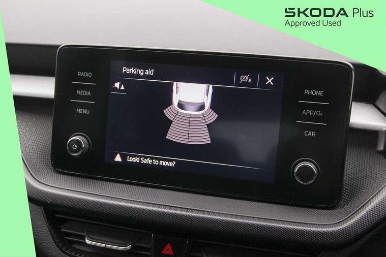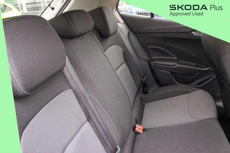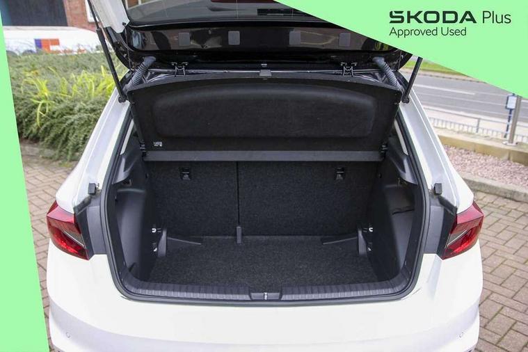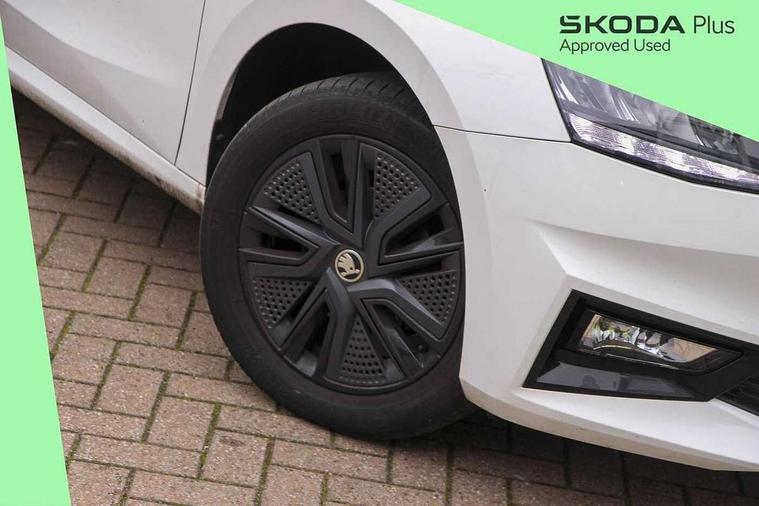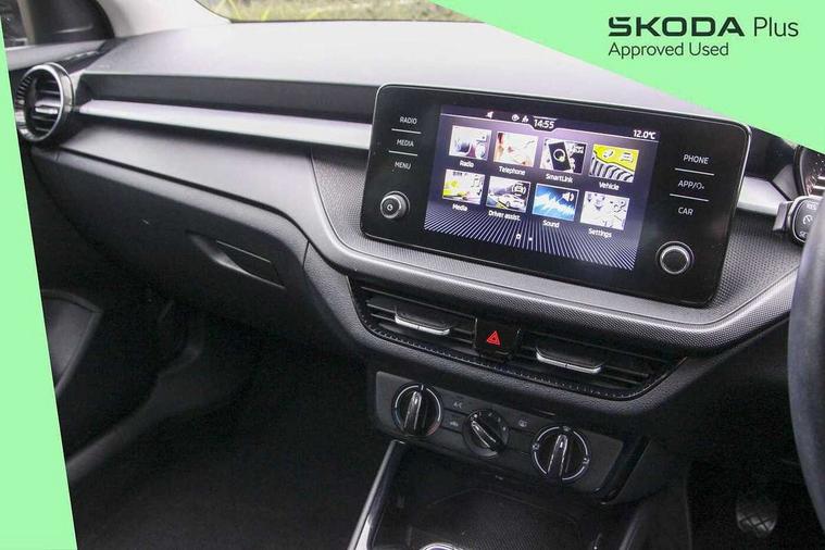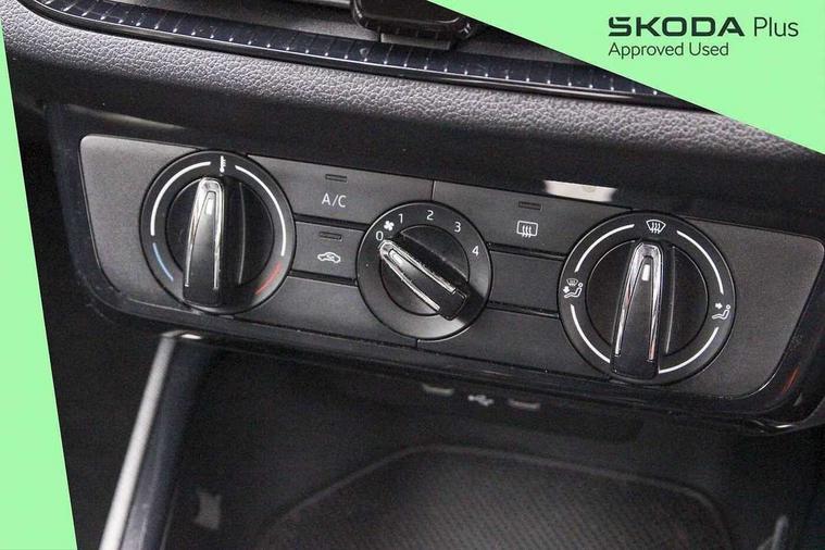 Bluetooth connection, Driver alert system - DAS, Electromechanical power steering, Exterior temperature gauge, Lane assist including road edge detection, Service interval indicator, Virtual cockpit with 10.25" colour display, 2x USB-C in the front (for data transmission and charging), 6 Speakers (4 in front and 2 in rear), Auxiliary socket for external MP3 player, Bolero radio with 8" colour display, DAB digital radio reception, Basic rear lights, Body coloured bumpers, Dimming rear view mirror with black frame, Door mirror integrated indicators, Electrically adjustable and heated door mirrors, Electrically adjustable front windows with function auto up/down, Front window wiper intermittent control, Headlight range control - Automatic, Ice scraper in fuel cap, LED daytime running lights with coming and leaving home feature, Mechanical adjustable rear windows, Privacy glass, Rear LED fog light, Rear side wing doors, Rear window wiper with washing nozzles, Roof colour door mirrors, Roof mounted spoiler, SKODA tailgate lettering in chrome, Third brake light, 3 rear headrests, Backrest split and folding, Central console with fixed cup holder and storage box, Chrome handbrake release button, Fabric upholstery, Gearshift knob/handle in leather, Grain satin black interior door handles, Hand brake lever handle in leather, Height adjustable front headrests, Height adjustable steering wheel, ISOFIX and TopTether anchorage points to the outer rear seats, ISOFIX and TopTether on the front passenger seat, Luggage compartment lighting, Pollen filter, Rear seat bench unsplit, Single front passenger seat, Storm grey headlining, Sun visors with mirror and airbag label on passenger side, Ticket holder, Umbrella in drivers door, 3-point height adjustable front seats belts with pretensioner and force limiter, Automatic warning lights in case of crash, Driver and passengers airbag with switch off function, e-Call+, ESC including ABS, MSR, ASR, EDS, HBA and XDS, Front and rear seat belt warning, FRONT ASSIST (AEB City and AEB Inter Urban), Front side airbags, Head airbags, One tone horn, Pedestrian protection, Three rear 3-points safety seat belts with pretensioner and force limiter including stop function for outer rear seat belts, Tyre pressure monitoring system, Anti-theft alarm system including immobiliser, interior monitoring, backup horn, and towing protection, Anodized cross line upper decorative trim, Colour Edition air vents, Grain satin black central console cover, Grain satin black lower decorative trim, Satin black door and side trim panel in front, Anti-theft wheel bolts protection, Super-low rolling resistance tyres,