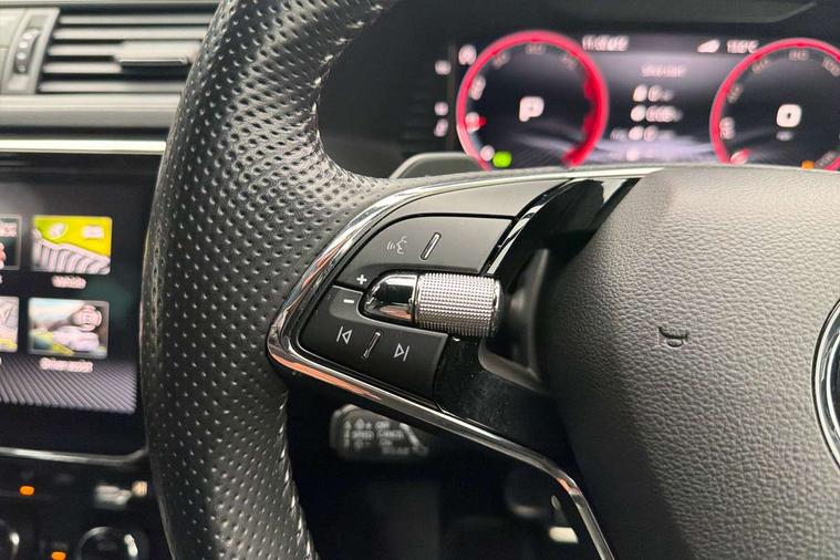 Bluetooth system, CareConnect and Emergency Call, Columbus HDD satellite 3D map navigation with 9.2" colour touch screen, web radio, integrated Wi-Fi, Driver fatigue sensor, Front assist with pedestrian protection, Progressive dynamic steering, Stop/start engine system and energy recovery, Virtual cockpit, Voice control system, Wireless smartlink apple carplay, SmartLink+ android auto, XDS+, 2 USB ports, Bolero radio with 8" touchscreen display, DAB Digital radio, 3rd brake light, Aero front windscreen wipers with intermittent function, Auto dimming rear view mirror, Black rear badge, Body colour door handles, Cornering front fog lights, Electrically adjustable heated and folding door mirrors with memory function, Front and rear electric windows, Full matrix LED headlights with AFS LED DRL integrated with headlight washer LED rear lights(High function), dynamic indicators and lighting animation, Gloss black exterior door mirrors with sports styling including front grill, side strip and window surrounds, Gloss black grille surround with gloss black rib elements, Gloss black roof rails, Gloss black strip between rear lights, Light assistant (coming/leaving home/tunnel light), Privacy glass, Rain sensor, Rear exhaust diffuser styling elements, Rear side wing doors, Rear windscreen wiper, Sport Line badging, 12v power point in centre console, 3 seat bench in 2nd row, Black roof headlining, Black textile floor mats, Carbon optic interior elements, Electric auxiliary air heater, Front and rear footwell illumination, Front armrest with storage box, Height adjustable front and rear head restraints, Ice scraper, Illuminated and cooled glovebox, Interior lights with control switches, Isofix child seat fittings on outer rear seats, LED front and rear reading lights, Microsuede/leather upholstery with silver diamond stitching sports seats, One umbrella compartments in driver door with one umbrella in drivers door, Overhead glasses storage compartment, Rear centre armrest with cupholders, Single front passenger seat, Split folding rear seats, Storage compartment with cover in luggage compartment side panels, Ticket holder on A Pillar, LED package plus - Superb, 3 rear seatbelts, 7 airbags - Front, front side, curtain, driver's knee airbag with front passenger deactivation switch, Driver and passenger seatbelts with warning light, Electronic parking brake, ESC including ABS, EBV, MSR, ASR, EDS, HBA, DSR, RBS, CBC, multi-collision brake (MKB) and Auto hold, Hill start assist, Power operated child lock in rear doors, Tyre pressure monitor, Alarm with interior monitoring tilt sensor and back up horn, Electronic engine immobiliser, Keyless entry and start/stop, Remote central locking with SAFE system, Third remote key,
