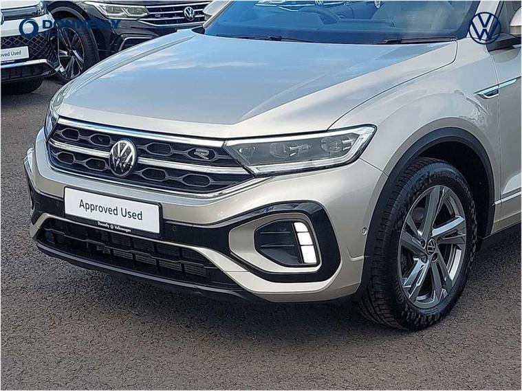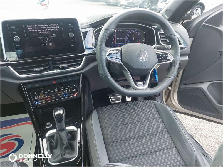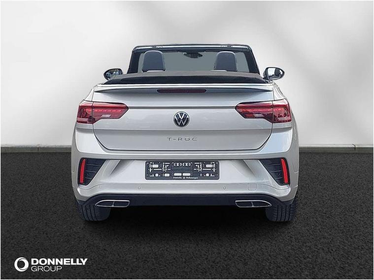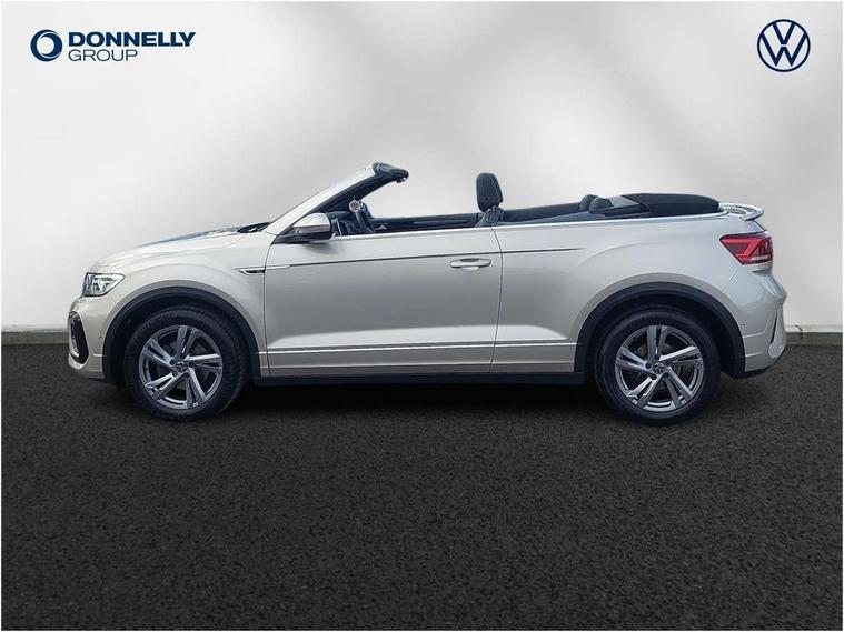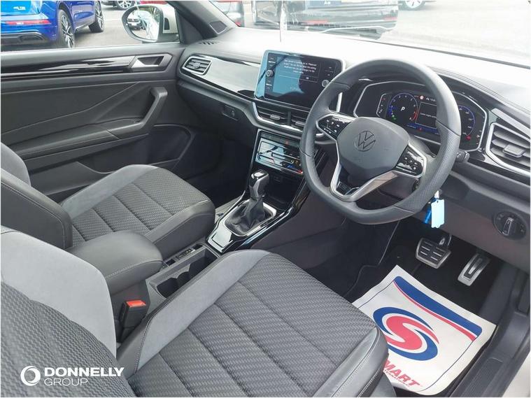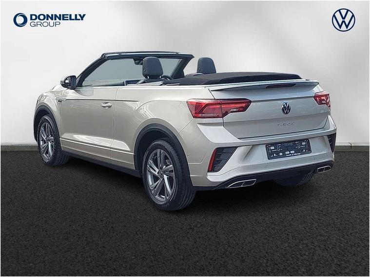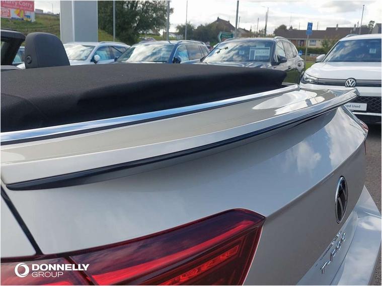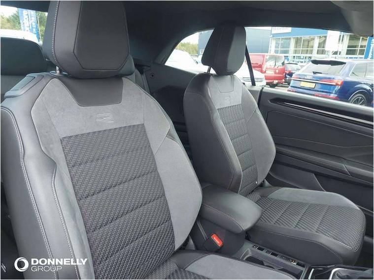 Adaptive cruise control and speed limiter, Bluetooth mobile phone interface, Brake pad wear indicator, Car information display, Digital Cockpit Pro with 10.25" Display, Driver alert system with fatigue detection, Driver tips and journey analysis, Emergency call service, Modified key software - reduce switch off time for key status change to Long no motion, Multifunction computer with visual gear change recommendation for fuel consumption, Multifunction front facing camera, Park assist including front and rear parking sensors, Speedo and rev counter, electronic odometer, trip, service interval display and exterior temperature gauge, Start/stop system with brake energy recovery, Tailgate/trunk lid release from outside, Warning sound and light for front seatbelts unfastened, Diversity antenna for FM reception, Music playback - MP3, WMA and AAC files, SMS functionality - read, compose and send SMS messages using touch-screen display, Title and cover art display, USB-C Interface and USB charging socket, We Connect and We Connect Plus functionality, Ambient lighting with logo projection, Auto dimming interior rear view mirror, Automatic hazard lights activation under emergency braking, Automatic headlight control with LED separate daytime running lights with coming/leaving home function, Black roof, Body colour door handles, Body colour rear spoiler, Chrome effect left and right trapezoid exhaust tailpipe fascia surround, Chrome trim on upper and lower radiator grille, Dark red rear combination lamps in LED technology, Dusk sensor, Exterior mirrors aspherical on driver side, convex on front passenger side, Heat insulating glass windscreen, High level 3rd brake light, LED performance matrix headlights - dynamic range control, dynamic cornering light and turn signal + light mode for rain/fog/snow, LED rear number plate lights, Power operated canvas convertible top, Power windows with comfort operation and circuit breaker, R-Line design body coloured bumpers, Rain sensor, Rear boot, Rear exhaust tailpipe, Rear fog light on one side and reversing lights on both sides, Remote electrically foldable door mirrors, puddle lights and reverse activated passenger door mirror, Volkswagen roundel, Windscreen wiper with intermittent wipe light, Without exterior ambient lighting, 12V socket in centre console storage area, 2 LED front reading lights, 2 seat bench in 2nd row, 50:50 Split folding rear seat backrests with fixed rear seat bench, Air care climatronic air conditoning system with active combination filter and 2-zone temperature control, Black door lower parts with chrome trim, Chrome plated surround to light, mirror and window switch, Door and side trim panel with leatherette insert, Easy entry backrest release, Front and rear carpet mats with black stitching, Front centre armrest, Front cupholders x 2, Front door pockets, Front seat back storage pockets, Front sports comfort seats with manual height adjustment, Heated leather wrapped multi function sports steering wheel with tiptronic, Height/reach adjust steering wheel, Inserts of front seats and outer rear seats in ArtVelours titan black, Instrument lighting, white adjustable panel illumination, Interior light delay, Interior light in footwell, Interior lighting with switch off delay and contact switches on all doors, Interior white ambient lighting and surround lighting, Isofix child seat preparation, Lockable glove compartment with light, Luggage compartment lighting, Power adjustable lumbar support in front, Rear head restraints, Single front passenger seat, Stainless steel pedals, Sun visors with illuminated vanity mirrors, Unique R Line door sill protectors, Driver assistance package - T-Roc cabriolet DSG, 2 x 3-point seatbelts/outer rear seats with ECE label, Driver and front passenger airbag with front passenger airbag deactivation, Driver and front passenger safety-optimised head restraints, Drivers seatbelt reminder, Electronic parking brake, Electronic Stability Control (ESC) including ABS, ASR and EDL, Front and rear disc brakes, Front assist with autonomous emergency braking, Pedestrian monitoring, Predictive pedestrian protection, Rigid safety cell with front and rear crumple zones, Side airbag/thorax airbag system, for front passengers, Single tone horn, Three point height adjust front seatbelts + pretensioners, Tyre pressure loss indicator, Volkswagen roadside assistance, Anti-theft alarm system with interior protection and central locking system with SAFELOCK, radio remote control and 2 remote control folding keys, Electronic engine immobiliser, Trims for alloy wheels,