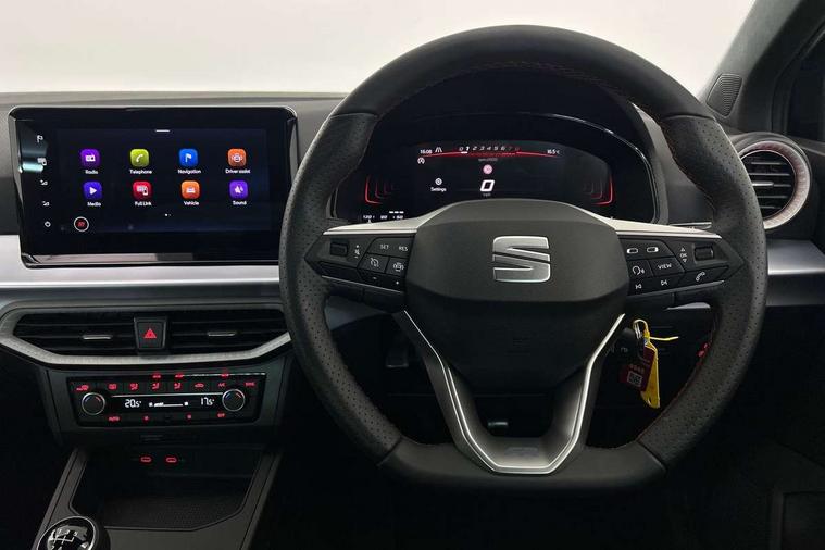 'Lights On' Reminder warning buzzer, 8" Digital cockpit, 9.2" touchscreen navigation system with type C USB socket, Voice control and DAB/AM/FM radio, Auto start and stop system, Bluetooth audio streaming with handsfree system, Digital clock, E-call, Full link smartphone integration with mirror link, wireless apple carplay, Google android auto + USB Type C cable for apple and android devices, Lane assist, Low fuel warning light, Outside temperature gauge, Power Steering, Rear parking sensor, Seat connect plus with safety, service, remote and online, SEAT logo boot release, Speed limiter, Traffic sign recognition, Trip computer, Sports suspension, 6 speakers, Auxiliary input socket, Radio/MP3 player, SD card slot, Steering wheel mounted controls, Anti theft roof antenna, Auto dimming rear view mirror, Automatic rain sensing wipers, Black door mirror caps, Body colour bumpers, Body colour door handles, Brilliant black window surrounds, Dark tinted rear windows, Electric adjustable/heated/folding door mirrors, Electric front windows, Electric headlight adjustment, Electric rear windows, Front/rear fog lights, FULL LED automatic headlights with dynamic headlight range control, coming and leaving home, LED daytime running lights, LED 3rd brake light, LED tail lights, Rear roof spoiler with FR twin exhausts, Rear side wing doors, Rear wiper, 3 seat bench in 2nd row, 60/40 split folding rear seat, Ambient interior lighting, Chrome detailing and black headlining, Cloth upholstery, Dual zone climate control with combination filter, Front courtesy lights, Front cupholders x 2, Front reading lights, Gear shift indicator, Glovebox, Height adjustable front and rear headrests (five), Height adjustable front seats, Height/reach adjust steering wheel, Illuminated air vent surrounds, Illuminated boot, Instrument lighting with brightness control, Isofix, Leather multifunction flat bottomed sports steering wheel, Passenger sunvisor, Single front passenger seat, Sports seats, Sunvisors with mirror and driver side card holder, Safety and driving pack (S) - Ibiza, 3 point seatbelts on all 3 rear seats, ABS, Active front headrests, Child locks on rear doors, Electronic stability control, Energy recovery system, Front driver and passenger side airbags with curtain airbag and front passenger airbag deactivation, Hill hold control, Multi-Collision braking, Seat belt reminder for front and rear seats, Tiredness recognition system, Tyre pressure monitoring system, Locking wheel bolts, Perimeter alarm and interior monitoring with backup horn and tow away protection, Remote central locking + deadlocks, 17" Alloy wheels in Brilliant silver,