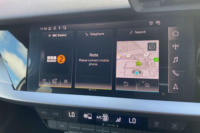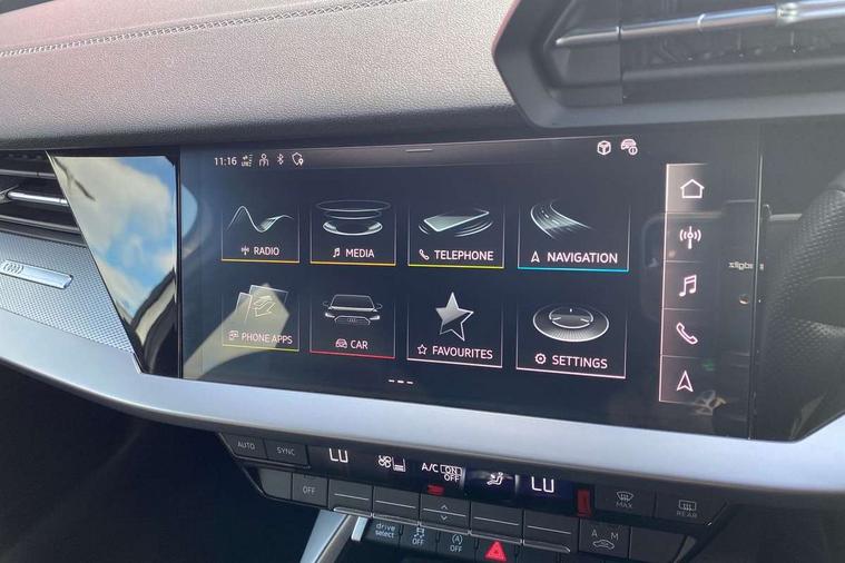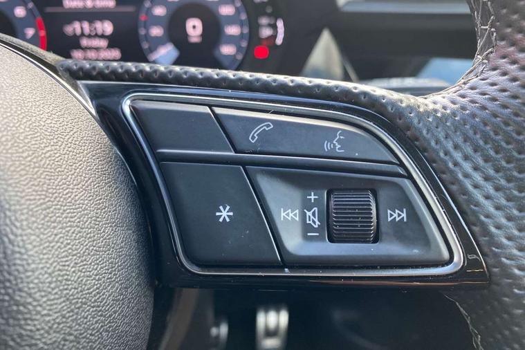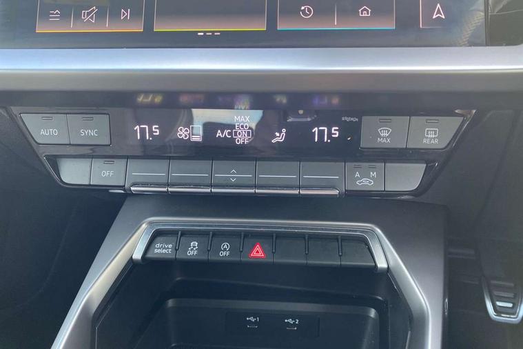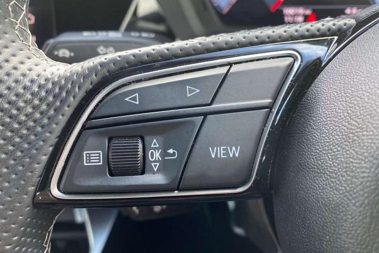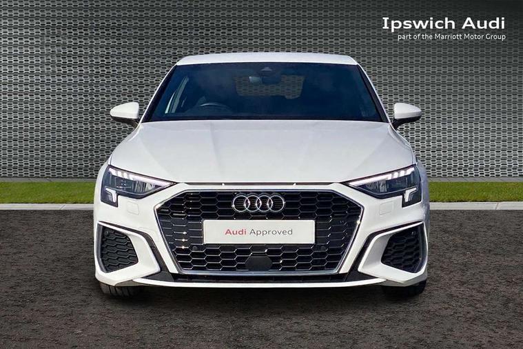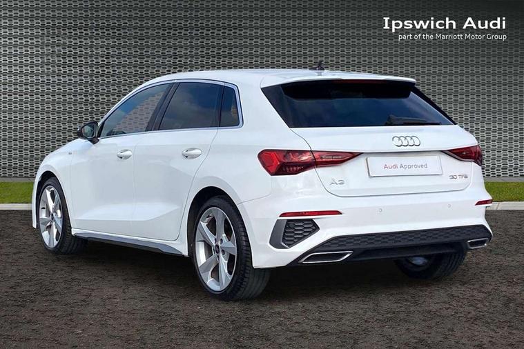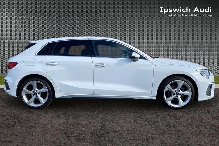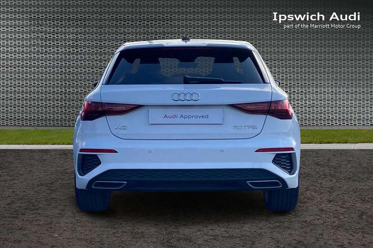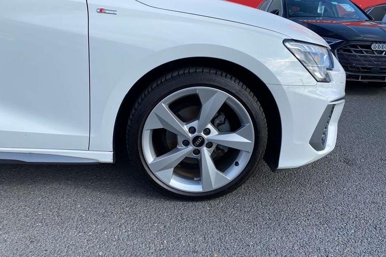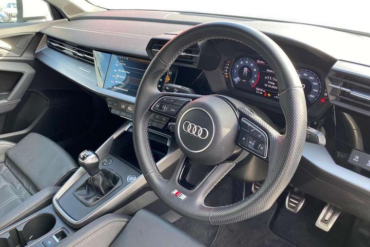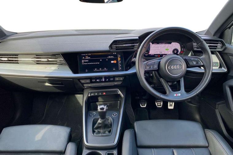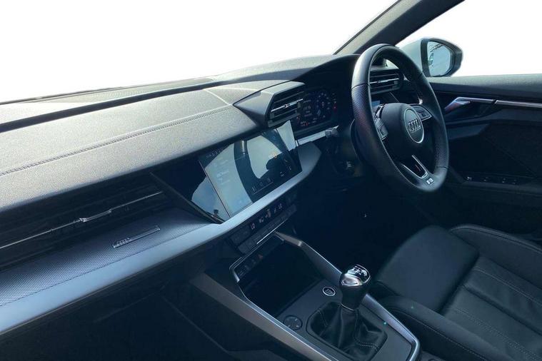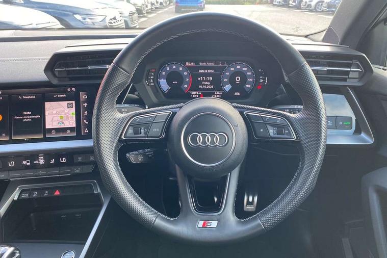 Audi drive select (Auto, Comfort, Dynamic and Individual), Audi smartphone interface, Audi Virtual Cockpit - 10.25" digital and colour instrument cluster, Automatic start/stop system with recuperation, Bluetooth interface, Camera based traffic sign recognition, Collision avoidance assistant, Cruise control, e-Call (emergency call), Electromechanical power speed sensitive steering, Lane departure warning system, MMI Navigation Plus with high resolution 10.1" colour touch screen display, Rear parking sensors, Service indicator, Trip computer, Voice control system with natural language interaction, Sports suspension, 2xUSB-C connection with data and charging functions, 6 passive loudspeakers, DAB Digital radio, 3rd brake light, Acoustic glass windscreen, Aluminium window trim, Auto dimming frameless rear view mirror, Body colour exterior mirrors, Electrically adjustable/heated/folding/auto dimming door mirrors with integrated LED indications + kerb view function for passenger side, Front electric windows, Illuminated aluminium inserts front door sills with S logo, LED daytime running lights, LED headlights with LED rear lights and dynamic rear indicators, Light and rain sensors, Privacy glass - dark tinted rear window, rear door and side windows, Rear electric windows, Rear side air outlets in grained matt black, Rear side wing doors, Rear wiper, S line bumpers, S roof spoiler, 12V socket and storage compartment in front centre console, 3 seat bench in 2nd row, 3 spoke leather multifunction steering wheel, 4 way electrically adjustable lumbar support for driver and front passenger, 60/40 split folding rear seat bench, Black cloth headlining, Dual zone electronic climate control, Front and rear centre armrest in leather, Front and rear headrests, Front/rear floor mats, Height and reach adjustable steering wheel, Interior lighting - glove compartment light and right hand side, Luggage compartment floor covering, Manual boot compartment lid, Manually adjustable front seats, Seat side bolsters, Single front passenger seat, Stainless steel pedals and front footrest in black, Twin leather upholstery with front sports seats S embossed logo, Aluminium interior elements pack - A3 Sportback, LED interior lighting pack - A3 Sportback, S line styling pack - A3 Sportback, 3x3 point rear seat belts, Driver and front passenger airbag with passenger airbag deactivation, Electronic Stabilisation Control (ESC) including ABS, ASR and EDL, First aid kit with warning triangle and 2 safety vests, Front side airbags with head airbags and interaction airbag, Pre-sense front with pedestrian and cyclist detection, Seatbelt monitoring, Tyre pressure loss indicator, Anti theft alarm, Anti-theft wheel bolts, Electronically operated child lock, Immobiliser, Remote control central locking, Dark spectrum aluminium inlays, accent surfaces in the dashboard and centre console in platinum grey silk effect paint finish,