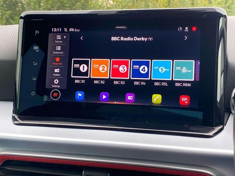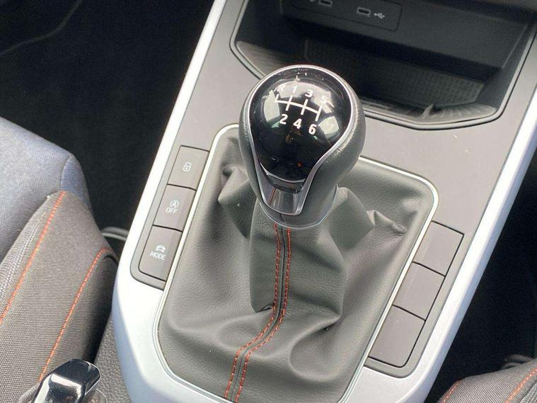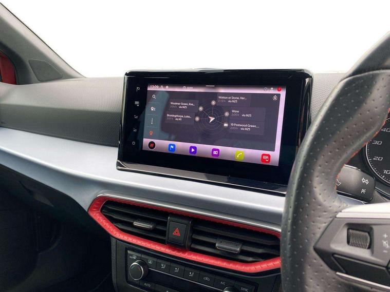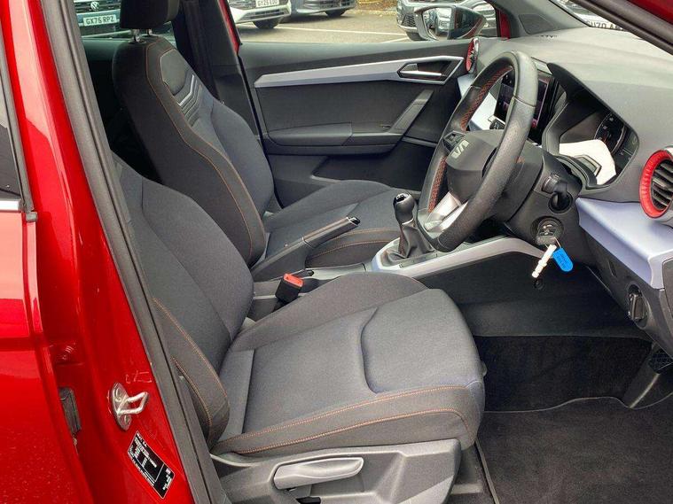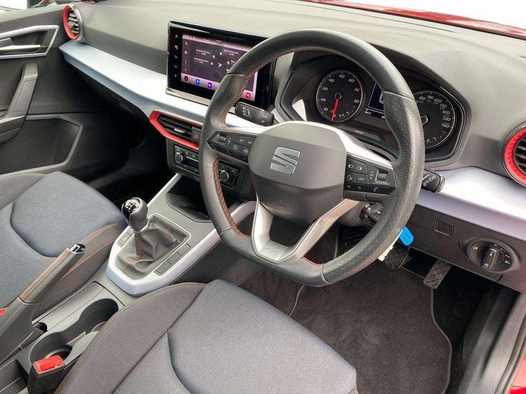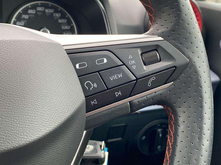 'Lights On' Reminder warning buzzer, 8" Digital cockpit, Digital clock, E-call, Electric speed sensitive power steering, Full Link Smartphone Integration with Mirror Link, Apple Car Play, Google Android Auto with USB Type C cable for Apple and Android compatibility, Lane keeping system, Low fuel warning light, Outside temperature display, Rear parking sensor, RPM counter, Seat connect with safety, service, remote and online, SEAT Drive profile - Four different models normal-sport-eco-individual, steering response, throttle response, Trip computer, Bluetooth interface for hands free and audio streaming, DAB digital radio and AM/FM radio, Steering wheel mounted audio controls, Anti theft roof antenna, Auto dimming interior rear view mirror, Automatic activation of hazard warning lights, Body coloured bumpers, Body coloured door handle inserts, Chrome roof rails and window surrounds, Dark tinted rear windows, Electric front/rear windows, Electrically adjustable, heated and folding door mirrors, Front fog lights with cornering function and rear fog light, FULL LED automatic headlights with dynamic headlight range control, coming and leaving home, LED daytime running lights, LED rear tail lights and licence plate lights, Protective side mouldings, Rain sensing wipers, Rear side wing doors, Rear spoiler, Rear window wash/wipe, Roof colour door mirrors, Third brake light, Twin exhaust pipe styling hidden exhaust pipe, Visible VIN plate, Windshield wiper with intermittent control and potentiometer, 2 cupholders, 3 seat bench in 2nd row, 60/40 split folding rear seat, Aircare filter, Black interior roof, Cloth upholstery, Double boot floor, Driver sunvisor with covered mirror + card holder, Dual zone climate control, Front courtesy light with 2x front and 2x rear reading lights, Front sport seats, Gear shift indicator, Height adjustable front seats, Height/reach adjustable steering column, Illuminated boot, Instrument lighting with brightness control, Interior ambient lighting, Interior light in footwell, central console and door panel, ISOFIX points in outer rear seats with top tether anchorage points, Passenger sunvisor with vanity mirror, Perforated flat bottomed leather steering wheel/gear knob/handbrake with red stitching and FR logo, Single front passenger seat, Two front and three rear height adjustable headrests, Connectivity pack plus - Arona, Interior chrome pack - Arona, 3 point seatbelts on all rear seats, ABS, Active front headrests, Child locks on rear doors, Driver and front passenger airbags with front passenger airbag de activation, front side and curtain airbags, Electronic stability control, Emergency Brake Assist (EBA) and front assist, Front and rear seatbelt reminder, Hill hold control, Multi-Collision braking, Tiredness recognition system, Traction control, Tyre pressure monitoring system, Alarm with back-up horn, Electronic engine immobiliser, Locking wheel bolts, Remote central locking + deadlocks, Tow away protection, Titan black dashboard, 17" Dynamic alloy wheels,