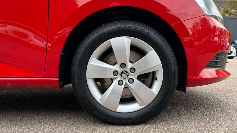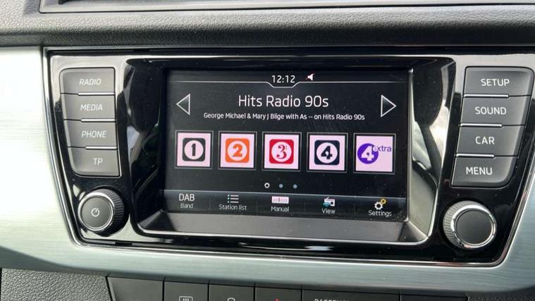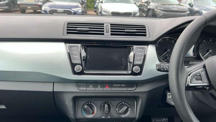 Bluetooth system, Exterior temperature gauge, Front assistant collision mitigation, Multi function trip computer, PAS, Service interval indicator, SmartLink, 6.5" touchscreen, Auxiliary socket for external MP3 player, Bolero Radio, DAB Digital radio, SD card slot, USB interface, Body colour bumpers, Body colour door handles, Chrome grille surround, Electric front windows, Electrically adjustable and heated door mirrors, Heated rear window, Height adjustable headlamps, Intermittent rear wash/wipe, Tinted rear windows, Tinted windscreen, 1.5L bottle holder in front door panels, 2 height adjustable rear headrests, 60/40 split folding rear seat, Boot stowage box, Cargo area storage tray, Driver + passenger vanity mirrors, Folding grab handles, Front reading lights, Height adjustable driver's seat, Height adjustable front headrests, Height adjustable passenger seat, Height/reach adjust steering wheel, Interior light with delay, Leather gearshift, Leather handbrake, Lower glovebox cover, Luggage load hooks, Parcel shelf, Pollen filter, Rear courtesy light, Rear storage trays, Ticket holder, Two rear outer seat isofix location points, Umbrella under front passenger seat, Arkamys surround sound pack - Fabia, Chrome Pack - Fabia, 3x3 point rear seatbelts, ABS, Curtain airbags, Driver and passenger airbags, Driver and passenger side airbags, EDS, ESC with ASR, Front seatbelt pretensioners, Hill hold control, Hydraulic Brake Assist (HBA), Motor Slip Regulation (MSR) - Engine Drag Torque Control, Passenger airbag deactivate switch, Seatbelt warning, Tyre pressure monitor, Alarm with interior monitoring, Immobiliser, Locking wheel bolts, Remote central locking,