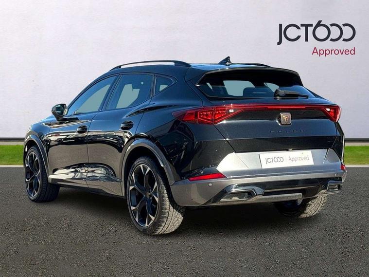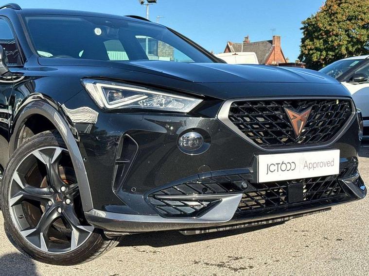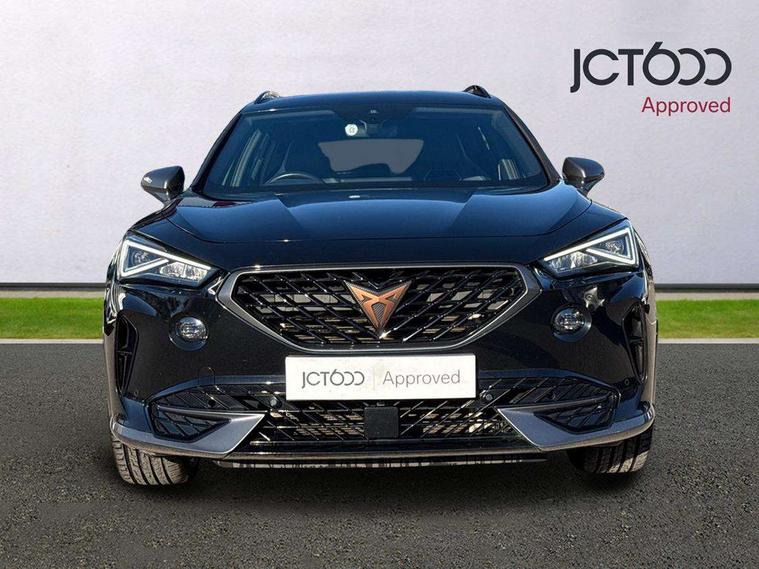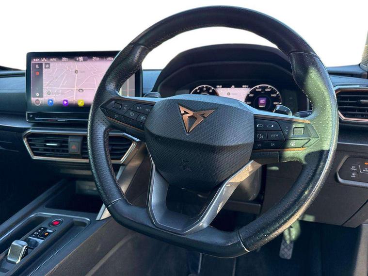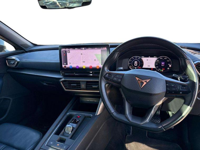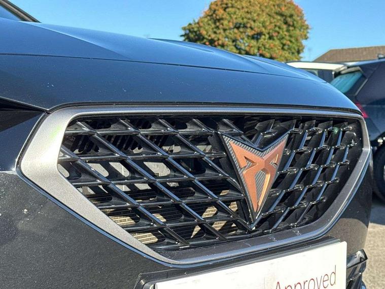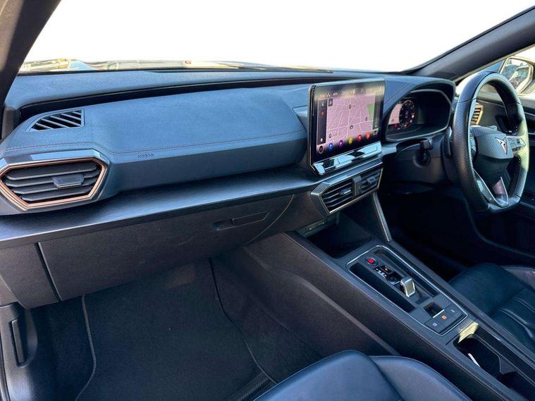 Digital cockpit and configurable dashboard, Driver alert system, Driving profile selection, Forward collision warning with automatic braking, Park assist (inc front/rear parking sensors), PAS, Predictive adaptive cruise control with speed limiter, Rear view camera, RPM, trip computer, outside temp gauge, instrument light brightness, low fuel warning light, lights on reminder, gearshift indicator, Service interval indicator, Start/stop system with regenerative braking, Wireless apple carplay, Wireless phone charger, Electronic locking differential and dynamic traction support, Standard suspension, 2 front and 2 rear USB type C sockets, Auxiliary input socket, DAB radio, Auto dimming rear view mirror, Body colour door handles, Body coloured bumpers, Dark grey wing mirror, Daytime running light with automatic headlight control and coming home feature, Dynamic headlight range control, Electric front/rear windows, Electrically adjustable, heated and folding door mirrors, Front fog lamps with cornering function, Gloss black roof rails and window surrounds, LED Headlights, LED Taillights with dynamic indicator, Rain sensing wipers, Rear diffuser with black simulated exhaust pipes, Rear wash/wipe, Tinted rear windows, Welcome lights, 12v power supply in centre console, 12V socket, 12v socket in loadspace, 2 front and 2 rear reading lights, 230V socket, 60/40 split rear bench seat with armrest and mechanical seat release, Black headlining, Dust/pollen filter, Front and rear head restraints, Front centre armrest, Heated steering wheel, Height/reach adjust steering wheel, Illuminated interior front door sills, Illuminated sunvisor with mirror, Interior ambient lighting, Isofix, Leather multi function steering wheel with gear shift paddles, Luggage tie-down hooks, Three zone climate control with control panel in rear, Variable luggage/load compartment floor, Wraparound lighting, Genuine Nappa leather Pack - Cupra, Navigation system pack - Formentor, 3 point seatbelts on all rear seats, ABS, Brake control system - ESC and brake booster, Child proof door locks, Driver and front passenger airbags with front passenger airbag de-activation, Electronic parking brake, Front and rear disc brakes, Front side curtain airbags, Hill hold control, Seat belt reminder for front and rear seats, Tyre pressure monitoring system, Anti theft alarm system, Keyless entry and start system (KESSY), Locking wheel bolts, Copper and aluminium interior detailing, 19" Exclusive machined sport matt black and silver alloy wheels with 94W tyres,