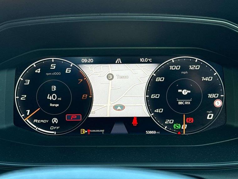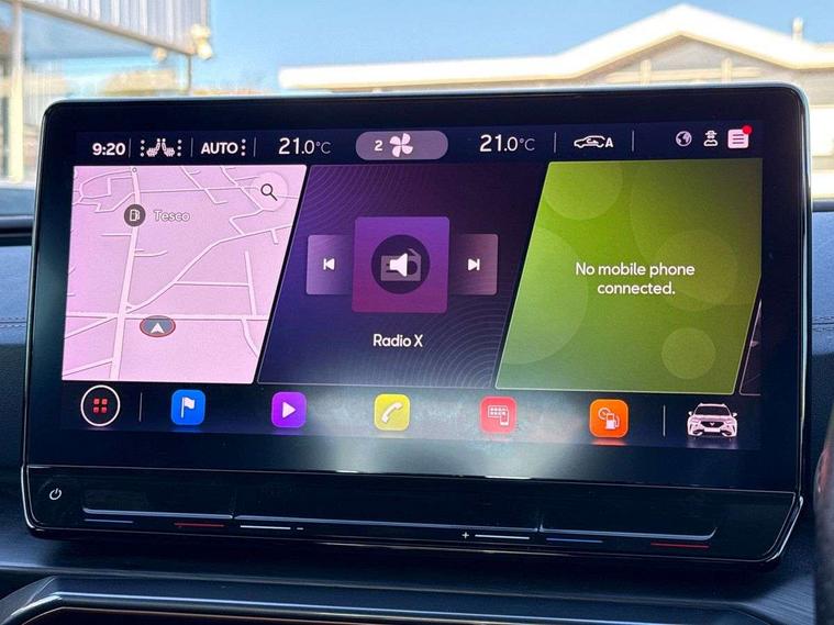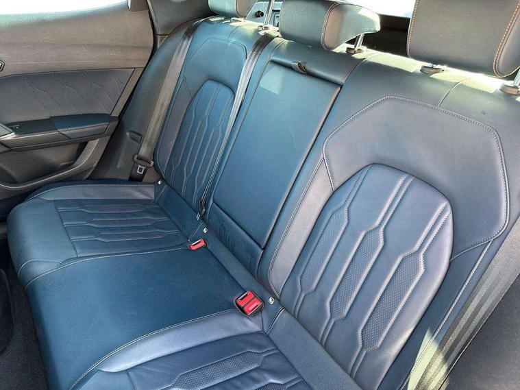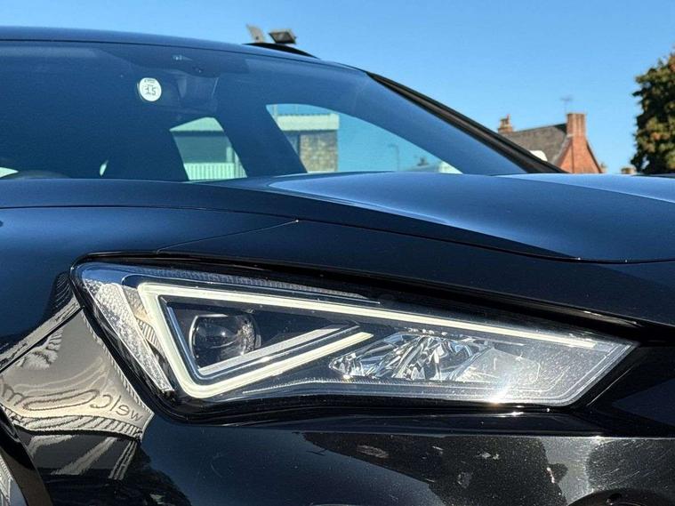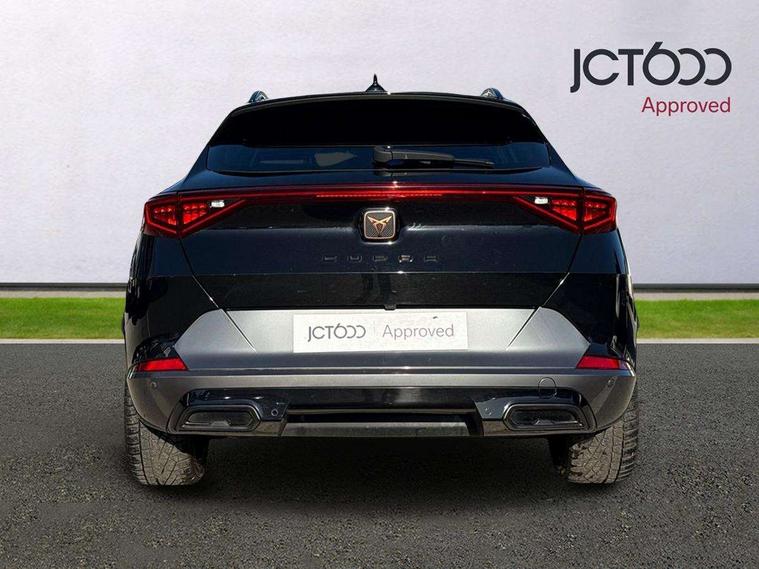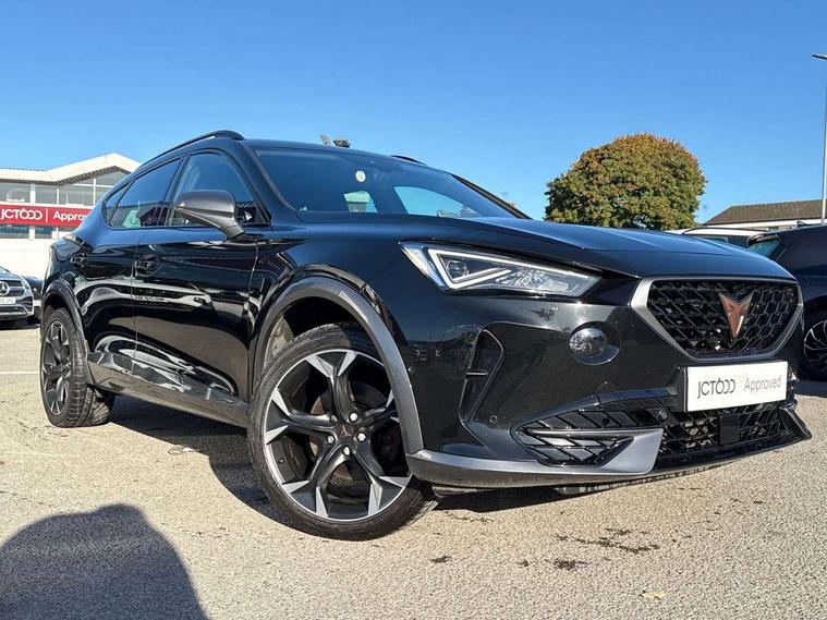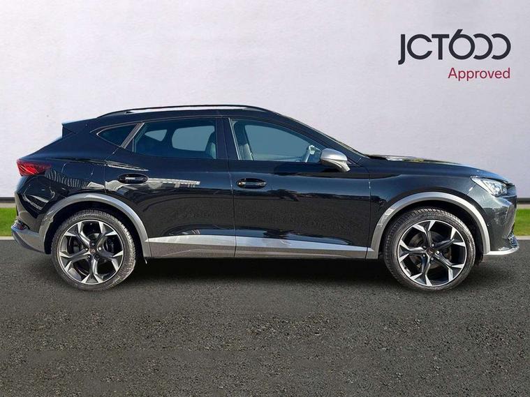Digital cockpit and configurable dashboard, Driver alert system, Driving profile selection, Forward collision warning with automatic braking, Park assist (inc front/rear parking sensors), PAS, Predictive adaptive cruise control with speed limiter, Rear view camera, RPM, trip computer, outside temp gauge, instrument light brightness, low fuel warning light, lights on reminder, gearshift indicator, Service interval indicator, Start/stop system with regenerative braking, Wireless apple carplay, Wireless phone charger, Electronic locking differential and dynamic traction support, Standard suspension, 2 front and 2 rear USB type C sockets, Auxiliary input socket, DAB radio, Auto dimming rear view mirror, Body colour door handles, Body coloured bumpers, Dark grey wing mirror, Daytime running light with automatic headlight control and coming home feature, Dynamic headlight range control, Electric front/rear windows, Electrically adjustable, heated and folding door mirrors, Front fog lamps with cornering function, Gloss black roof rails and window surrounds, LED Headlights, LED Taillights with dynamic indicator, Rain sensing wipers, Rear diffuser with black simulated exhaust pipes, Rear wash/wipe, Tinted rear windows, Welcome lights, 12v power supply in centre console, 12V socket, 12v socket in loadspace, 2 front and 2 rear reading lights, 230V socket, 60/40 split rear bench seat with armrest and mechanical seat release, Black headlining, Dust/pollen filter, Front and rear head restraints, Front centre armrest, Heated steering wheel, Height/reach adjust steering wheel, Illuminated interior front door sills, Illuminated sunvisor with mirror, Interior ambient lighting, Isofix, Leather multi function steering wheel with gear shift paddles, Luggage tie-down hooks, Three zone climate control with control panel in rear, Variable luggage/load compartment floor, Wraparound lighting, Genuine Nappa leather Pack - Cupra, Navigation system pack - Formentor, 3 point seatbelts on all rear seats, ABS, Brake control system - ESC and brake booster, Child proof door locks, Driver and front passenger airbags with front passenger airbag de-activation, Electronic parking brake, Front and rear disc brakes, Front side curtain airbags, Hill hold control, Seat belt reminder for front and rear seats, Tyre pressure monitoring system, Anti theft alarm system, Keyless entry and start system (KESSY), Locking wheel bolts, Copper and aluminium interior detailing, 19" Exclusive machined sport matt black and silver alloy wheels with 94W tyres,