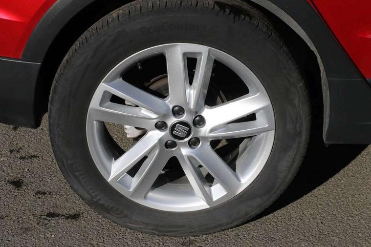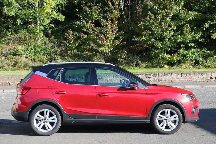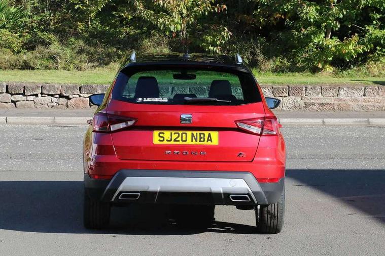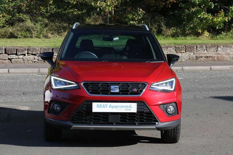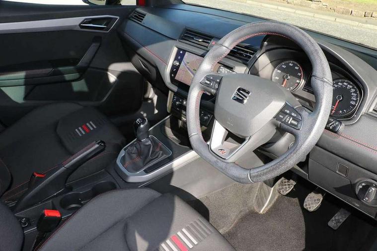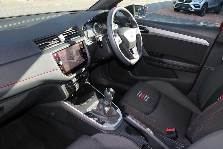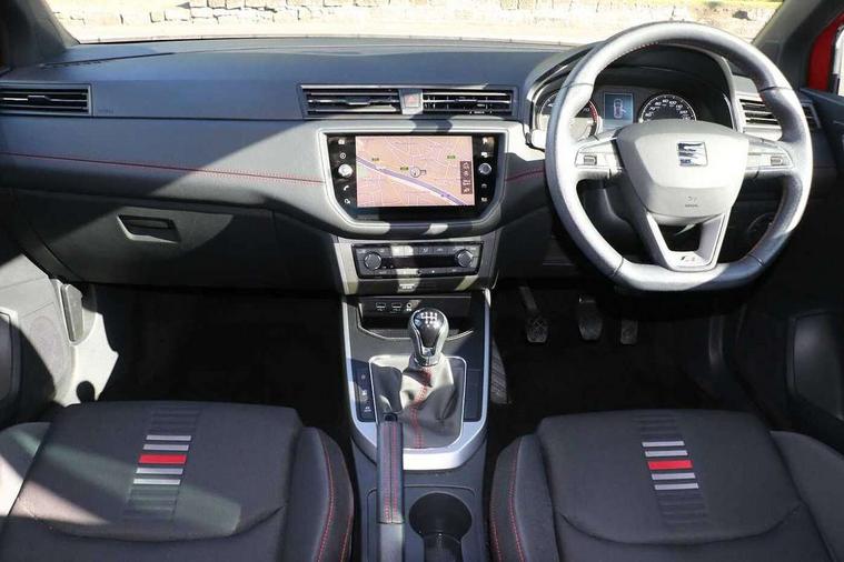 'Lights On' Reminder warning buzzer, Cruise control, Digital clock, Electric speed sensitive power steering, Full Link Smartphone Integration with Mirror Link, Apple Car Play, Google Android Auto with USB Type C cable for Apple and Android compatibility, Low fuel warning light, Outside temperature display, Rear parking sensor, RPM counter, SEAT Drive profile - Four different models normal-sport-eco-individual, steering response, throttle response, Trip computer, Sports suspension, 6 speakers, Bluetooth interface for hands free and audio streaming, DAB digital radio and AM/FM radio, Steering wheel mounted audio controls, Anti theft roof antenna, Auto dimming interior rear view mirror, Automatic activation of hazard warning lights, Automatic headlights, Body coloured bumpers, Body coloured door handle inserts, Chrome front grille frame, Chrome roof rails, Chrome window trim, Coming/leaving home lighting function, Dark tinted rear windows, Electric front/rear windows with one touch/auto up/down, Electrically adjustable, heated and folding door mirrors, Full LED headlights dipped and mainbeam + front and rear fog lights, LED daytime running lights, LED rear tail lights and licence plate lights, Rain sensing wipers, Rear window wash/wipe, Roof colour door mirrors, Twin exhaust pipe styling hidden exhaust pipe, Visible VIN plate, Windshield wiper with intermittent control and potentiometer, 2 cupholders, 60/40 split folding rear seat, Black interior roof, Double boot floor, Driver sunvisor with covered mirror + card holder, Dual zone climate control, Dust/pollen filter, Front courtesy light with front reading lights, Front sport seats, Gear shift indicator, Height adjustable front seats, Height/reach adjustable steering column, Illuminated boot, Instrument lighting with brightness control, Interior footwell lighting, ISOFIX points in outer rear seats with top tether anchorage points, Multi-colour ambient interior lighting, Nora cloth upholstery, Passenger sunvisor with vanity mirror, Perforated flat bottomed leather steering wheel/gear knob/handbrake with red stitching and FR logo, Two front and three rear height adjustable headrests, Connectivity pack plus - Arona, Interior chrome pack - Arona, 3 point seatbelts on all rear seats, ABS, Active front headrests, Child locks on rear doors, Driver and front passenger airbags with front passenger airbag de activation, front side and curtain airbags, Electronic stability control, Emergency Brake Assist (EBA) and front assist, Front and rear seatbelt reminder, Hill hold control, Multi-Collision braking, Tiredness recognition system, Traction control, Tyre pressure monitoring system, 2 folding remote keys with window open/close function, Alarm with back-up horn, Electronic engine immobiliser, Locking wheel bolts, Remote central locking + deadlocks, Tow away protection, Interior chrome line trim, Leatherette dashboard, 17" Dynamic alloy wheels,