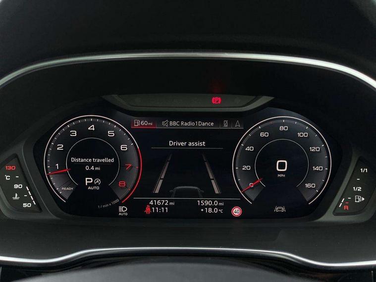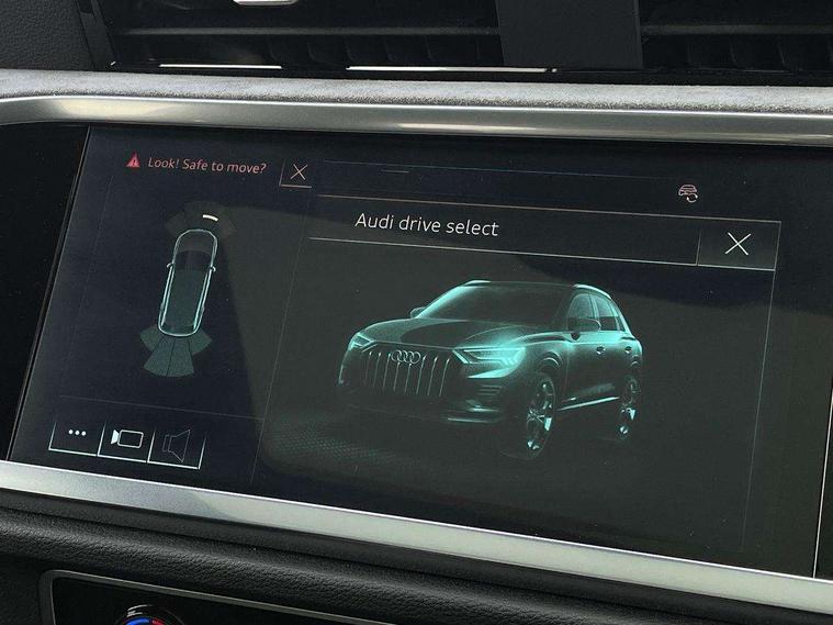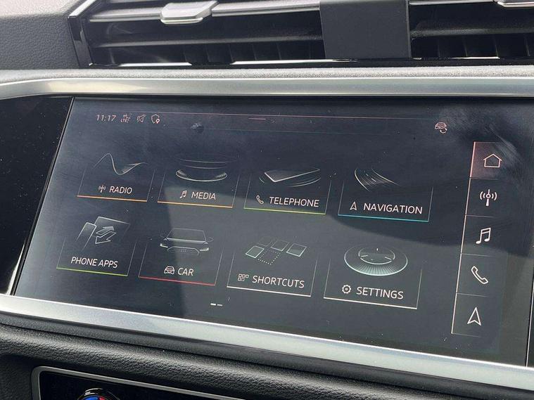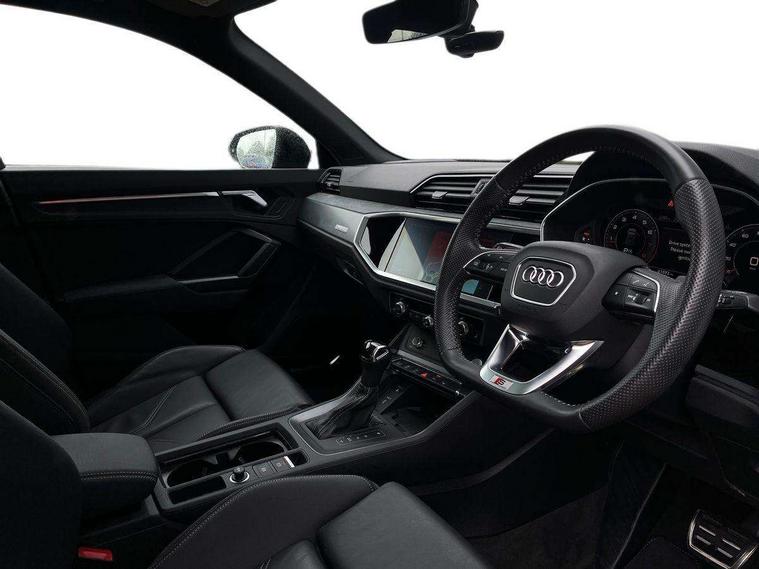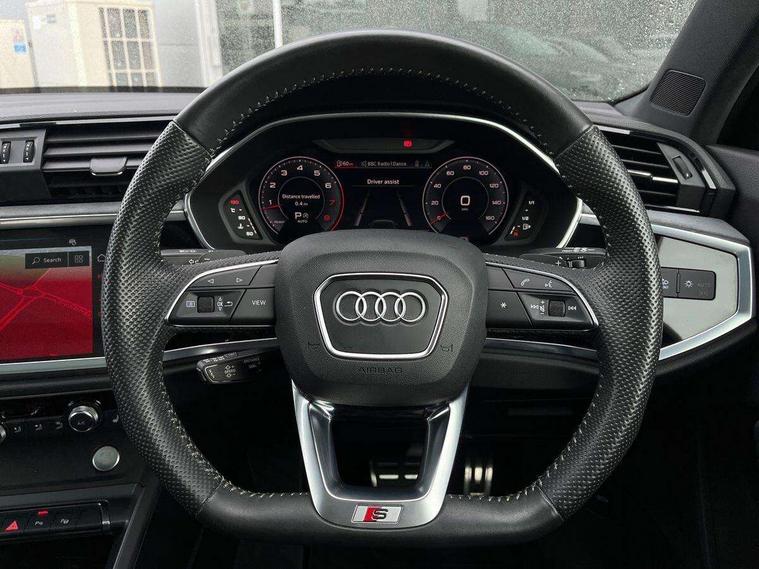 360 degree parking camera, Audi connect safety and service (e-call), Audi drive select, Audi lane departure warning, Audi parking system plus with front and rear sensors, Audi phone box with wireless charging, Audi side assist, Audi smartphone interface, Audi virtual cockpit plus, Bluetooth interface, MMI navigation plus with MMI touch, Power opening/closing tailgate, Progressive steering, Rear cross traffic alert, Service interval indicator, Stop/start system, Voice control system, Adaptive suspension with damping control, 1 x USB type C and 1 USB type A charging points, Bang & Olufsen 3D Premium Sound System, DAB digital radio module, Acoustic windscreen, Auto dimming and folding door mirrors, Auto dimming rear view mirror, Black roof rails, Contrast bumpers in Manhattan grey paint finish, Diffuser in matt Platinum grey, Electrically adjustable and heated door mirrors with integrated LED side indicators, Front and rear electric windows, Front fog lights, Front side air inlets in matt platinum grey, Front spoiler blade in matt platinum grey, Front spoiler in matt selenite silver, Grille vertical bars in aluminium silver/Matt, Headlight washers, High gloss black finish B and C pillars, Matrix LED headlights with LED rear lights and dynamic front and rear indicator, Panoramic opening glass sunroof, Privacy glass, Rain and light sensors, Rear diffuser strip in selenite silver, S line bumpers in contrasting Manhattan grey, 12V socket in rear centre console, 3 spoke flat bottomed high multi-function leather sport steering wheel with gearshift paddles, 4 way electric lumbar support for driver and front passenger, 40:20:40 split folding rear bench seat, Adjustable rear seat bench/backrest with centre armrest and cupholder, Aluminium door sill trims, Black cloth headlining, Dual zone climate control, Electrically adjustable front seats, Front and rear black floor mats with contrast stitching in rock grey, Front and rear headrests, Front centre armrest with storage compartment and angle adjustment, Heated front seats, ISOFIX child seat mounting and Top Tether with front passenger airbag deactivation, Perforated leather gearknob, Stainless steel luggage compartment sill finisher, Stainless steel pedals, Black styling pack - Q3, Driver Assistance Pack - Q3, Multi coloured extended ambient interior lighting pack - Q3, Non smoking pack - Q3, 3x3 point rear seatbelts, 6 airbags - Driver, front passenger, curtain and side windows, Audi pre-sense front with pedestrain and cyclist recognition, Electrically operated child locks on rear doors, Electromechanical parking brake, Electronic stabilisation control including ABS, ASR and EDL, Hill hold assist, Pre sense basic, Seatbelt monitoring, Tyre pressure warning, Warning triangle and first aid kit, Advanced key, Anti theft alarm, Anti theft wheel bolts, Remote central locking, Dark matt brushed aluminium inlay, MMI touch colour display in gloss black with aluminium surround, Tool kit, Tyre repair kit,