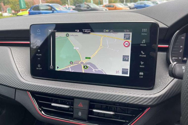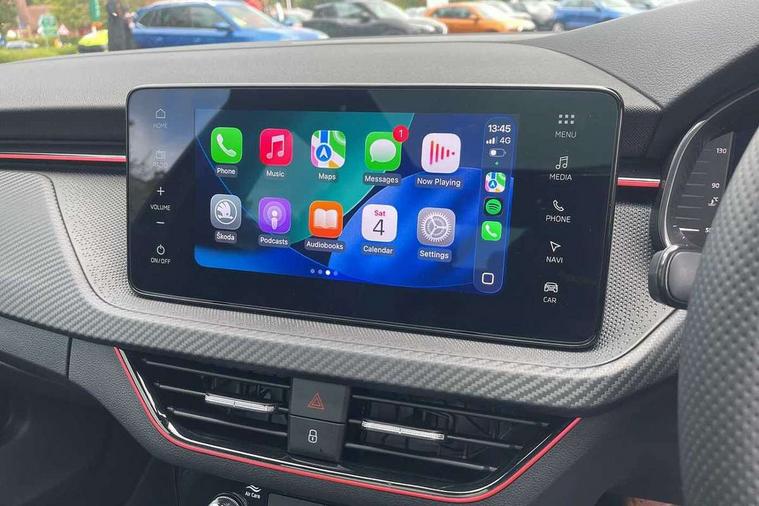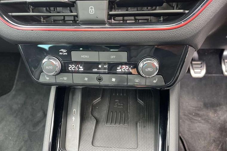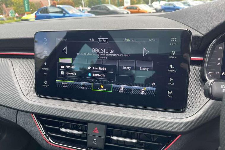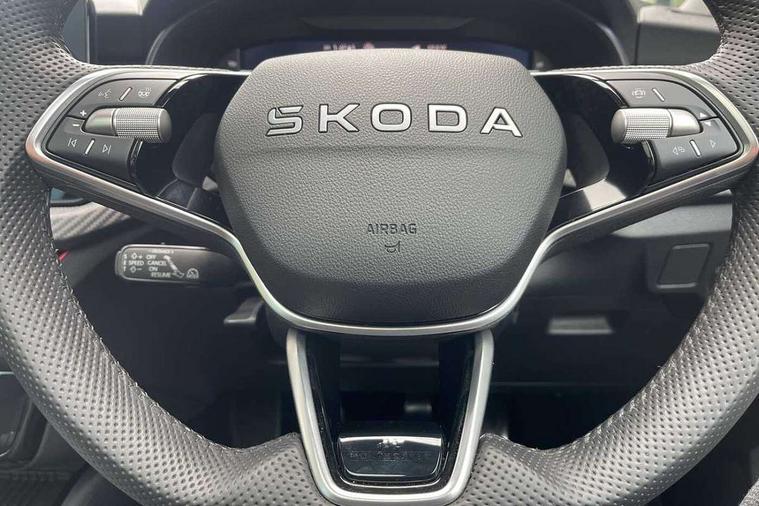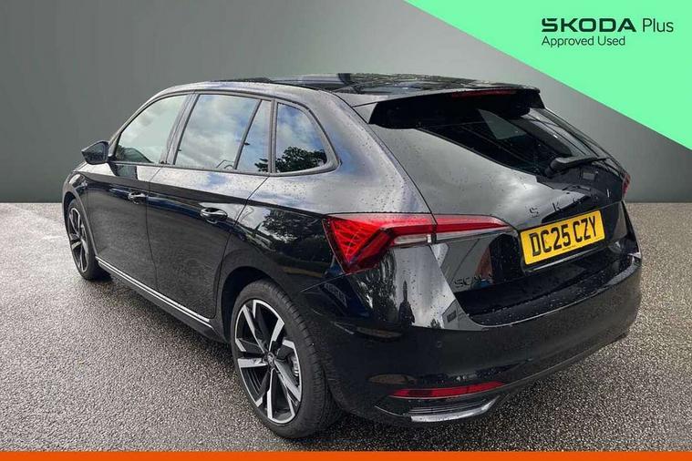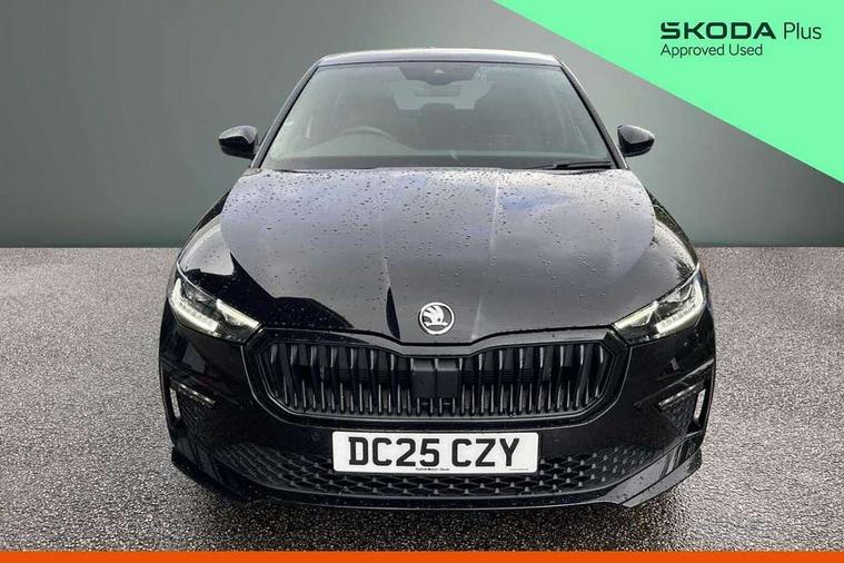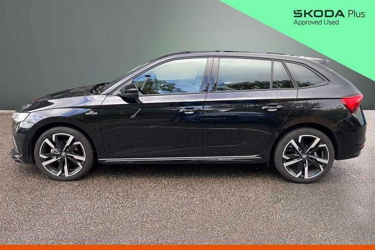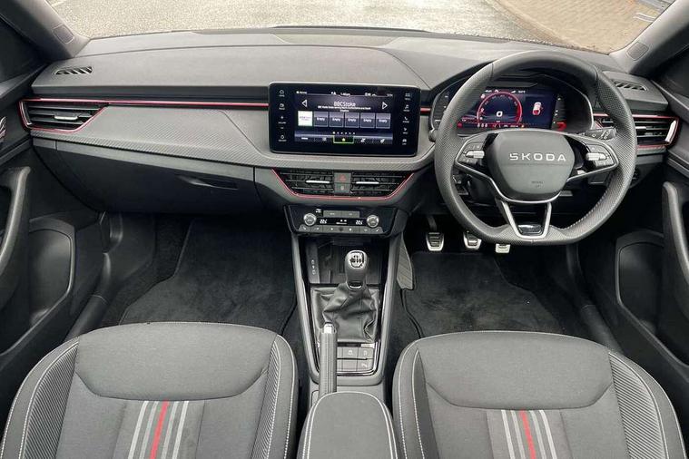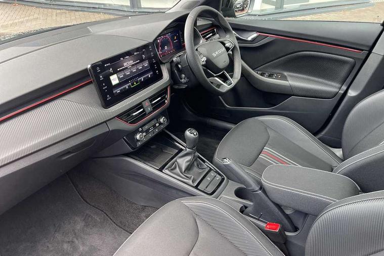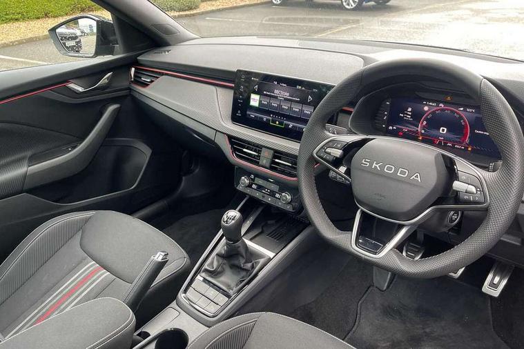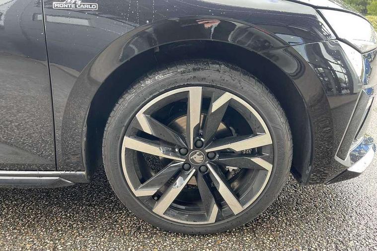 Advanced driver attention and drowsiness monitor, Bluetooth, e-Call (emergency call), Front assist system, PAS, Rear parking sensors, Rear view camera, Speed limiter, Tailgate, Traffic sign recognition, Virtual Cockpit - 10.25" digital display, Voice control system, Wireless smartlink, 4 USB C ports, 8 Speakers, 9.2" Skoda navigation display, DAB radio, Auto dimming rear view mirror, Automatic headlamp activation with Coming home and Leaving home feature, Automatic high/low beam, Automatic intermittent wipers, Black door mirrors, Black lettering on boot lid, Black radiator grille, Black rear diffuser, Black roof spoiler, Body colour bumpers, Body colour door handles, Chrome moulding around grille, Extended tailgate glass, Front and rear electric windows, Heated rear window, LED 3rd brake light, LED brake lights, LED daytime running lights, LED high beam, LED low beam, Light sensors, Monte carlo plaque, Panoramic glass roof, Privacy glass, Rear LED fog light, Rear side wing doors, Rear wiper, Tinted windows, Unique dark chrome design logo on alloy wheels, 12V socket in luggage compartment, 3 seat bench in 2nd row, Aluminium pedals, Ambient lighting in white/red, Black / White armrest stitching, Black ceiling, Black roof headlining, Cargo elements, Chrome inner door handles, Door inserts in art.leather carbon, Driver and passenger sun visors with vanity mirror, Dual zone climate control, Front and rear roof lights, Front centre armrest, Front head restraints, Height adjustable driver seat, Height adjustable passenger seat, Ice scraper, Illuminated glove compartment, Inner circulation control with pollen filter, ISOFIX for front passenger seat, Isofix preparation for back seats, Leather gearknob and handbrake lever, Luggage net under rear parcel shelf, Manual lumbar support for front seats, Monte Carlo cloth upholstery, Net package and top tether hooks in boot space, Pocket on the back of both front seats, incl. mobile phone pockets, Rear centre armrest, Red hotstamping, Single front passenger seat, Skoda lettering on steering wheel, Sport seats, Textile floor mats, Third rear headrest, Ticket holder, Top tether for front passenger seat, Umbrella in driver's door, Light and view plus pack - Scala, 3x3 point rear seatbelts, ABS, Child locks, Curtain airbags and front side airbags, Disc brakes, Driver and front passenger airbags, ESP, Hill hold control, Manual leather parking brake, One tone horn, Passenger airbag switch off function, Seatbelt reminder for driver and front passenger, Tyre pressure monitoring system, Anti theft alarm system with interior monitoring, backup horn and towing protection, Anti-theft wheel bolts, Remote central locking with 2 remote folding keys, SAFE function for remote central locking, Carbon effect decorative inserts, 18" Ursa black diamond cut alloy wheels,