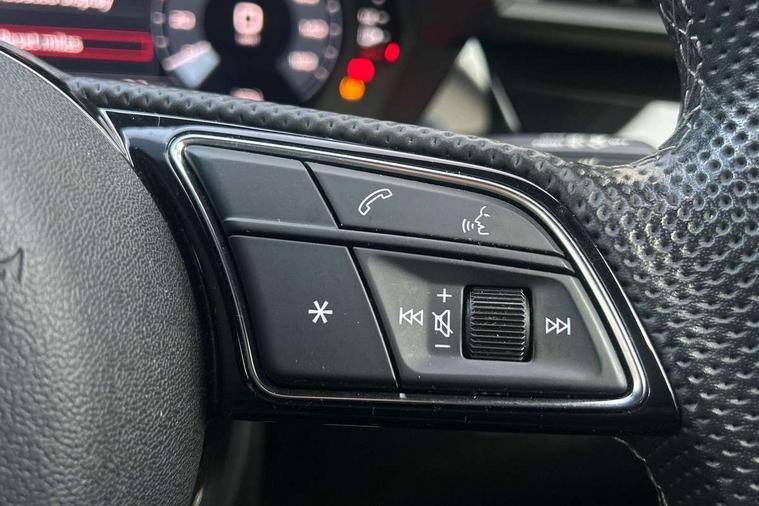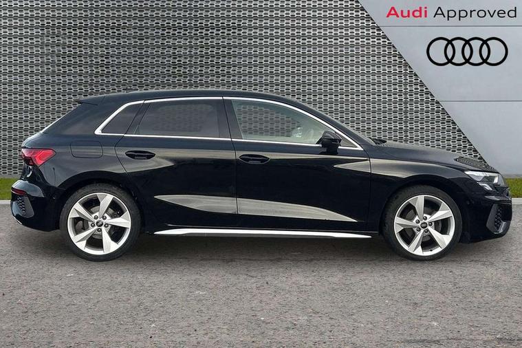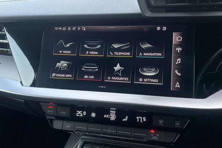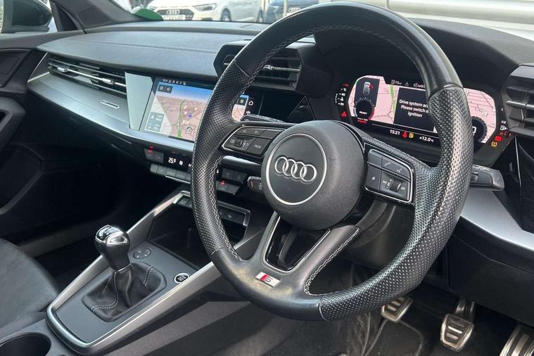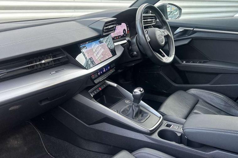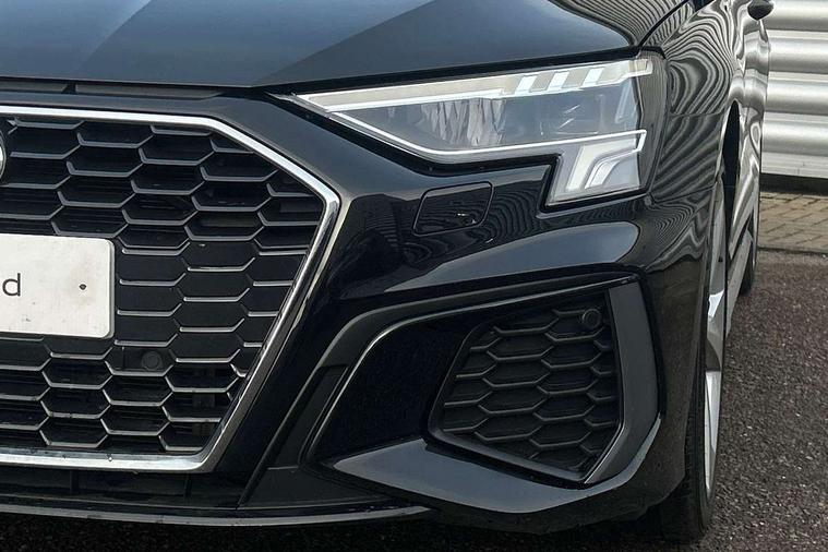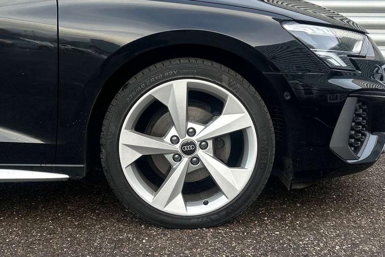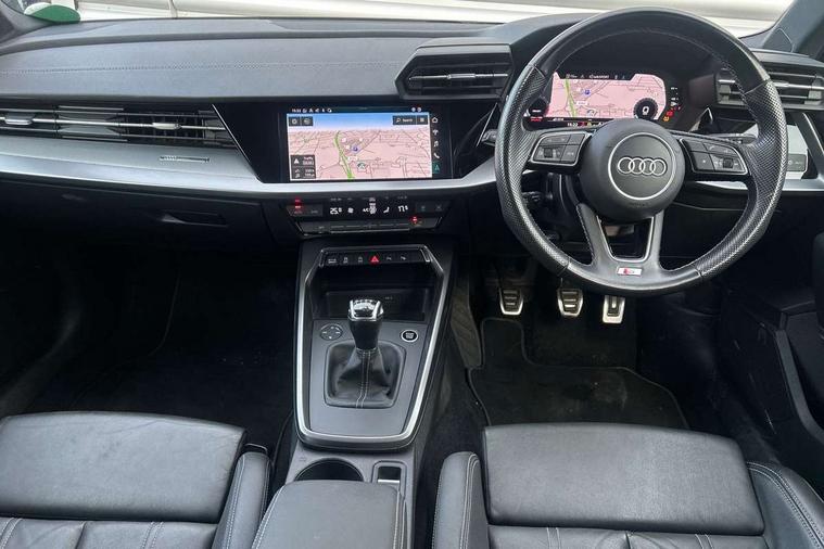 Audi drive select (Auto, Comfort, Dynamic, Efficiency and Individual), Audi smartphone interface, Audi Virtual Cockpit - 10.25" digital and colour instrument cluster, Automatic start/stop system with recuperation, Bluetooth interface, Collision avoidance assistant, Cruise control, e-Call (emergency call), Electromechanical power speed sensitive steering, Lane departure warning system, MMI Navigation Plus with high resolution 10.1" colour touch screen display, Rear parking sensors, Service indicator, Trip computer, Voice control system with natural language interaction, 2xUSB-C connection with data and charging functions, 6 passive loudspeakers, DAB Digital radio, 3rd brake light, Acoustic glass windscreen, Aluminium window trim, Auto dimming frameless rear view mirror, Electrically adjustable/heated/folding/auto dimming door mirrors with integrated LED indications + kerb view function for passenger side, Front electric windows, Illuminated aluminium inserts front door sills with S logo, LED daytime running lights, LED headlights with LED rear lights and dynamic rear indicators, Light and rain sensors, Privacy glass - dark tinted rear window, rear door and side windows, Rear electric windows, Rear side air outlets in grained matt black, Rear side wing doors, Rear wiper, S line bumpers, S roof spoiler, 12V socket and storage compartment in front centre console, 3 seat bench in 2nd row, 40/20/40 split folding rear seat bench with cupholder, Black cloth headlining, Dual zone electronic climate control, Front and rear centre armrest in leather, Front and rear headrests, Front/rear floor mats, Height and reach adjustable steering wheel, Illuminated vanity mirror, Interior lighting - glove compartment light and right hand side, Luggage compartment floor covering, Manual boot compartment lid, Manually adjustable front seats, Seat side bolsters, Single front passenger seat, Stainless steel pedals and front footrest in black, Twin leather upholstery with front sports seats S embossed logo, Aluminium interior elements pack - A3 Sportback, LED interior lighting pack - A3 Sportback, S line styling pack - A3 Sportback, 3x3 point rear seat belts, Audi pre sense front, Driver and front passenger airbag with passenger airbag deactivation, Electronic Stabilisation Control (ESC) including ABS, ASR and EDL, First aid kit with warning triangle and 2 safety vests, Front side airbags with head airbags and interaction airbag, Pre-sense front with pedestrian and cyclist detection, Seatbelt monitoring, Tyre pressure loss indicator, Anti theft alarm, Anti-theft wheel bolts, Electronically operated child lock, Immobiliser, Remote control central locking, Accent surfaces in the dashboard and centre console in platinum grey silk effect paint finish, Dark spectrum aluminium inlays,