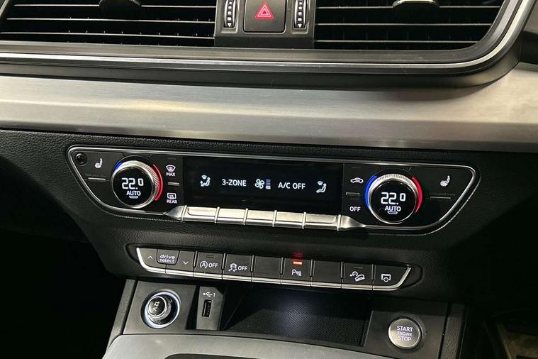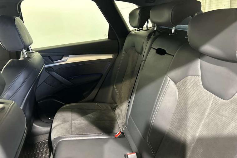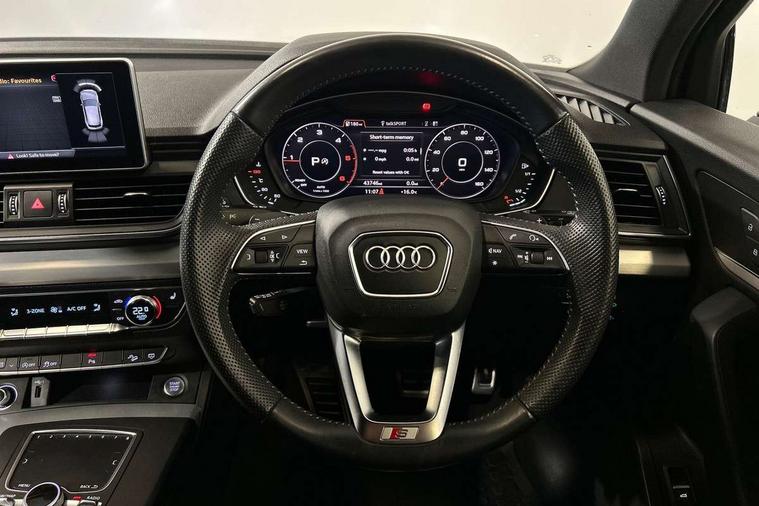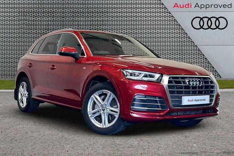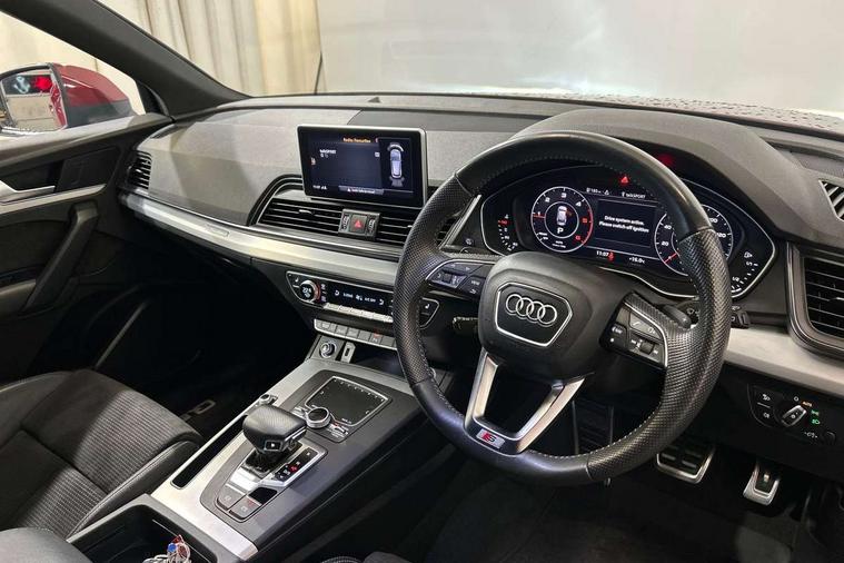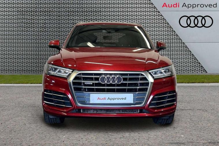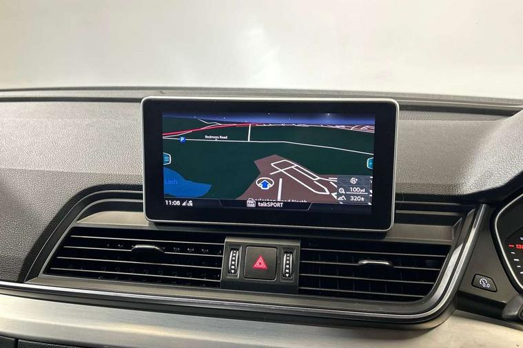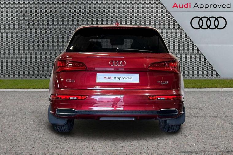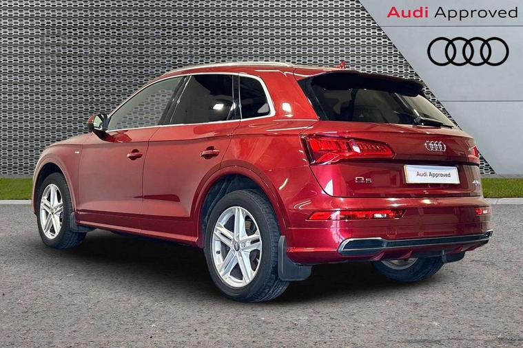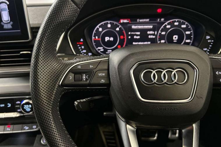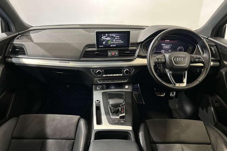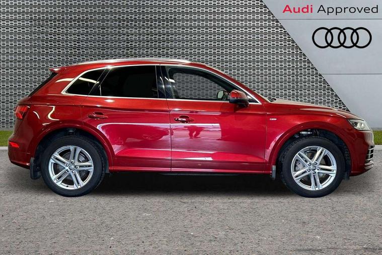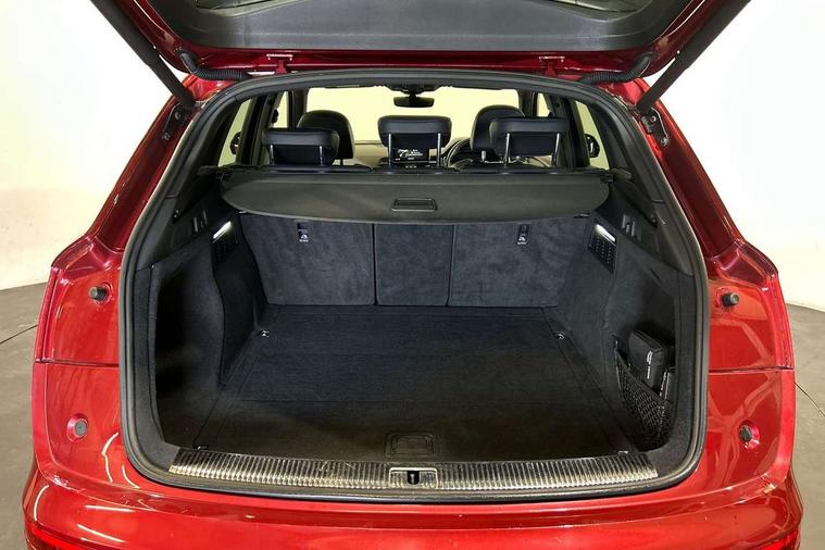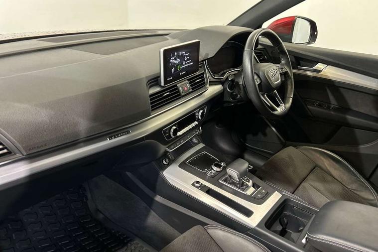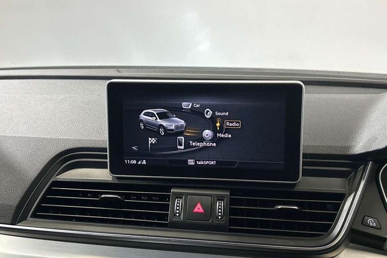 High gloss pack - Q5, Non Smokers pack, Anti theft alarm, Anti-theft wheel bolts, Keyless Go access/ignition system, Remote central locking, 2x SD card slot, CD player, DAB Digital radio, MMI radio plus with 7" colour MMI screen and MMI controller, 3 point seatbelts on all seats, 6 airbags - Driver, front passenger, curtain and side airbags, Electromechanical parking brake, Electronic stabilisation control including ABS, ASR and EDL, Front passenger airbag deactivation, Hill descent control, Hill hold assist, Multi collision brake assist, Pop-up bonnet for pedestrian protection, Pre sense city, Seat belt force limiter, Seatbelt monitoring, Tyre pressure warning, Warning triangle and first aid kit, Acoustic windscreen, Air inlets in matt titanium black with blades in matt aluminium silver, Aluminium roof rails, Auto dimming rear view mirror, Automatic headlight levelling, Body colour bumpers, Body colour door mirrors, Body colour rear diffuser with matt aluminium silver surrounds, Body colour S Line side skirts, Body colour underbody protection, Chrome exhaust tailpipe, Front and rear electric windows, High beam assistant, Light and rain sensor for auto activation of lights and windscreen wipers, Loading sill protector in stainless steel, Privacy glass with front acoustic glazing, Rear wiper, S Line badges on the front wings, S Line front and rear bumpers/side air inlets and diffuser, S Line rear spoiler, Twilight grey matt radiator grille with matt aluminium horizontal chrome struts, 2 x USB charging port with aux input socket, 3 rear headrests, 3 zone climate control, 40:20:40 split folding rear seat with rear centre armrest, Black cloth headlining, Contrast stitching on seats, steering wheel and gear lever gaiter, Front centre armrest, Front sport seats with S embossed logo, Front/rear floor mats, Height adjustable front head restraints, Illuminated door sill trims with S logo, ISOFIX child seat mounting and top tether, Luggage compartment carpet, Perforated leather gearknob, Removable luggage compartment floor, Stainless steel pedals, Sunvisors with vanity mirrors, Tool kit, Trunk roller cover, 7" Colour driver information system, Audi drive select, Audi parking system plus with front and rear sensors, Audi smartphone interface, Electro - mechanical power assisted steering, MMI Navigation, Mobile telephone preparation - bluetooth interface, Power tailgate, Service interval indicator, Voice control system, Diesel particulate filter,