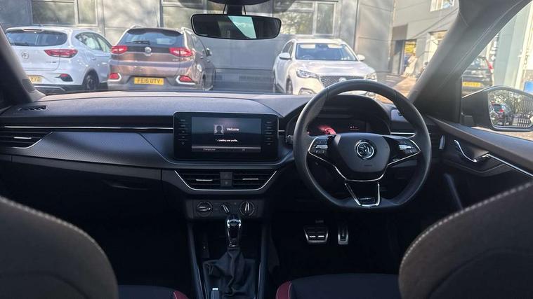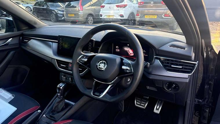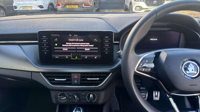 Amundsen satellite navigation with 9.2" glass colour touchscreen display, web radio, voice control and traffic sign recognition, Bluetooth system, E-call, Front assist system, Gesture control, PAS, Service indicator, Speed limiter, Wireless Smartlink for Apple CarPlay (wired for Android Auto), 8 Speakers, Auxiliary input socket, DAB Digital radio, Black door mirrors, Black radiator grille, Black rear diffuser, Body colour bumpers, Body colour door handles, Body colour roof spoiler, Boot lettering in black, Chrome grille surround, Dimming rear view mirror with black surround, Electrically adjustable and heated door mirrors, Front and rear electric windows, Front sport bumper, Full LED headlights with adaptive front light system, cornering function, fog lights and dynamic indicators, Headlight range control, Heated rear window, High functionality rear led lights with dynamic indicators, KAMIQ Door sills, LED daytime running lights, LED third brake light, Light sensors, Monte carlo plaque, Panoramic sunroof with black roof rails, Privacy glass, Rain sensor, Rear fog lights, Rear side wing doors, Rear wiper, 12V Accessory socket in centre console, 3 seat bench in 2nd row, Aluminium pedals, Black ceiling for black/beige interior, Black roof lining, Chrome inner door handles, Cloth upholstery, Front head restraints, Glove compartment with illumination, Ice scraper, Isofix child seat fittings on outer rear seats, ISOFIX on front passenger seat, Leather gear lever, Manual lumbar support for front seats, Rake/reach adjustable steering wheel, Reading lights, Single front passenger seat, Sports seats, Sun visors with illumination on front passenger, Textile floor mats, Third rear headrest, Top tether for front passenger seat, Umbrella in driver's door, 3x3 point rear seatbelts, Airbags - driver and front passenger, ESP, Front passenger airbag deactivation switch, Front side airbags with curtain airbags, Hill hold control, Manual parking brake, Manual rear child locks, One tone horn, Rear disc brakes, Seatbelt reminder for driver an co-driver, Traction control, Tyre pressure monitor, Anti-theft alarm system with interior monitoring, backup horn, towing protection and remote central locking with SAFE system, Anti-theft wheel bolts, Electronic engine immobilizer, Chrome air vent surrounds, 18" Vega alloy wheels in black,