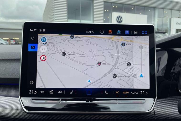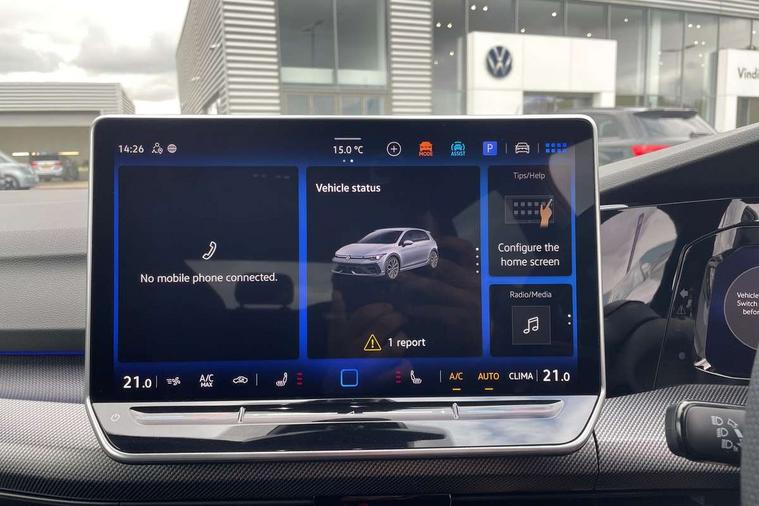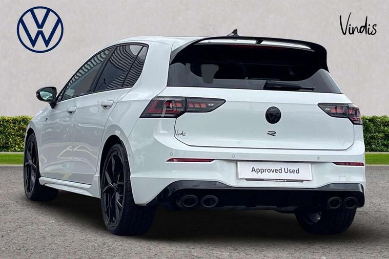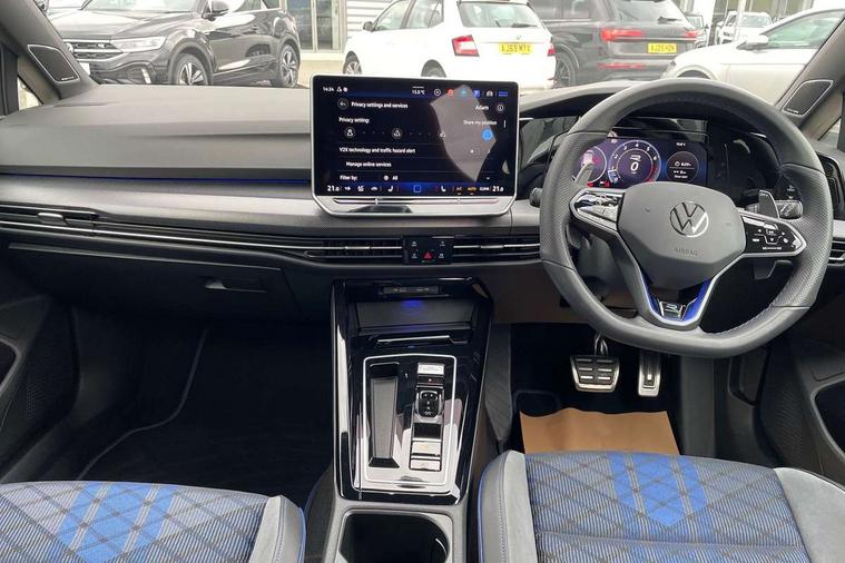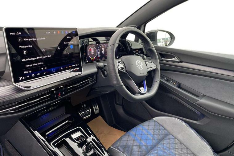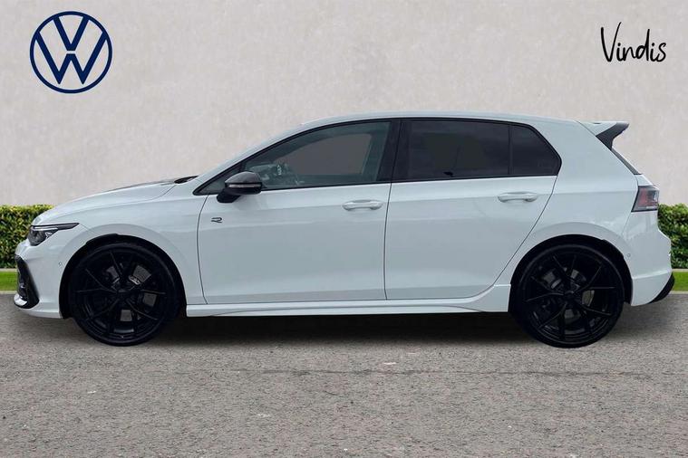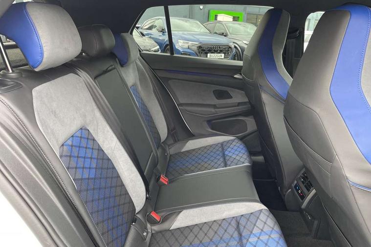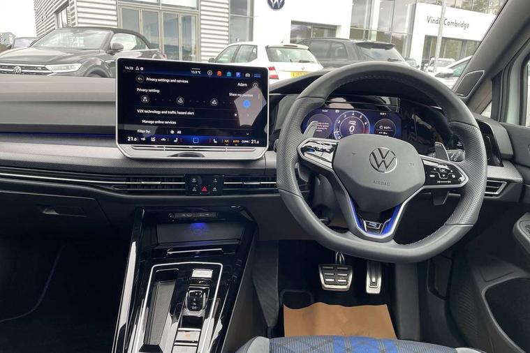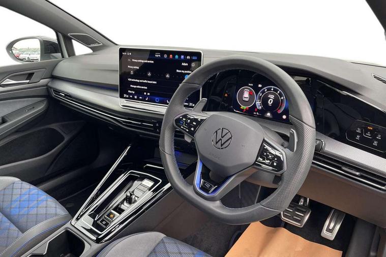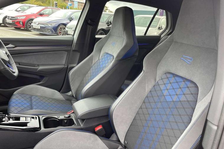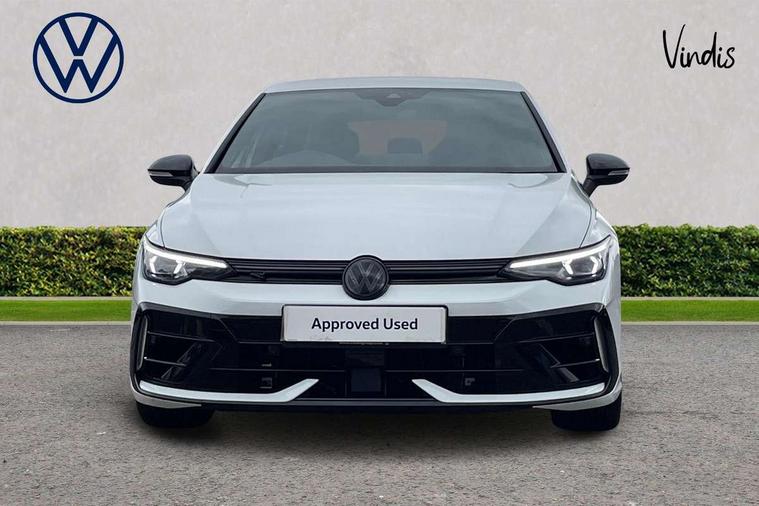 Activated carbon canister, Adaptive cruise control (ACC), Advanced driver attention and drowsiness monitor, Dynamic road sign display, E-Sim card for online connectivity, eCall emergency call system, Electronic maximum speed limit increased to 270 km/h, includes driving Modes 'drift' and 'special', larger roof spolier and GPS laptimer + G-Meter, Lane change system side assist, rear traffic alert and exit warning system, Multi-color Digital cockpit pro, selection of different info profile possible, Multifunction front facing camera for distance control, Navigation system, Oncoming vehicle braking when turning including swerve support, Preparation for light assist system, Progressive steering, Speed limiter, Speedo, rev counter, electronic odometer, trip, service interval display, exterior temperature and fuel gauge, Traffic jam assist, Voice enhancer and voice control, Warning signal and warning light for front and rear seatbelts not fastened, We connect plus preparation, We connect preparation, Wireless app connect, All wheel drive - 4Motion, Petrol Particulate Filter, Sports suspension, Start-stop system with battery regeneration (recuperation - energy recovery during braking), XDS electronic differential lock for improved traction and handling, 2 USB C ports in front, 2 USB charging sockets on the centre console in the rear charging capacity upto 45W, Comfort telephony + wireless charging, without wireless aerial connection, Digital radio reception (DAB), Diversity antenna for FM reception, Gaming platform via car app, Infotainment system with 12.9" display, Mobile phone interface with inductive charging feature, 3rd brake light, Auto dimming rear view mirror, Auto headlights, Automatic headlamp activation with Coming home and Leaving home feature, Black badge on B-pillar, Black mirror caps, Black strips on radiator grille and headlights, Body colour door handles, Darkened headlights, Darkened R Logos and VW logos in front, rear and on fender, Exhaust system with black tailpipe, Exterior ambient lighting with illuminated lighting animation and wake up/goodbye scenario, Exterior mirrors convex on the left and aspherical on the right, Front and rear electric windows, Front fog lamps and cornering light, Heat insulating windshield made of laminated glass, LED daytime running lights, LED matrix headlights with ambient light V2, advanced high beam, dynamic range contol with cornering, LED rear lamp with indicator, poor weather, R name plate, Rain sensor, Rear fog light on one side and reversing lights on both sides, Rear side wing doors, Rear tinted glass 65% light absorbing from B pillar backwards, Rear windscreen washer and wiper with interval delay, Remote electrically foldable door mirrors, puddle lights and reverse activated passenger's door mirror, Welcome light with surround lighting, 12V socket in front centre console, 12V socket in luggage compartment, 3 rear head restraints, 3 seat bench in 2nd row, 30 colour ambient lighting, illuminated center console storage compartment in front, Air care climatronic 3 Zone automatic climate control with rear air conditioning control panel, Aluminium gearshift handle, Brushed stainless steel pedals, Carpet mats, front and rear, Front centre armrest, Integrated front head restraints, ISOFIX anchors for child seats on outer rear bench seats and on front passanger seat compatible for i-Size, Luggage compartment lighting, Rear cupholder and loadthough, Single front passenger seat, Soul black instrument panel, Split folding backrest with centre armrest and unsplit rear seat bench, Storm grey roof lining, Sun visors with illuminated vanity mirrors, Driver assistance pack - Golf DSG Estate/Hatchback, R styling pack - Golf, Technology park and comfort pro package - Golf Hatchback, 3 point height adj front seatbelts + pretensioners, 3 rear three point seatbelts, ABS, Autonomous emergency braking front assist with pedestrian and cyclist monitoring, Child locks on rear doors, Disc brakes in rear incl. brake calipers in black with darkened R-logo, Driver and front passenger airbag with front passenger airbag deactivation, Electronic parking brake with auto hold, ESC (Electronic Stability Control), Extended pedestrian protection measures, Hill start assist, Two tone horn, Tyre pressure loss indicator, Volkswagen roadside assistance, Anti theft wheel bolts, Preparation for alcohol interlock, Wheel hub cover with darkened R-logo,