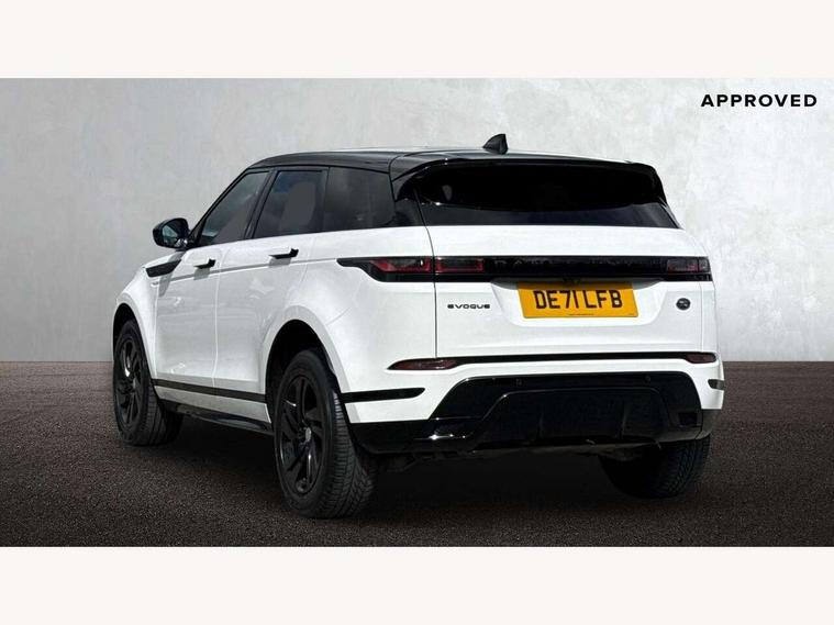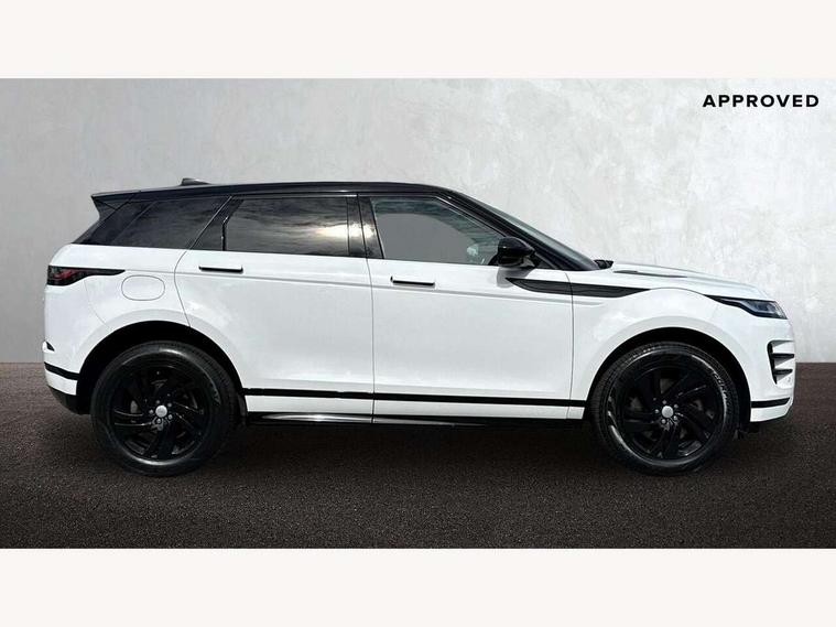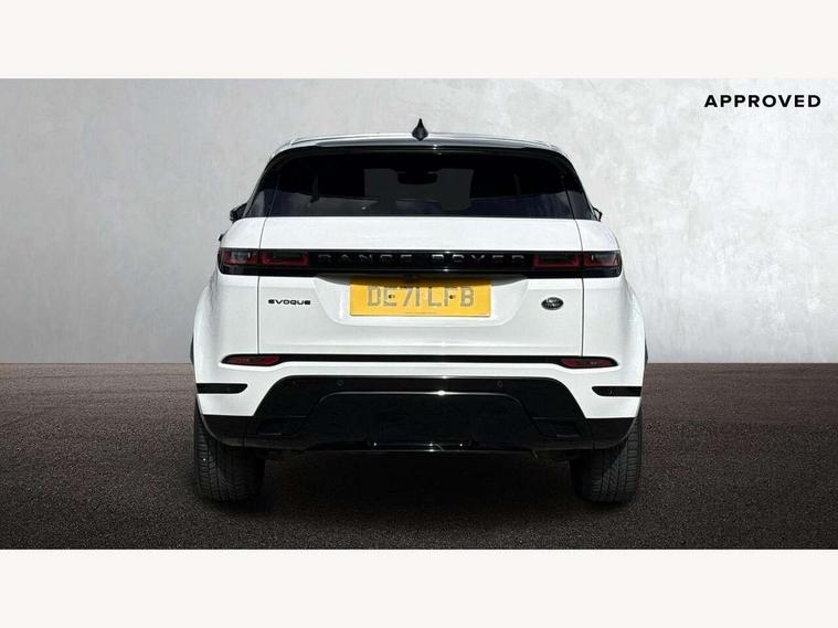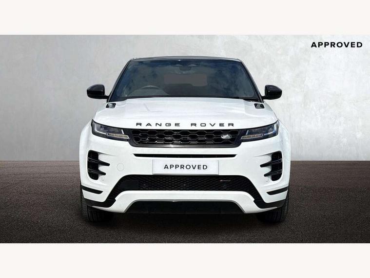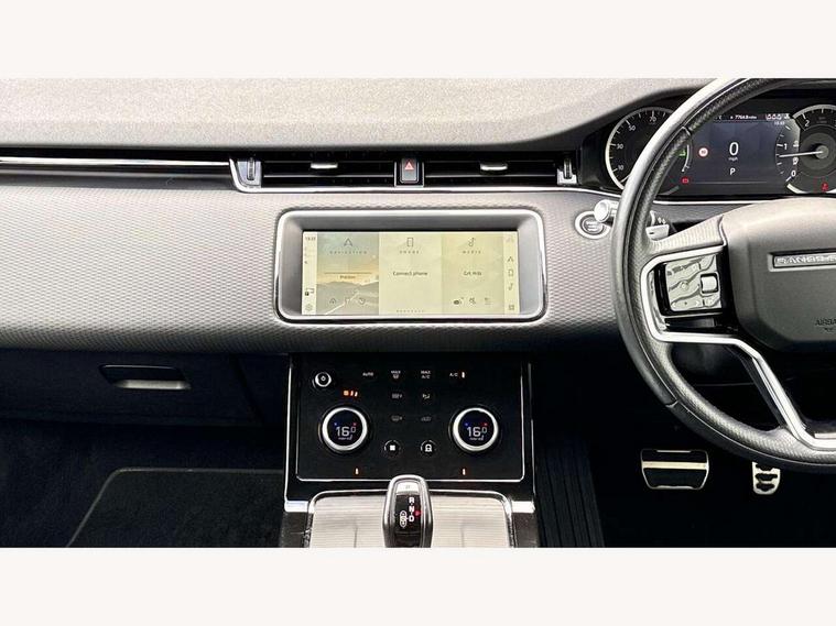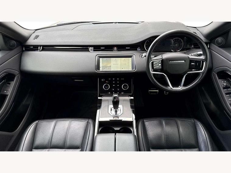 Android Auto, Apple car play, Bluetooth connectivity, Brake pad wear indicator warning light, Driver condition monitor, Electronic power assisted steering (EPAS), Front and rear parking aid, InControl remote, Land Rover InControl apps, Lane keep assist, Pivi pro connected includes upgraded infotainment, connected navigation pro, Nuance speech licence, Push button starter, Traffic sign recognition with adaptive speed limiter, Voice control system, All terrain progress control, Efficient Driveline, Passive suspension, Terrain Response 2 Auto, Digital Audio Broadcast radio-DAB, Steering wheel mounted controls, Electric windows with one touch open/close and anti trap, Evoque and R-Dynamic badge, Flush deployable exterior door handles, Heated rear window with timer, Heated washer jets, Heated windscreen, Power fold, auto-dimming, heated door mirrors with approach lights and auto dimming driver side, Rain sensing windscreen wipers, Rear fog lights, Tailgate spoiler, 40:20:40 split folding rear seats with centre headrest and armrest, Ambient interior lighting, Bright metal pedals, Isofix system on outer rear seats, Overhead lighting console, Overhead stowage for sunglasses, Passive front head restraints, Rear air vents, Rear centre headrest, Satin chrome gearshift paddles, Sunvisors with illuminated vanity mirrors, Twin sliding front centre armrest, 3 rear 3 point seatbelts, Anti-lock braking system (ABS), Customer configurable autolock, DSC - Dynamic Stability Control, Electronic brake force distribution, Electronic parking brake, Electronic traction control, Emergency braking, Front and rear seatbelt reminder, Hill descent control, Hill launch assist, Low traction launch, Power operated child locks, Roll stability control, Six airbags - Driver and passenger airbags/driver knee airbag/front side airbag and curtain airbags, Torque vectoring brake, Tyre pressure monitoring system, Alarm, Immobiliser, Intrusion sensor, Locking wheel nuts,