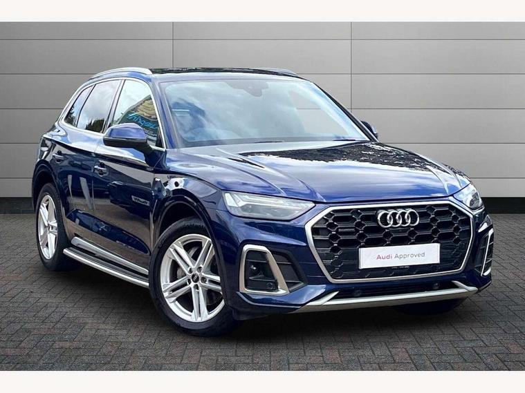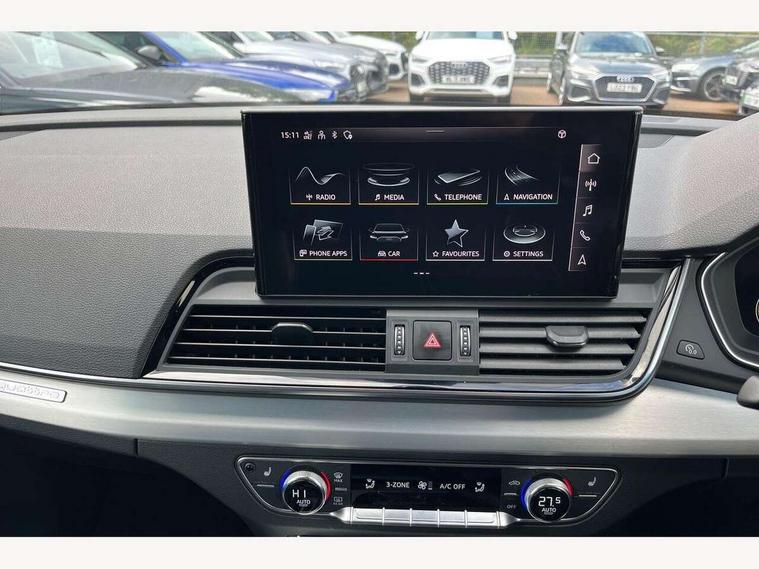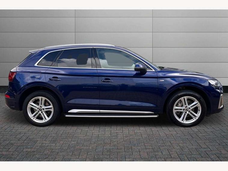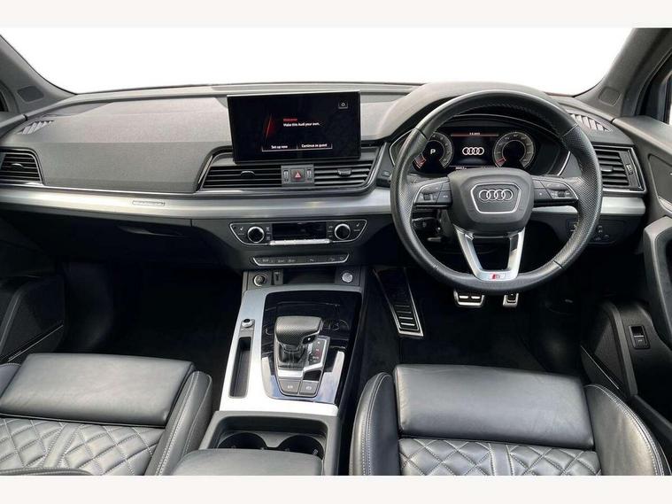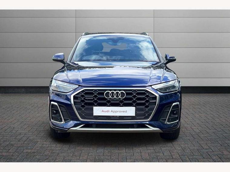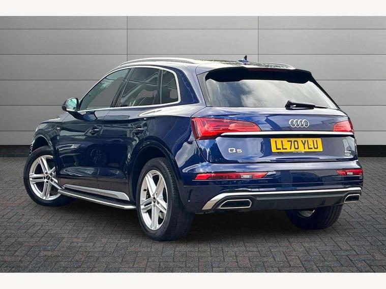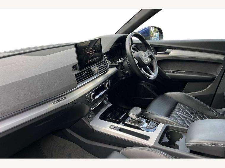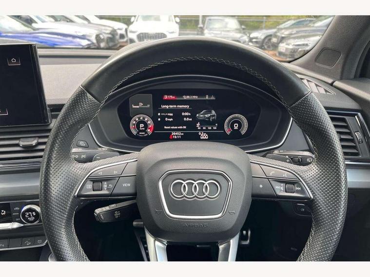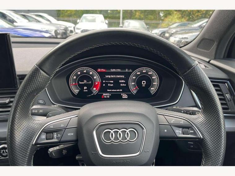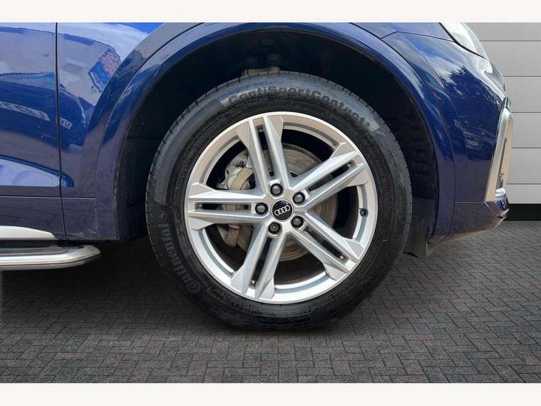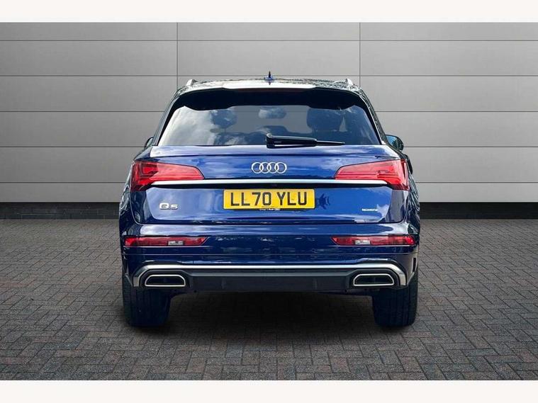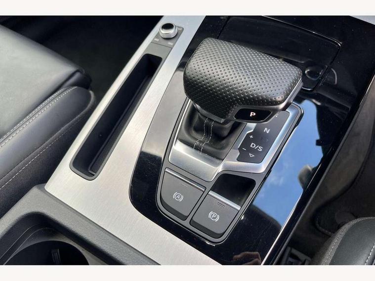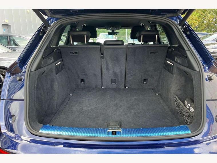 Amazon alexa Integration, Audi connect safety and service (e-call), Audi drive select, Audi virtual cockpit plus with 12.3" screen and three different layout designs, Audi wireless smartphone interface, Automatic start-stop system with coasting functionality and efficiency programme, Electro - mechanical power assisted steering, MMI navigation plus with 10.1" touch screen, Mobile telephone preparation - bluetooth interface, Power tailgate, Service interval indicator, Voice control system with Audi hotword activation "Hey Audi", Quattro on demand, DAB Digital radio, Acoustic windscreen, Air inlets in matt titanium black with blades in matt aluminium silver, Aluminium roof rails, Audi matrix LED headlights with LED rear lights + dynamic front and rear indicators, Auto dimming rear view mirror, Automatic headlight adjustment, Automatic headlights and windscreen wipers, Body colour bumpers, Body colour door mirrors, Body colour rear diffuser with matt aluminium silver surrounds, Body colour underbody protection, Chrome plated exhaust trims, Door sills in Selenite silver, Electric adjustable/heated/folding door mirrors, Front air inlet surrounds in aluminium, Front and rear electric windows, Front radiator grille in honeycomb design, Headlight washers, Rear chrome trim strip below lights, Rear privacy glass and rear side windows, Rear spoiler, Rear wiper, Roof bars, S Line badges on the front wings, S Line front and rear bumpers, S Line side skirts, 2 x USB charging port with aux input socket, 3 rear headrests, 40:20:40 split folding rear seat with rear centre armrest, Black cloth headlining, Contrast stitching on seats, steering wheel and gear lever gaiter, Deluxe 3 zone electronic climate control, Front centre armrest, Front sport seats with S embossed logo, Front/rear floor mats, Gear lever in black leather, Heated front seats, Height adjustable front head restraints, Height/reach adjustable steering column, Illuminated door sill trims with S logo, ISOFIX child seat mounting and top tether, Manual seat adjustment with 4-way electric lumbar support, Removable luggage compartment floor, Stainless steel pedals, Sunvisors with vanity mirrors, Tool kit, Trunk roller cover, High gloss pack - Q5, LED interior light pack - Q5, 3 point seatbelts on all seats, 6 airbags - Driver, front passenger, curtain and side airbags, Electrically operated child locks on rear doors, Electromechanical parking brake, Electronic stabilisation control including ABS, ASR and EDL, Front passenger airbag deactivation, Hill descent control, Hill hold assist, Multi collision brake assist, Pop-up bonnet for pedestrian protection, Pre sense city, Seat belt force limiter, Seatbelt monitoring, Tyre pressure warning, Warning triangle and first aid kit, Anti theft alarm, Anti-theft wheel bolts, Keyless Go access/ignition system, Matt brushed aluminium inlays,