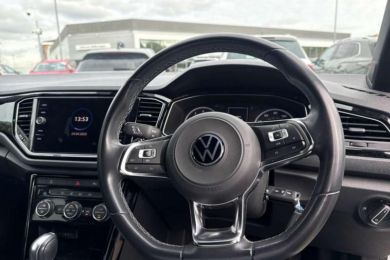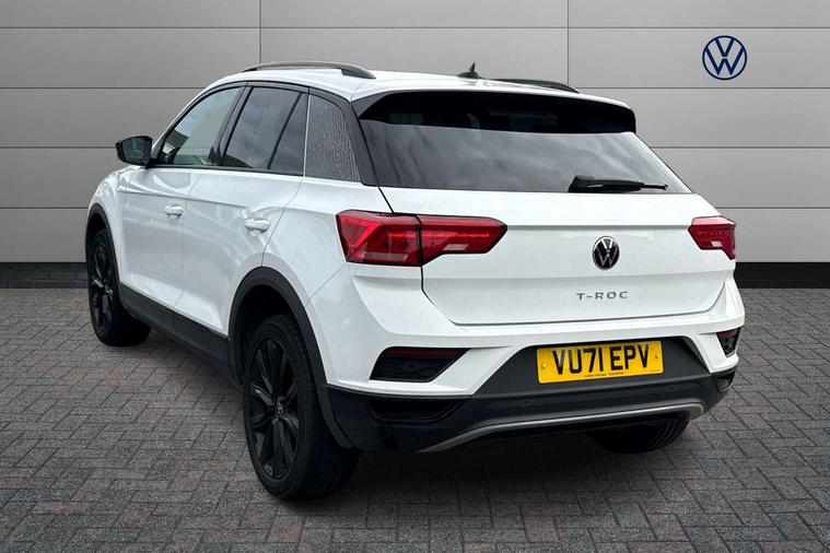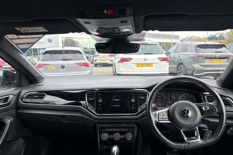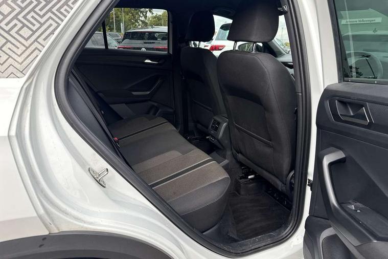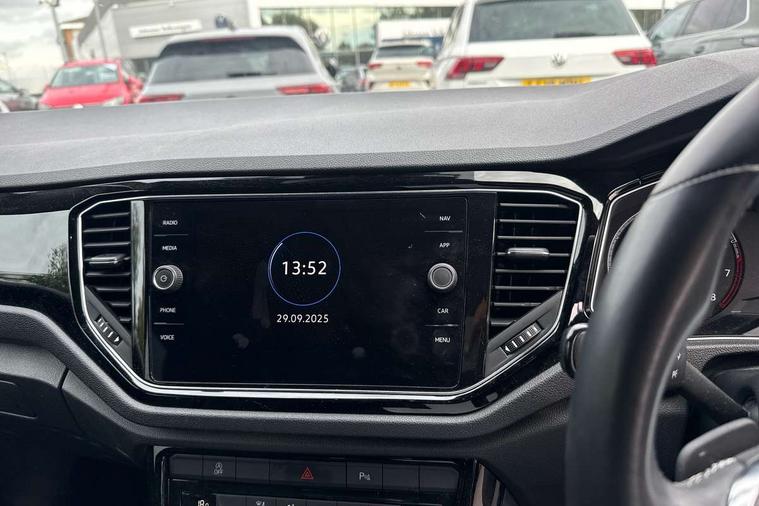 'Lights On' Reminder warning buzzer, Adaptive cruise control, Bluetooth telephone and audio connection for compatible devices, Car information display, Driver tips and journey analysis, Emergency call service, Lane assist with warning text instrument cluster, Modified key software - reduce switch off time for key status change to Long no motion, Multifunction camera, Multifunction computer with visual gear change recommendation for fuel consumption, Service interval indicator, Think blue trainer driver tips and journey analysis, Warning sound and light for doors and tailgate open, Warning sound and light for front seatbelts unfastened, Wireless app connect for apple carPlay, Battery regeneration during braking, Start/stop function with battery regeneration, DAB Digital radio, Diversity antenna for FM reception, Multi device interface (MDI) with USB connection, Music playback - MP3, WMA and AAC files, Premium USB cable in choice of either Apple or Android smartphone compatibility, SD card slot, Simultaneous pairing of 2 compatible mobile devices, Single CD player, glovebox mounted, SMS functionality - read, compose and send SMS messages using touch-screen display, Storage compartment with longitudinal and height adjustable in armrest and two rear air vents, Title and cover art display, USB-C Interface and USB charging socket, Auto dimming interior rear view mirror, Automatic coming/leaving home lighting function and daytime running lights, Automatic hazard lights activation under emergency braking, Black grained lower door protectors, Black grained wheel arches, Black roof rails, Body colour door handles, Body colour sports bumpers with silver metallic underbody fascia, Body coloured bumpers and radiator grille with chrome trim and front fog lamps with chrome bezel, Chrome trim on upper and lower radiator grille, Dusk sensor, Electrically foldable, adjustable and heated door mirrors with puddle lights and reverse activated kerb-view adjustment on passenger's door mirror, Exhaust tailpipes in black, External USB type C socket and charging sockets, Front and rear electric windows, Front windscreen wiper with intermittent wipe and 4 position delay, Fully galvanised body, Heated rear window, High level 3rd brake light, LED headlamps with automatic range adjustment and unique signature LED separate daytime running lights, LED rear number plate lights, LED tail lamp rear comination lamps, Privacy glass, Rain sensor, Rear tinted glass from B-pillar backwards approx 65% tinted, Rear wash/wipe with intermittent wipe setting, Trim strips on grille and vehicle side, Volkswagen roundel, 12V socket in centre console storage area, 3 rear head restraints, 4 load lashing points in luggage compartment, Black roof lining, Climate control - 2 zone electronic air conditioning with automatic air recirculation and allergy filter, Door and side trim panel, Drawer under drivers seat, Front centre armrest, Front cupholders x 2, Front seat back storage pockets, Glovebox, Height adjustable front seats, Height/reach adjust steering wheel, Instrument lighting, white adjustable panel illumination, Interior light in footwell, Isofix easy fit child seat preparation for 2 outer rear seats, Leather gearshift knob, Leather multi function sport steering wheel with gear change selection via paddle shift on steering wheel, LED interior light with switch off delay/dimmer and 2 front/rear LED reading lights, Load through provision with single cup holder when folded down, Luggage compartment cover, removable, Luggage compartment lighting, Split folding rear seat backrests with centre armrest, Storage compartment in left and right luggage area, Storage compartment in rear doors, Storage compartments in driver and front passenger doors, Sunvisors with illuminated vanity mirrors, White ambient lighting, Black decal on C-pillar pack - T-Roc, 3 rear three point seatbelts, ABS, Curtain airbags, Driver and front passenger safety-optimised head restraints, Drivers and front passengers airbags with passengers deactivation switch, Drivers seatbelt reminder, Electronic parking brake with auto hold, Electronic stability control (ESC) includes ASR, EDL, EDTC and trailer stabilisation function, Front assist with city emergency braking and pedestrian monitoring, Front seat side impact airbags, Predictive pedestrian protection, Rigid safety cell with front and rear crumple zones, Single tone horn, Three point height adjust front seatbelts + pretensioners, Tyre pressure loss indicator, Ventilated front and rear disc brakes, Volkswagen roadside assistance, Alarm with remote central locking and interior protection, Electronic engine immobiliser, Remote central locking with SAFELOCK, radio remote control with 2 remote control folding keys, Black decorative trims, Piano black decorative inserts in dash, centre console and door panel, 18" Arlo black diamond turned surface alloy wheels with low rolling resistance tyres and anti theft wheel bolts,
