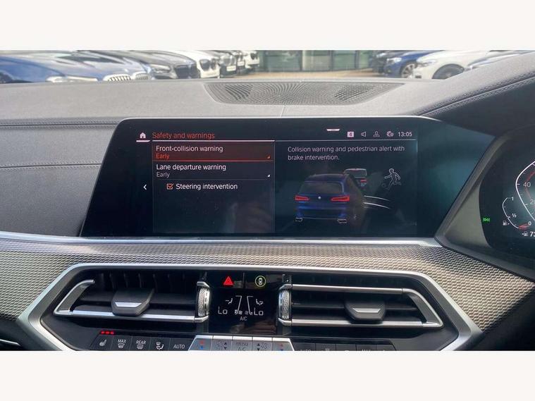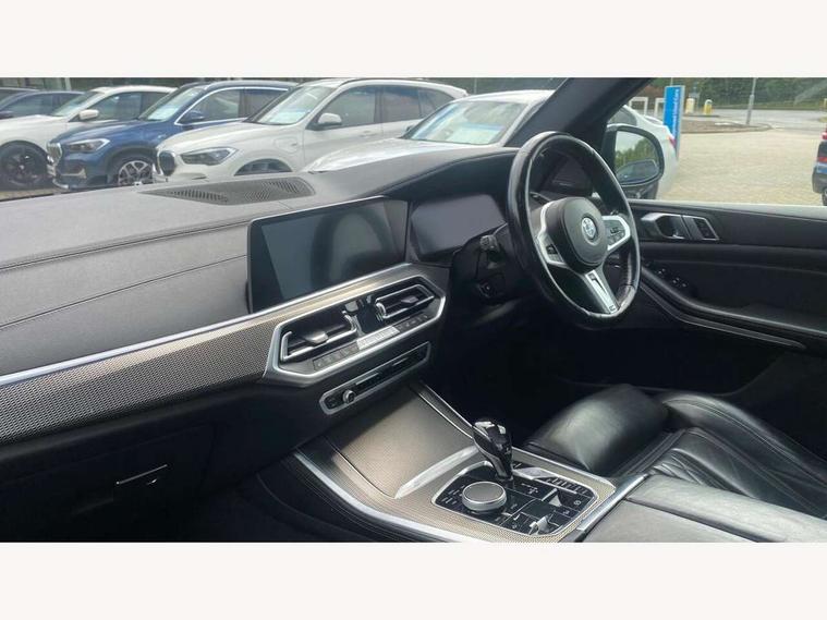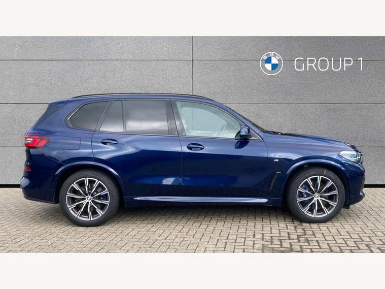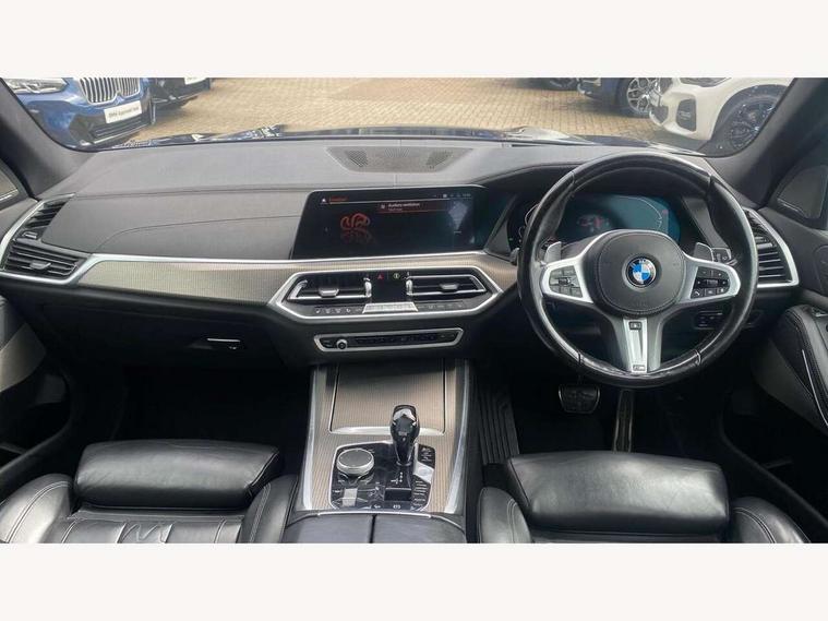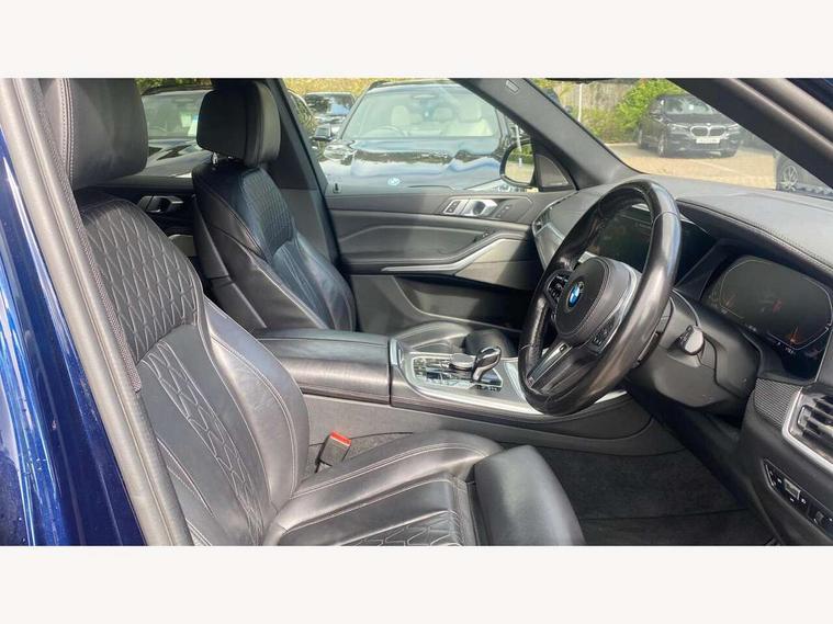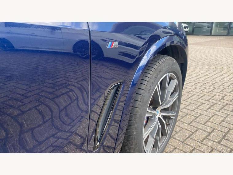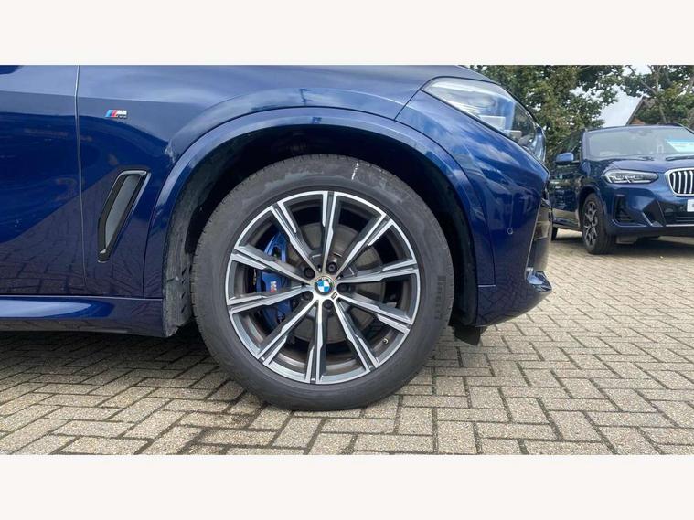 20GB hard disc drive (HDD) memory, Active guard plus, Attentiveness assist, Automatic tailgate with top hinged section open and manual bottom hinged section, BMW ConnectedDrive online services, BMW digital live cockpit professional - 12.3" digital instrument panel and 12.3" CID, with touch/voice command, BMW legal emergency call, BMW Teleservices, Brake force display, Brake pad wear indicator warning light, Enhanced bluetooth hands free facility with Telephony wireless charging, Front/rear park distance control, Galvanised plastic keyfob, iDrive touch controller with shortcut buttons, Infinity symbol with line graphic on reset of average consumption, Lights on warning, Oil sensor for level and grade, On board computer inc. average speed, fuel consumption, liquid crystal Info display, journey computer, outside temperature display, personal profile, Service interval indicator, Speed limit info display, Wi-Fi hotspot, 48V Mild hybrid technology, Adaptive 2-axle air suspension, Double VANOS, Double wishbone front axle, Drive performance control with ECO PRO comfort + sport mode, Eight speed steptronic sport automatic transmission and gearshift paddles on the steering wheel, High precision injection, Petrol Particulate Filter, Safety battery terminal clamp, Turbocharger with Valvetronic, DAB Tuner enables digital radio reception, Favourite buttons, USB connection, USB type A 1.5A in cupholder, USB Type C 3A in centre armrest, Active Air Stream kidney grille with high-gloss chrome, Adaptive air flap control bar in high-gloss black, Automatically dimming rear view mirror, BMW Individual high gloss black shadow line roof rails, Body colour bumpers, Body colour door handles, Dynamic brake lights with LED technology, Exhaust tailpipes - single, left and right with Chrome finisher, Follow me home headlight function, Front and rear electric windows with open and close fingertip control, anti trap facility and comfort closing, Heated windscreen washer jets, High beam assistant, High gloss black outer and central air intakes on front bumper with pearlescent chrome finish, High gloss black Side elements, LED daytime running lights, LED fog lights, LED rear lights, M aerodynamic body styling, M designation on left and right front side panels, Pearlescent chrome front grille bars, Rain sensor with automatic headlight activation and windscreen wiper control, Satin aluminium side window graphic, Third brake light in rear spoiler, Variable intermittent rear wash/wipe, Welcome light carpet, X5 on left tailgate, xDrive designation on right tailgate, 12V - Power sockets with 2x centre console and 1x luggage compartment, 40:20:40 split folding rear seats, Ambient interior lighting with 6 pre-designed selectable lights including dynamic function, Centre and rear interior light, Child seat ISOFIX attachment with rear outer seats includes top tether, Electric front seat adjustment with driver and front passenger memory function, Electrical steering column with adjustable height and length with activation and control on the steering column, Foldable rear centre armrest with 2 cupholders and storage compartment, Front and rear cupholders x 2, Front and rear door pockets, Front and rear door sill inlays with illuminated BMW M designation, Front and rear side armrest integrated into door trim, Front footwell lights, Front reading lights, Light inside glove compartment, Lockable glove compartment, Luggage compartment floor panel with integral storage tray, Luggage compartment lighting, M leather steering wheel, M specific key, M specific pedals, M specific steering wheel, M specific velour floor mats, Make-up mirror lights, Multifunction controls for leather steering wheel, Multifunctional hooks, Rear head restraints, Seat back with flap pocket, Securing rings in luggage compartment, Storage bins on all doors, Storage tray and compartment with cover in centre console, Sunvisors with illuminated vanity mirrors, Toolkit located in luggage compartment, Connected Package Professional - X5, Expanded exterior mirror pack - X5/X5 M, Non-smokers pack - X5, Airbags - driver/front passenger, rear and side, first and second row seats head airbags, front passenger seat airbag deactivation + knee airbag, Anti-lock braking system (ABS), Automatic Stability Control (ASC), Brake drying, Brake energy regeneration, Brake fade compensation, Braking pre-tensioning, Cornering brake control (CBC), Crash sensor activating central locking release, hazard warning lights, fuel cut off, interior lighting + activation of safety battery terminal clamp, Deformation zones - front and rear with door reinforcements and bumpers up to 2.5 mph, DSC - Dynamic Stability Control, Dynamic brake control, Dynamic Traction Control - DTC, Electromechanical parking brake with automatic drive away release and auto hold function, Electronic brake force distribution, Front and rear seatbelts with seatbelt stopper, seatbelt tensioner for front and outer rear seats and belt force limiter, Front head restraints with anti-whiplash, Height adjustable front seatbelts, Hill start assistant, Integrated brake system, M Sport braking system in blue high gloss + blue painted brake calipers with M designation, Mechanical child proof lock on rear doors, Passive protection for pedestrians, Seat occupancy detection for driver and passenger side, Side impact protection, Three 3 point inertia reel seatbelts, Two tone horn, Tyre pressure monitoring system, Ventilated front and rear disc brakes, Warning triangle and first aid kit, Closing system with central locking, Driver and front passenger door centre lock switch, Locking wheel bolts, Thatcham 1 alarm system with remote control and engine immobiliser, Start/stop toggle diamond shaped trim finisher in pearl chrome,