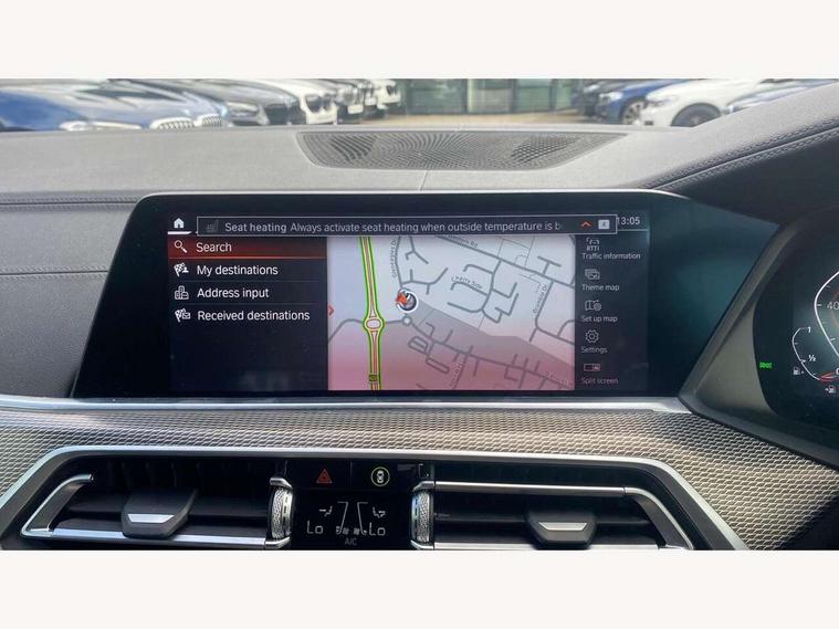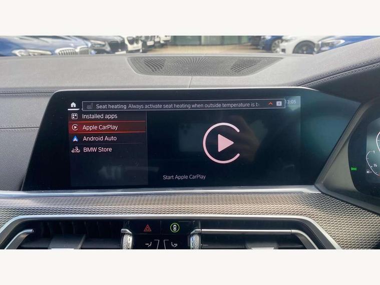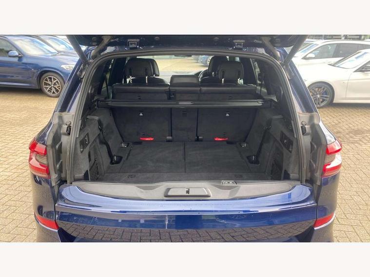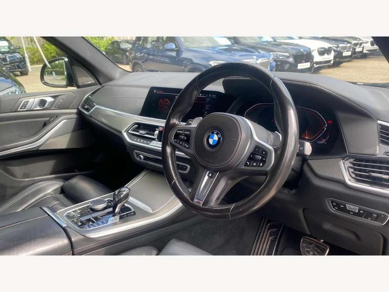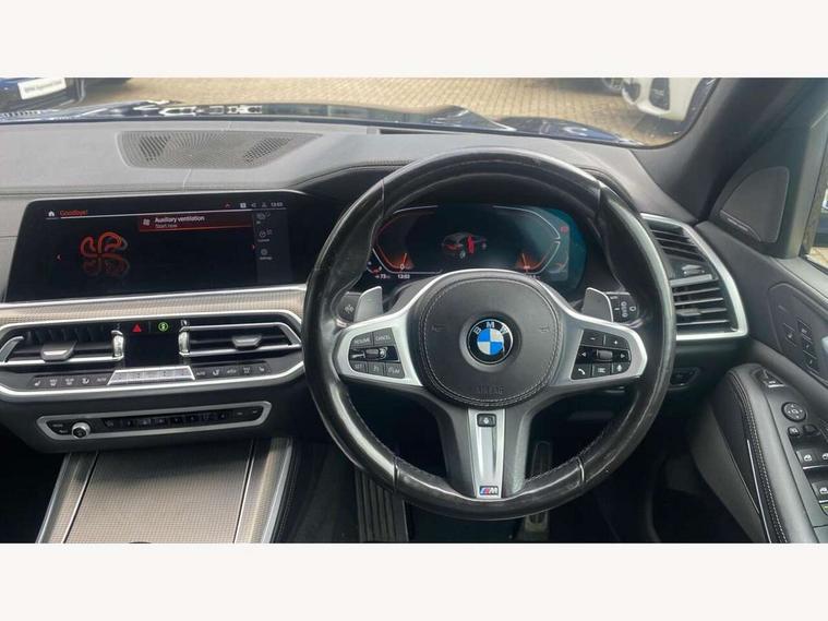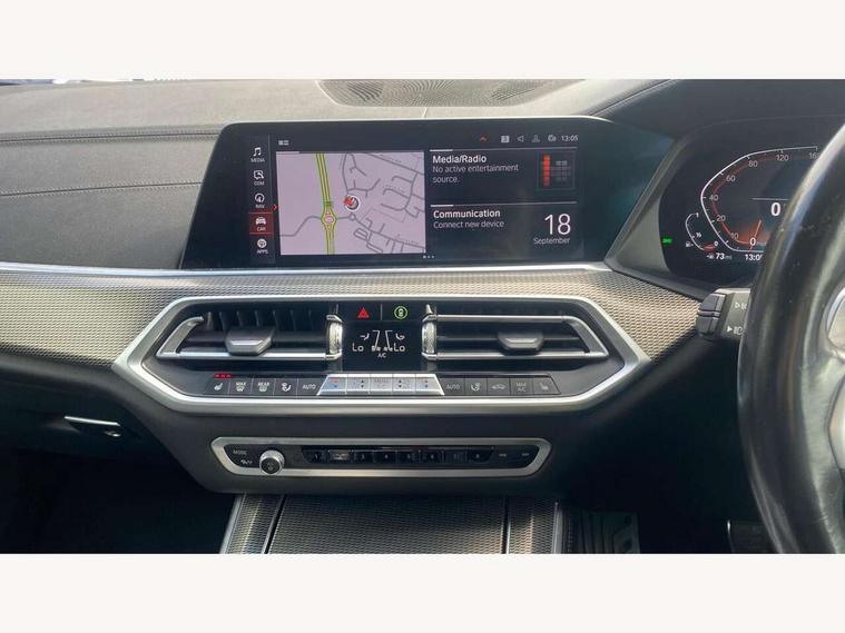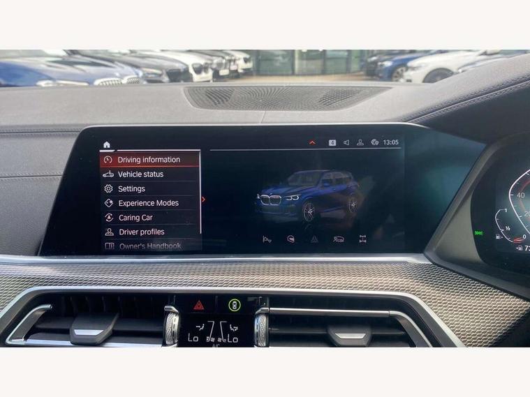 20GB hard disc drive (HDD) memory, Active guard plus, Attentiveness assist, Automatic tailgate with top hinged section open and manual bottom hinged section, BMW ConnectedDrive online services, BMW digital live cockpit professional - 12.3" digital instrument panel and 12.3" CID, with touch/voice command, BMW legal emergency call, BMW Teleservices, Brake force display, Brake pad wear indicator warning light, Enhanced bluetooth hands free facility with Telephony wireless charging, Front/rear park distance control, Galvanised plastic keyfob, iDrive touch controller with shortcut buttons, Infinity symbol with line graphic on reset of average consumption, Lights on warning, Oil sensor for level and grade, On board computer inc. average speed, fuel consumption, liquid crystal Info display, journey computer, outside temperature display, personal profile, Service interval indicator, Speed limit info display, Wi-Fi hotspot, 48V Mild hybrid technology, Adaptive 2-axle air suspension, Double VANOS, Double wishbone front axle, Drive performance control with ECO PRO comfort + sport mode, Eight speed steptronic sport automatic transmission and gearshift paddles on the steering wheel, High precision injection, Petrol Particulate Filter, Safety battery terminal clamp, Turbocharger with Valvetronic, DAB Tuner enables digital radio reception, Favourite buttons, USB connection, USB type A 1.5A in cupholder, USB Type C 3A in centre armrest, Active Air Stream kidney grille with high-gloss chrome, Adaptive air flap control bar in high-gloss black, Automatically dimming rear view mirror, BMW Individual high gloss black shadow line roof rails, Body colour bumpers, Body colour door handles, Dynamic brake lights with LED technology, Exhaust tailpipes - single, left and right with Chrome finisher, Follow me home headlight function, Front and rear electric windows with open and close fingertip control, anti trap facility and comfort closing, Heated windscreen washer jets, High beam assistant, High gloss black outer and central air intakes on front bumper with pearlescent chrome finish, High gloss black Side elements, LED daytime running lights, LED fog lights, LED rear lights, M aerodynamic body styling, M designation on left and right front side panels, Pearlescent chrome front grille bars, Rain sensor with automatic headlight activation and windscreen wiper control, Satin aluminium side window graphic, Third brake light in rear spoiler, Variable intermittent rear wash/wipe, Welcome light carpet, X5 on left tailgate, xDrive designation on right tailgate, 12V - Power sockets with 2x centre console and 1x luggage compartment, 40:20:40 split folding rear seats, Ambient interior lighting with 6 pre-designed selectable lights including dynamic function, Centre and rear interior light, Child seat ISOFIX attachment with rear outer seats includes top tether, Electric front seat adjustment with driver and front passenger memory function, Electrical steering column with adjustable height and length with activation and control on the steering column, Foldable rear centre armrest with 2 cupholders and storage compartment, Front and rear cupholders x 2, Front and rear door pockets, Front and rear door sill inlays with illuminated BMW M designation, Front and rear side armrest integrated into door trim, Front footwell lights, Front reading lights, Light inside glove compartment, Lockable glove compartment, Luggage compartment floor panel with integral storage tray, Luggage compartment lighting, M leather steering wheel, M specific key, M specific pedals, M specific steering wheel, M specific velour floor mats, Make-up mirror lights, Multifunction controls for leather steering wheel, Multifunctional hooks, Rear head restraints, Seat back with flap pocket, Securing rings in luggage compartment, Storage bins on all doors, Storage tray and compartment with cover in centre console, Sunvisors with illuminated vanity mirrors, Toolkit located in luggage compartment, Connected Package Professional - X5, Expanded exterior mirror pack - X5/X5 M, Non-smokers pack - X5, Airbags - driver/front passenger, rear and side, first and second row seats head airbags, front passenger seat airbag deactivation + knee airbag, Anti-lock braking system (ABS), Automatic Stability Control (ASC), Brake drying, Brake energy regeneration, Brake fade compensation, Braking pre-tensioning, Cornering brake control (CBC), Crash sensor activating central locking release, hazard warning lights, fuel cut off, interior lighting + activation of safety battery terminal clamp, Deformation zones - front and rear with door reinforcements and bumpers up to 2.5 mph, DSC - Dynamic Stability Control, Dynamic brake control, Dynamic Traction Control - DTC, Electromechanical parking brake with automatic drive away release and auto hold function, Electronic brake force distribution, Front and rear seatbelts with seatbelt stopper, seatbelt tensioner for front and outer rear seats and belt force limiter, Front head restraints with anti-whiplash, Height adjustable front seatbelts, Hill start assistant, Integrated brake system, M Sport braking system in blue high gloss + blue painted brake calipers with M designation, Mechanical child proof lock on rear doors, Passive protection for pedestrians, Seat occupancy detection for driver and passenger side, Side impact protection, Three 3 point inertia reel seatbelts, Two tone horn, Tyre pressure monitoring system, Ventilated front and rear disc brakes, Warning triangle and first aid kit, Closing system with central locking, Driver and front passenger door centre lock switch, Locking wheel bolts, Thatcham 1 alarm system with remote control and engine immobiliser, Start/stop toggle diamond shaped trim finisher in pearl chrome,