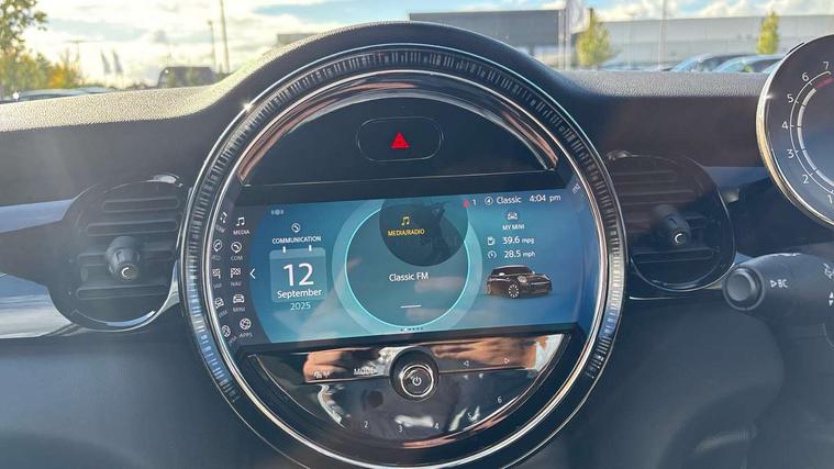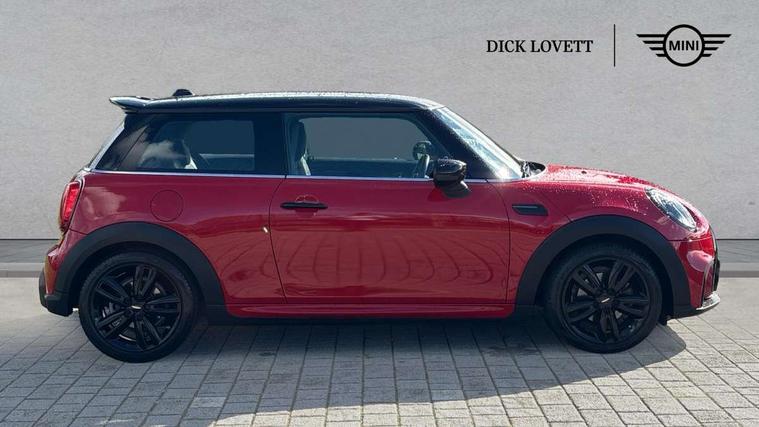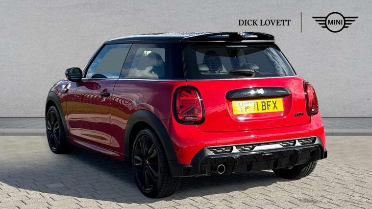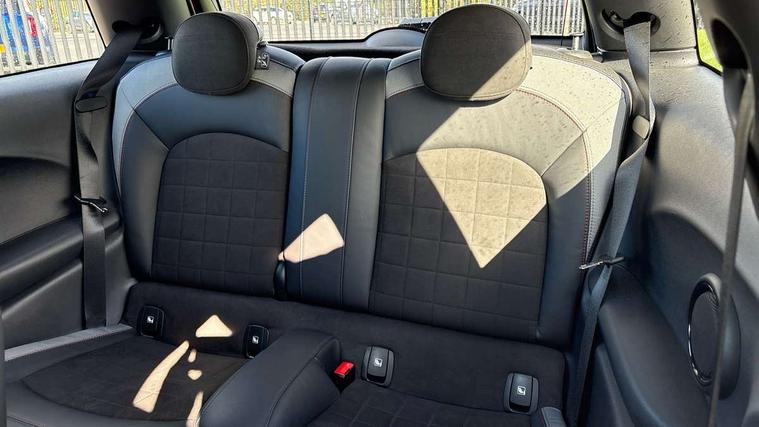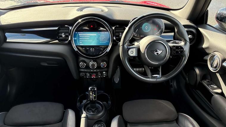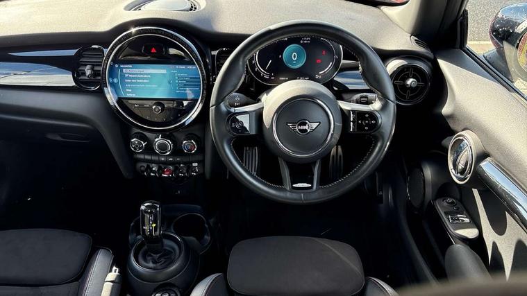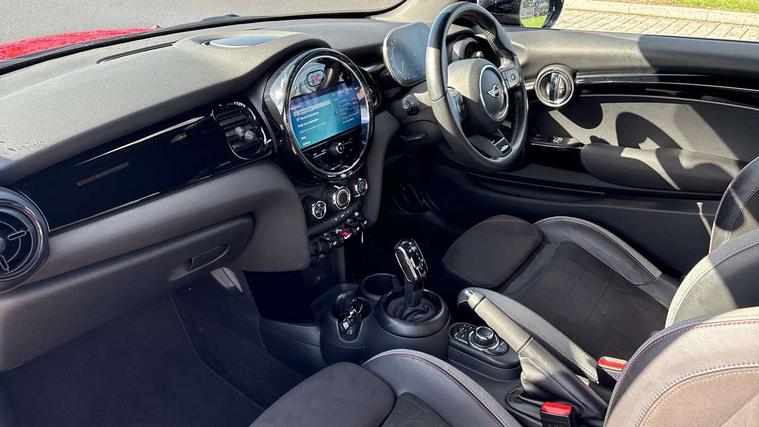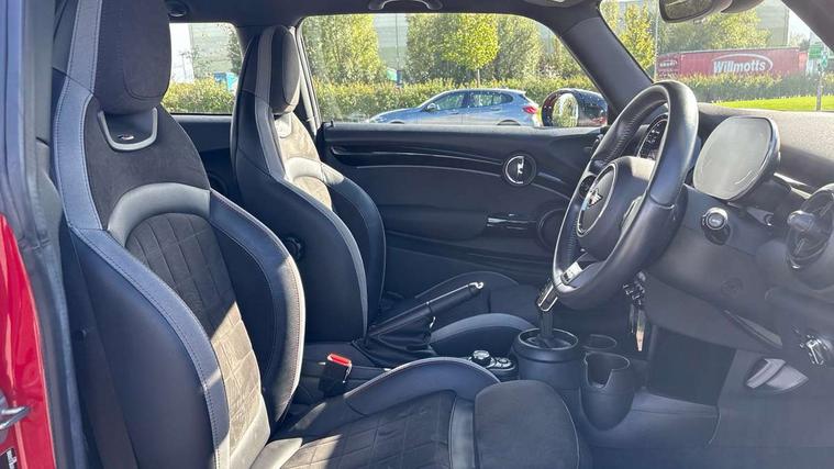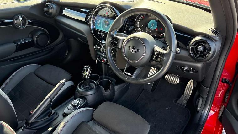 Automatic start/stop function with brake energy recuperation, Compatible mobile phone bluetooth with audio streaming, Cruise control with brake assist, Electro-mechanical speed dependant steering assistance, Flexible car sharing preparation, Instrument cluster, MINI Driving Modes - centre toggle switch to control driving setting (sport, mid and green), Mini E-call, MINI TeleServices, On board computer, Rear park distance control, Service interval indicator, Adaptive suspension, Double Vanos system, Fully variable valve control, High precision injection, Performance Control, Steptronic transmission with double clutch, 4 speakers in front door trims and underneath front seats, 8.8" touchscreen with LED ring, FM tuner and DAB digital radio, Automatic headlight activation switch, Body colour fuel filler cap, Chrome border high gloss black slats radiator grille, Dynamic brake lights, Electric front windows, Exhaust tailpipe on left with chrome finisher, Heated rear window, Heated windscreen washer jets, JCW Aerodynamic kit - Front and rear bumpers with sporty JCW styling and part-painted side sills with MINI John Cooper Works door sill finishers, John Cooper Works rear spoiler, LED headlight with closed ring and daytime driving lights, Metal door sill strips with MINI imprint, Model logo Cooper on right of tailgate, Rain sensor window wipers, Rear fog lights, Rear LED lights with union jack design, Rear window wiper, Side scuttle panel with integrated indicator, Sun/heat protection glass, White indicator lenses, 12V Accessory socket in centre console, 4 lashing eyes in luggage compartment, 60/40 split folding rear seat, Anthracite headliner including grab handles and clothes hooks, Carbon black colour line - Knee roll and door armrest, Chrome interior highlights, Cupholders, Front and rear isofix with front passenger airbag deactivation, Glove compartment, Height and length steering column adjustment, Interior lighting with 12 different colours across the dashboard, underneath door bezel with illuminated laser-engraved design on central display, JCW Sport seats with integrated headrests, adjustable thigh support and John Cooper Works logo, Leatherette gearshift lever and handbrake gaiters, LED reading lights, vanity mirror lights, front foot well light and spotlight on front seats, Manual air conditioning, Mechanical seat adjustment - forward/back & backrest for front seats and driver seat height adjust, Multifunction steering wheel, Passenger seat height adjuster, Storage compartments in doors, Sunvisors with vanity mirrors, Tool kit, Velour floor mats, Walknappa leather steering wheel with grey seam and John Cooper Works badge on Piano Black lower steering wheel spoke, Piano black exterior pack - Mini Hatchback Cooper, 3 point seatbelts on all four seats, 6 Airbags - front, side, head and seat belt tensioners, Anti-lock braking system (ABS), DSC - Dynamic Stability Control, Front and rear disc brakes, Single tone fanfare horn, Tyre pressure monitoring system, Alarm system with tilt sensor, monitoring doors, bonnet interior and tailgate, Electronic vehicle immobiliser, Start/stop toggle with keyless go, Piano black interior trim,