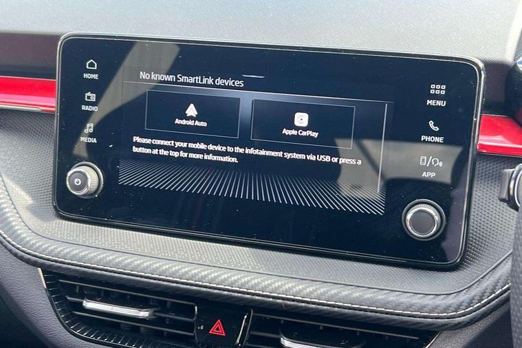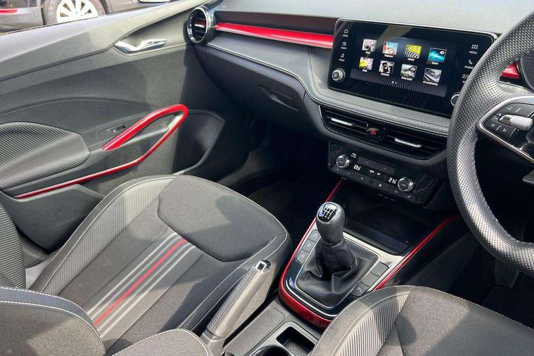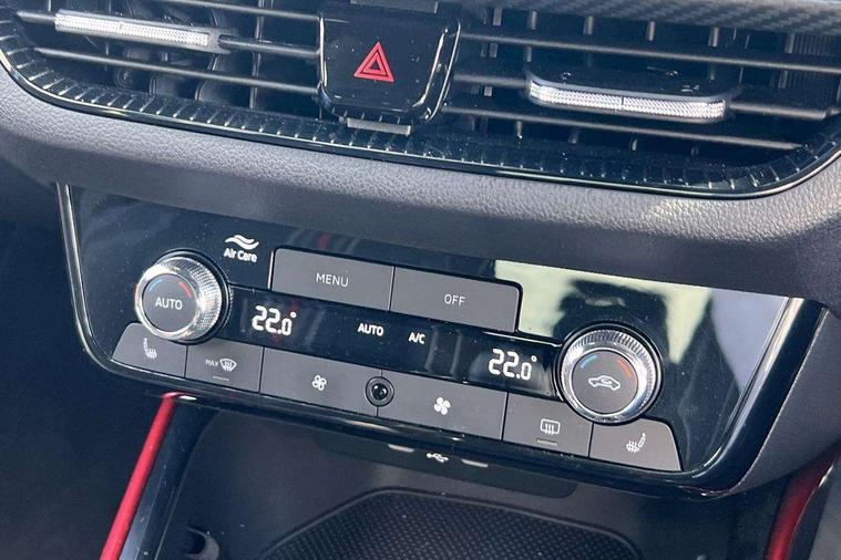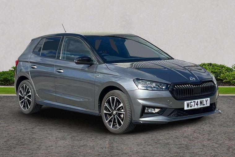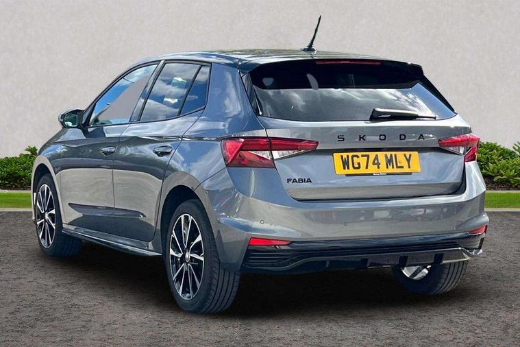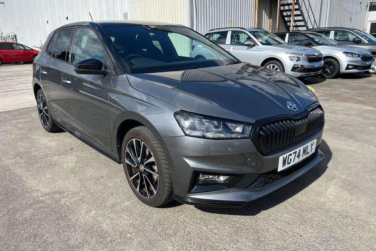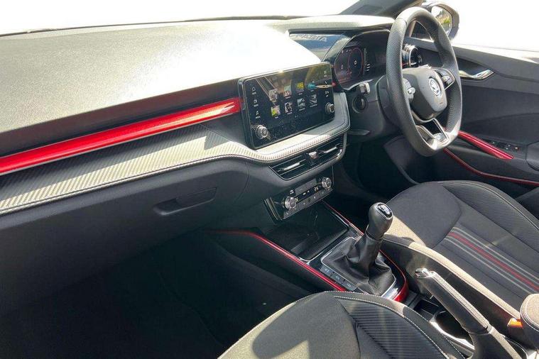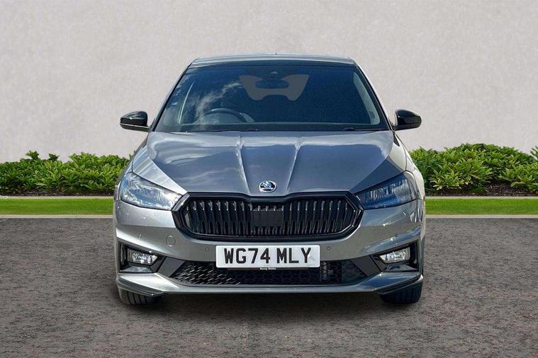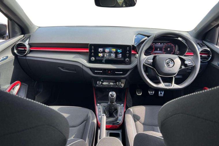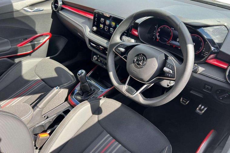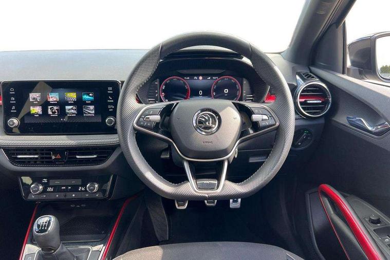Advanced driver attention and drowsiness monitor, Bluetooth connection, Electromechanical power steering, Exterior temperature gauge, Service interval indicator, Traffic sign recognition, Virtual cockpit with 10.25" colour display, Wireless SmartLink for Apple CarPlay and Android Auto, 6 Speakers (4 in front and 2 in rear), Auxiliary socket for external MP3 player, DAB digital radio reception, Auto dimming rear view mirror, Black radiator grille, Body coloured bumpers, Door mirror integrated indicators, Front and rear electric windows, Front window wiper intermittent control, Headlight range control - Automatic, Ice scraper in fuel cap, LED daytime running lights with coming and leaving home feature, LED rear lights, Monte Carlo badging, Privacy glass, Rear LED fog light, Rear side wing doors, Rear window wiper with washing nozzles, Roof mounted spoiler, SKODA tailgate lettering in black, Sports bumpers, Third brake light, 2 reading lights in front and 2 reading lights in rear, 3 rear headrests, Aluminium pedals, Backrest split and folding, Black headlining, Central console with removable cup holder and storage box, Chrome handbrake release button, Door sills with fabia badging, Dual zone air conditioning with climatronic electronic control, Fabric/artificial leather upholstery, Front centre armrest, Front sports seats, Gearshift knob/handle in leather, Hand brake lever handle in leather, Height adjustable front headrests, Height adjustable front seats, Height adjustable steering wheel, ISOFIX and TopTether anchorage points to the outer rear seats, ISOFIX and TopTether on the front passenger seat, Luggage compartment lighting, Manually adjustable lumbar support in front seats, Metallic painted red central console cover, Metallic red interior door handles, Pollen filter, Rear seat bench unsplit, Single front passenger seat, Sun visors with mirror and airbag label on passenger side, Textile floor mats, Ticket holder, Umbrella in drivers door, 3-point height adjustable front seats belts with pretensioner and force limiter, Automatic warning lights in case of crash, Driver and passengers airbag with switch off function, e-Call+, ESC including ABS, MSR, ASR, EDS, HBA and XDS, Front and rear seat belt warning, FRONT ASSIST (AEB City and AEB Inter Urban), Front side airbags, Head airbags, One tone horn, Pedestrian protection, Three rear 3-points safety seat belts with pretensioner and force limiter including stop function for outer rear seat belts, Tyre pressure monitoring system, Anti-theft alarm system including immobiliser, interior monitoring, backup horn, and towing protection, Central locking with radio remote control, interior controls, SAFE function and 2 foldable keys, Carbon effect door and side trim panels, Carbon effect lower decorative trim with white stitching, Monte carlo air vents, Red metallic upper decorative trim, Anti-theft wheel bolts protection, Super-low rolling resistance tyres,