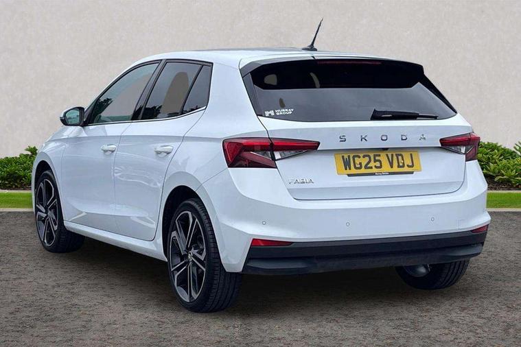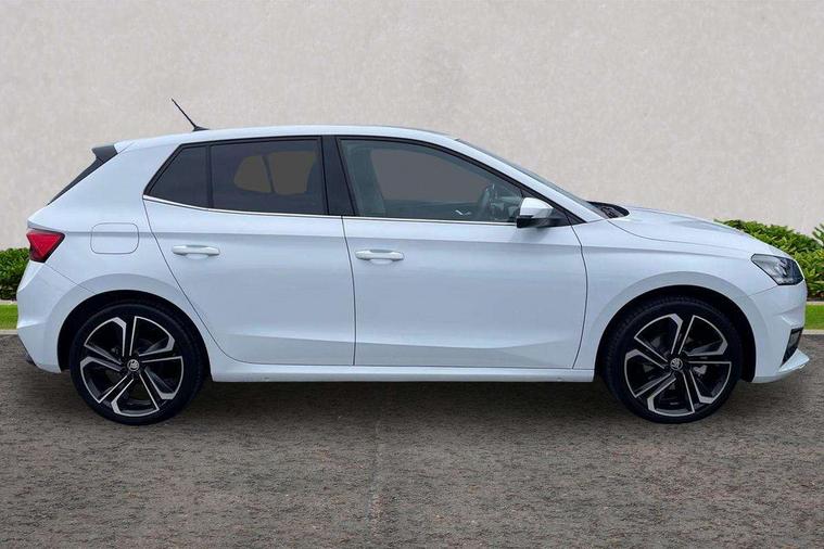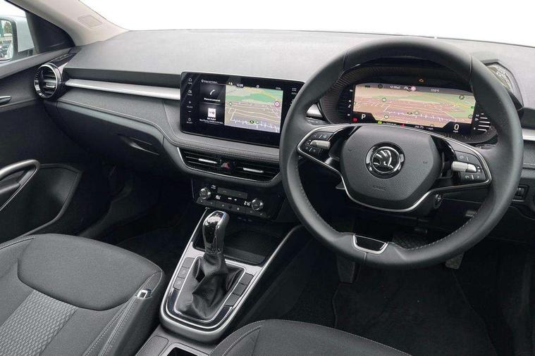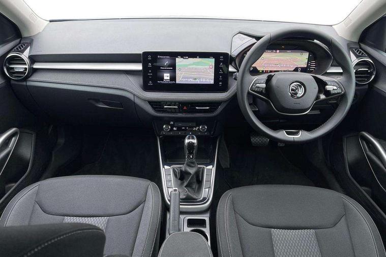 Advanced driver attention and drowsiness monitor, Bluetooth connection, Electromechanical power steering, Exterior temperature gauge, Service interval indicator, Traffic sign recognition, Virtual cockpit with 10.25" colour display, Wireless SmartLink for Apple CarPlay and Android Auto, 6 Speakers (4 in front and 2 in rear), 9.2" colour display skoda navigation system with voice control and web radio, Auxiliary socket for external MP3 player, DAB digital radio reception, Auto dimming rear view mirror, Body colour door mirrors, Body coloured bumpers, Chrome window surround, Door mirror integrated indicators, Front and rear electric windows, Front window wiper intermittent control, Headlight range control - Automatic, Ice scraper in fuel cap, LED daytime running lights with coming and leaving home feature, LED rear lights, Privacy glass, Rear LED fog light, Rear side wing doors, Rear window wiper with washing nozzles, Roof mounted spoiler, SKODA tailgate lettering in chrome, Third brake light, Unique dark chrome design logo on alloy wheels, 2 LED reading lights in front and rear, 3 rear headrests, Backrest split and folding, Central console with removable cup holder and storage box, Chrome handbrake release button, Comfort seats, Door sills with fabia badging, Dual zone air conditioning with climatronic electronic control, Fabric upholstery, Front centre armrest, Gearshift knob/handle in leather, Hand brake lever handle in leather, Height adjustable front headrests, Height adjustable front seats, Height adjustable steering wheel, ISOFIX and TopTether anchorage points to the outer rear seats, ISOFIX and TopTether on the front passenger seat, Luggage compartment lighting, Manually adjustable lumbar support in front seats, Metallic grey interior door handles, Pollen filter, Rear seat bench unsplit, Single front passenger seat, Skoda lettering on steering wheel, Storm grey headlining, Sun visors with mirror and airbag label on passenger side, Textile floor mats, Ticket holder, Umbrella in drivers door, 3-point height adjustable front seats belts with pretensioner and force limiter, Automatic warning lights in case of crash, Driver and passengers airbag with switch off function, e-Call+, ESC including ABS, MSR, ASR, EDS, HBA and XDS, Front and rear seat belt warning, FRONT ASSIST (AEB City and AEB Inter Urban), Front side airbags, Head airbags, Hill hold control, One tone horn, Pedestrian protection, Three rear 3-points safety seat belts with pretensioner and force limiter including stop function for outer rear seat belts, Tyre pressure monitoring system, Anti-theft alarm system including immobiliser, interior monitoring, backup horn, and towing protection, Central locking with radio remote control, interior controls, SAFE function and 2 foldable keys, Black painted air vents, Metallic grey central console cover, Metallic grey upper decorative trim, Satin black door and side trim panel in front, Textile microsuede grey lower decorative trim with art grey stitching, Anti-theft wheel bolts protection, Super-low rolling resistance tyres,