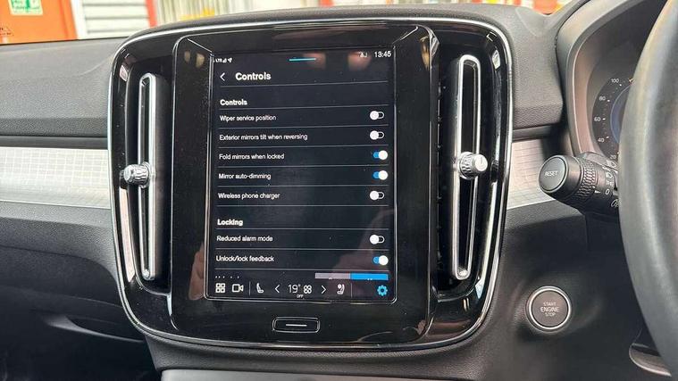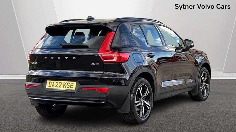 12.3" Progressive Driver Display, 9" centre console portrait touch screen, Adjustable steering wheel force, Bluetooth hands free telephone kit, E-call, eCall emergency call system, Front park assist, Google automatic services - Nav with google maps, apple carplay/android auto, voice recognition with google assistant, Hands free power tailgate, Lane keep assist with driver alert control, Oncoming Lane Mitigation, Rear park assist, Speed limiter, Speed sensitive steering, Wireless/Inductive Mobile Phone Charging, Dynamic chassis, DAB Digital radio, High performance sound, 8 speakers/250W, front USB and 2 rear type C USB, Steering wheel mounted remote controls, Adaptive brake lights with high level LED brake lights, Auto dimming interior mirror, Automatic headlamp levelling, Automatic LED Headlights + Active high beam incorporating daytime running lights, Front aluminium tread plates, Front and rear electric windows, High gloss black front and rear skid plate, High gloss black mesh front grille with high gloss black surround, High gloss black window trim, Home safe and approach lighting, Integrated roof rails in high gloss black, LED front fog lights, Puddle lights, Rain sensor with automatic windscreen wiper activation, Rear side wing doors, Rear wiper, Roof antenna, Roof spoiler, Visible VIN plate, 12V socket in front tunnel console and luggage compartment, 2-Zone electronic climate control with CleanZone air quality system and pollen filter, 3 seat bench in 2nd row, 60/40 versatile split folding rear seat, A-pillar parking ticket holder, Ambient front door and instrumental panel lighting, Centre console cupholders and storage, Flexible load floor and grocery bag holder, Floor mats, Front door pocket and front cupholder illumination, Front footwell illumination, Front headrests, Front reading light and theatre lighting, Front seat cushion extensions, Front tunnel pocket, Glovebox bag hook, Height adjustable passenger seat, Height/reach adjustable steering column, Height/tilt adjustable driver's seat, High gloss centre tunnel deco, Illuminated glovebox, Illuminated luggage compartment, Illuminated tailgate, Illuminated vanity mirrors, Integrated waste bin, Isofix attachments on outer rear seats, Load protection net, Multi directional lumbar support, Power driver seat with memory + exterior mirrors memory, Rear armrest / integral cup holders / storage tray, Rear headrests, Rear reading and courtesy lights, Single front passenger seat, Underfloor cargo storage, Climate pack - XC40, 3x3 point rear seatbelts, City safety includes pedestrian, cyclist and large animal detection and front collision warning with full auto brake, Drivers knee airbag, Dual stage driver/passenger airbags, Electronic parking brake with auto hold, First aid kit, Front and outer rear seatbelt reminder and pretensioners, Front seats SIPS airbags, Hill descent control, Hill start assist, Inflatable curtain, Passenger airbag cut-off device, Power child locks on rear doors, Road sign information display, Run off Road Mitigation, Run off Road Protection, SIPS (Side Impact Protection System), Slippery road and hazard light alert, Stability and Traction Control with Spin control, Engine Drag Control and Corner Traction Control, Tyre pressure monitoring system, Vehicle deceleration control with Anti-lock Brake System, Electronic Brake Distribution and Emergency Brake Assist, Warning triangle, WHIPS whiplash protection system - front, Anti-theft alarm including immobiliser/volume sensor + level sensor, Care key with user defined top speed, Key integrated remote control central locking + fuel flap with deadlocking system and auto open/close power windows, Keyless drive plus handsfree tailgate opening/closing, Locking wheel nuts, Private locking for tailgate,
