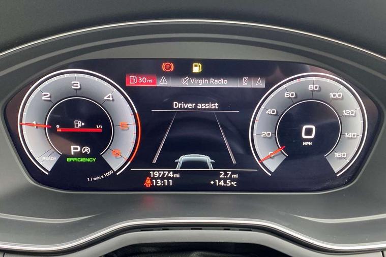 Audi connect safety and service (e-call), Audi drive select (Auto, Comfort, Dynamic, Efficiency and Individual), Audi smartphone interface, Audi virtual cockpit - 12.3" full colour digital instrument cluster, vehicle/engine speed, Radio/media information+Driver assistance systems, Automatic start-stop system with coasting functionality and efficiency programme, Bluetooth interface, Camera based traffic sign recognition, Electro-mechanical power steering, Email, calendar and text messages displayed via MMI, Front and rear parking sensors, Lane departure warning, MMI nav+ with MMI touch - 10.1" high resolution MMI display, touch sensitive, 3D map, route/country info, dynamic route guide, personal route assist, Power operated tailgate, Rear view camera, Service interval indicator, Voice control system, Comfort dynamic suspension, Diesel particulate filter, 8 passive loudspeakers, CD player, DAB digital radio reception, Two additional USB ports for rear passenger in rear centre console, Two SDXC card slots, Auto dimming door mirrors, Auto dimming rear view mirror, Body colour bumpers, Body colour door handles, Body colour side sill trim, Body coloured door mirrors, Electric adjustable heated door mirrors, Electric folding door mirrors, Electric front windows, Front fog lights, Kerb-view function for passenger side, LED headlights and rear lights with LED daytime running lights, LED side indicator lights integrated into door mirrors, LED third brake light, Matt aluminium silver tailpipe trim, Radiator grille in matt anthracite black and air inlets with inserts in matt aluminium silver, Rain and light sensors, Rear diffuser in matt anthracite black with trim strip in matt aluminium silver, Rear side wing doors, Rear wiper, Sport front and rear bumpers with side skirts, Variable front intermittent wipers, Windscreen with acoustic glazing, 3 seat bench in 2nd row, 3 spoke high multi-function leather sport steering wheel with paddle shift and height and reach adjustable, 4 way electric lumbar support for driver and front passenger, 40/20/40 split folding 3 seater rear bench seat, Deluxe 3 zone electronic climate control, Door sill trims with aluminium inlay, Front centre armrest, Front head restraints, Front/rear floor mats, Heated front seats, ISOFIX child seat mounting and top tether, Luggage compartment mat, Manual seat adjustment, Rear centre armrest, Rear headrests, Single front passenger seat, Sunvisors with vanity mirrors, Twin leather upholstery + front sports seats, LED interior light pack - A5/RS5, 3x3 point rear seatbelts, 6 airbags - Driver, front passenger, curtain and side airbags, Attention and drowsiness assist, Electromechanical parking brake, Electronic Stabilisation Control (ESC) including ABS, ASR and EDL, Front passenger airbag deactivation, Height adjustable front seatbelts, Hill hold assist, Manual child lock in rear doors, Multi collision brake assist, Pop-up bonnet for pedestrian protection, Pre sense city, Seatbelt monitoring, Tyre pressure warning, Variable restraint system, Warning triangle and first aid kit, Anti theft alarm system, Anti theft wheel bolts, Immobiliser, Keyless Go, Remote central locking, Aluminium ellipse silver inlays, Tool kit, Tyre repair kit,