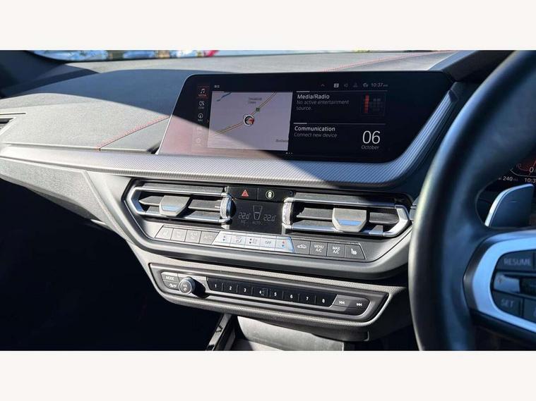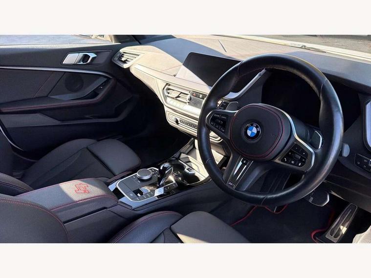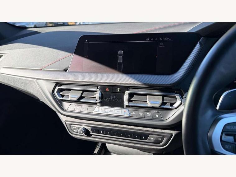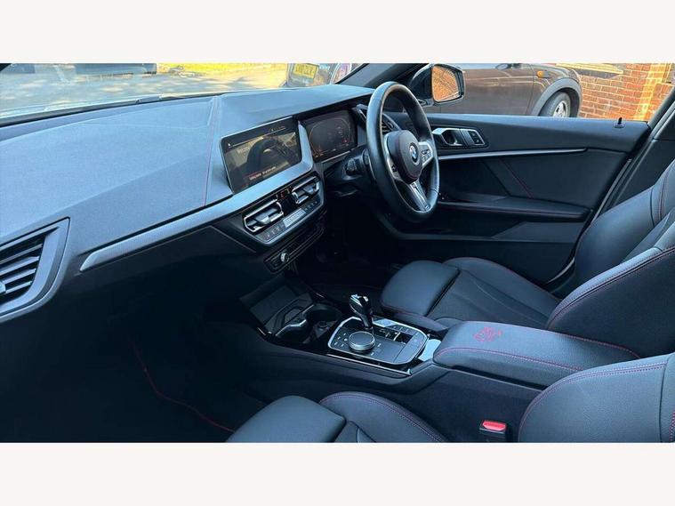 Active guard plus, Attentiveness assist, BMW ConnectedDrive online services, BMW Teleservices, Check Control warning system for monitoring of lights and door/luggage compartment open warning, Cruise control with brake assist, Eco pro mode, Electric power steering with Servotronic steering optimised at all speed ranges, Front axle single joint with specific axle kinematics to minimise drive influences on steering + provide increased rigidity agile driving behaviour, Integrated owners handbook, Lane departure warning system, Oil sensor for level and grade, On board computer, Optimum shift indicator, Personal Profile, Pull away assistant, Rigidly mounted rear subframe - Multi link construction with separate spring / damper configuration and excellent driving characteristics, Speed limit Info including no-overtaking indicator, Speed limiter, Aluminium lightweight construction, Anti roll bar front and rear, Balancer shaft, Double VANOS twin scroll turbocharging system, Drive Performance Control, Eight speed sport automatic transmission with gearshift paddle switches, Electronic differential lock, High precision injection, Larger fuel tank capacity (50 litres), M sport suspension with M128i xDrive specific settings, Petrol Particulate Filter, Twin tube gas filled shock absorbers with degressive characteristic curve, VALVETRONIC engine management, DAB Digital radio, Auto dimming rear view mirror, Automatic headlight beam throw control, Automatic windscreen wipers and automatic headlight, Black chrome tailpipe finishers, BMW individual high gloss shadow line with extended content, Body colour door handles, Body colour mirror caps, Body colour roof trims, Chrome 'M' logo side designation, Chrome kidney grille frame with Satin Aluminium struts, Direction indicator side lights in exterior mirrors, Fading support, Folding side mirrors with auto dimming/folding wing mirrors with auto dimming, Follow me home headlights, Front and rear bumper system with replaceable deformation elements, Front and rear electric windows with open and close fingertip control, anti trap facility and comfort closing, Front door sill finishers in black plastic with M designation in metallic look, Green tinted heat protection glazing, Heated, electrically adjustable exterior mirror aspheric on driver side, convex on passenger side, High gloss shadowline window frame, Recess cover mirror frames and B/C pillar embelisher trim, High level third brake light, Integrated front windscreen with washer jets, Kidney frame and struts in high gloss black extended, LED daytime running lights, LED eyebrow turn indicators, LED front fog lights, LED Headlights, Lightweight engineering, Matt black air guide grilles, Matt black wheel arch trim, Model designation on electric bootlid, Nearside reverse light in rear light cluster, Preparation for high beam assistant, Rear fog lights, Rear side wing doors, Rear window wiper, Shark fin antenna, Trailer stabilisation logic, Visible VIN plate, Welcome lighting, 12V power socket in front centre console with blanking plug, 3 rear seat head restraints, 3 seat bench in 2nd row, Anthracite headlining, Black boot net with lashing eyes, Cargo function on 2nd seat row, Centre armrest in black/red highlight including embroidered 'ti' designation in red, Child seat ISOFIX attachment for two outer rear seats and front passenger seat with anchorage points, Conditioned based service, Driver and front passenger seat heating, Floor mats with red binding, Folding rear clothes hook, Four grab handles integrated in roof lining, Front and rear door pockets with bottle holders, Front and rear side armrest integrated into door trim, Front armrest, Front sports seats, Glove compartment, Height adjustable front head restraints, Instrument panel top section , door armrests and door panels in black/red highlight, Luggage compartment for bag hooks on left and right, foldable luggage compartment liner and four lashing eyelets, Manual adjust steering wheel, Multi-function controls for steering wheel, Single front passenger seat, Storage compartment in centre console, Sun visors with vanity mirrors and insert tab, Three spoke M sport design multi function leather steering wheel in unique red stitching, Two front centre console cupholders, Two zone automatic air conditioning, Additional interior lighting pack - 1 Series, BMW live cockpit professional pack- 1 Series, Connected pack professional - 1 Series, Interior lights pack - 1 Series, M Sport exterior styling aerodynamics pack - 1 Series, 2 tone horn, 3 point seatbelts on all seats, front pyrotechnic belt tensioners, stopper and belt force limiters, rear coded belt buckles, Airbags - Front driver/passenger, front and rear curtain head protection, front side, manual deactivation of front passenger airbag, Anti lock braking system (ABS) with brake assist, BMW emergency call, Brake drying, Braking readiness, Child proof locking system in rear door, City braking function, Comfort modes, Cornering brake control, Crash sensor activating central locking release, hazard warning lights, fuel cut off, interior lighting + activation of safety battery terminal clamp, Driver and front passenger seat belt security check, Dynamic stability control + (DSC+), Dynamic Traction Control - DTC, Electrically operated hand brake including automatic hold function, Front and rear disc brakes, M Sport brakes with red calipers, M Sport seatbelts, Seatbelt warning, Side impact protection, Tyre pressure monitoring system, Warning triangle and first aid kit, Central locking switch for all doors, fuel filler cap and luggage compartment, Deadlocking function system to all doors, Drive away locking system on all doors and luggage compartment with de-activated in iDrive settings, Locking wheel bolts, Remote control with integrated key with High-gloss Black inlay and M designation and 1 button for open/ close lock, window, open luggage compartment, Start/stop button illuminated in centre console with keyless e