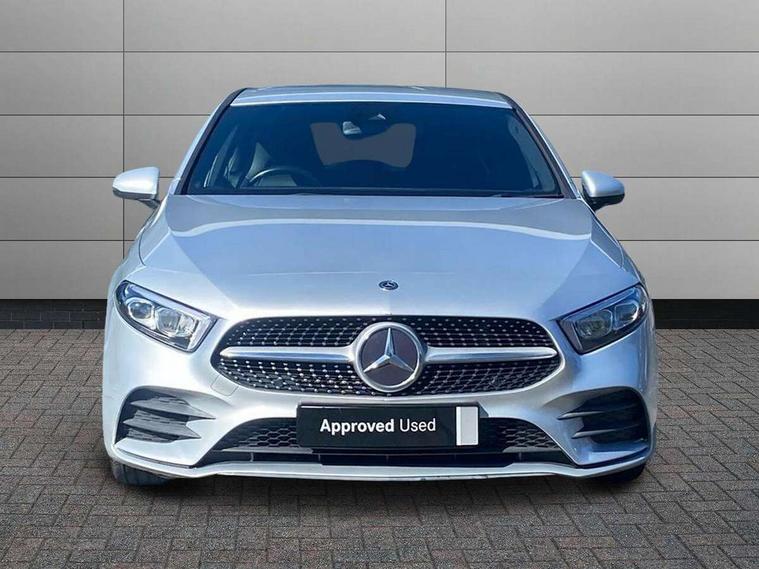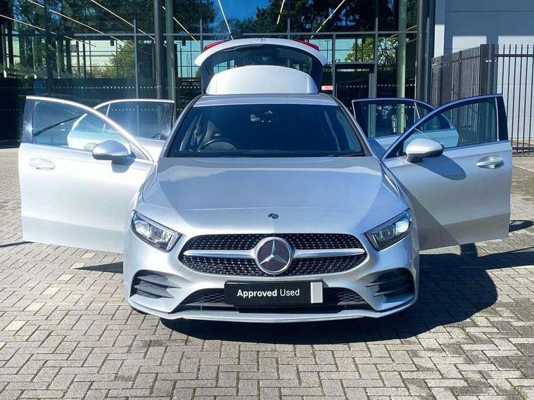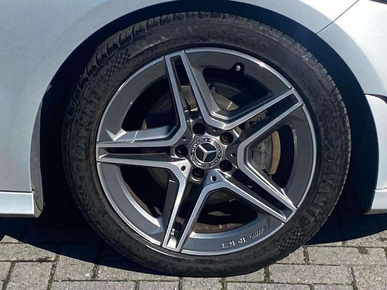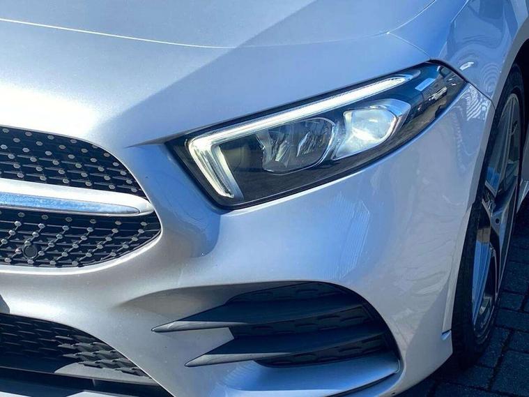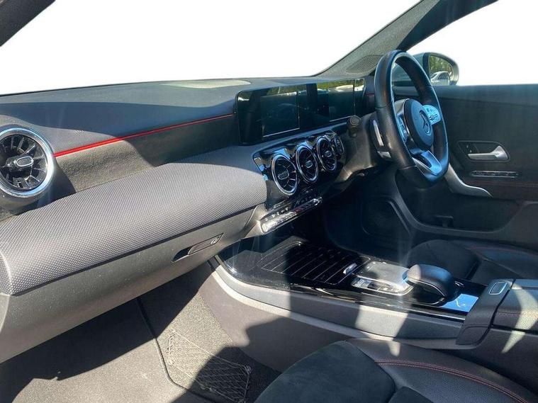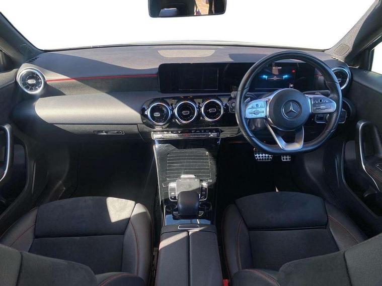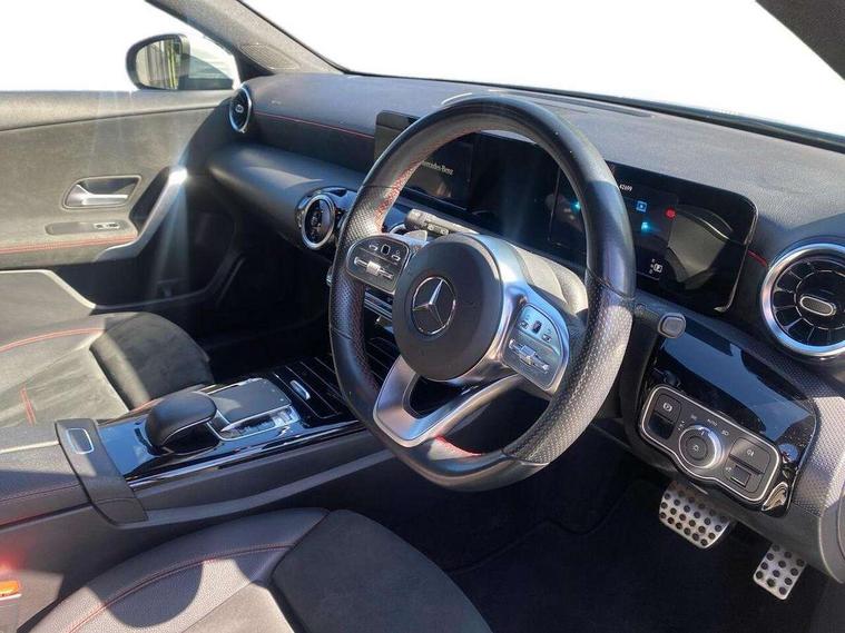 7" colour screen in instrument panel, 7" tablet style colour display, Active lane keep assist, Attention assist, Bluetooth interface for hands free telephone, Bulb failure indicator, Cruise control + speed limiter, Direct steering, DYNAMIC SELECT with a choice of driving modes (ECO, Comfort, Sport, Sport+ and Individual), External temperature gauge, HDD Navigation system, Low fluid warning light, Mercedes connect me with remote online services, Radio aerial integrated into roof spoiler, Reversing camera, Service indicator (ASSYST PLUS), Speed sensitive power steering, Stop/start system, Trip computer, Voice control system, Warning lamp for direction indicators, Lowered comfort suspension, 2 USB ports in centre console, DAB Digital radio, MBUX Multimedia system including digital instrument cluster and phone mirroring, Adaptive brake lights, AMG body styling, Body colour bumpers, Body colour door handles, Body colour side skirt, Body coloured door mirrors, Chrome beltline trim, Diamond radiator grille with chrome pins and silver louvre + chrome insert, Electric adjustable heated door mirrors, Electric front windows, Electric rear windows, Headlamp assist, Heated rear window with timer, High level third brake light, LED daytime running lights, LED Headlights, LED rear lights, Rain sensor windscreen wipers, Rear fog lights, Rear wiper, Twin Trapezoidal tailpipes, 1/3 to 2/3 split folding rear seats, 12V socket, 3 spoke flat bottomed nappa leather sport steering wheel, AMG floor mats with red stitching, Artico man-made leather/Dinamica upholstery, Auto Mercedes-Benz child seat recognition sensor, Black headlining, Brushed stainless steel sports pedals with rubber studs, Controller on centre console with chrome surround, Dual zone automatic climate control, Exit lights, Footwell lights, Front and rear reading lights, Front centre armrest with storage compartment, Front door sills with Mercedes Benz lettering, Front head restraints, Front seat backs luggage nets, Front sport seats, Gearshift paddles on steering wheel, Height adjustable front seats, Height/reach adjustable steering column, Illuminated cup holders, Illuminated glovebox, Illuminated storage compartment, Integrated head restraints, Interior door handle illumination, Isofix rear child seat preparation, Load securing rings in luggage compartment, Luggage compartment cover, Multifunction steering wheel, Oddments tray lighting, Reading lights, Rear head restraints, Storage compartment under load area floor, Sunvisors with illuminated vanity mirrors, Touchpad, Twin front cupholders, Seat comfort pack - A Class, 3 rear 3 point seatbelts, ABS with Brake Assist, Active bonnet, Brake calipers with Mercedes-Benz lettering + perforated brake discs, Child proof door locks, Crash responsive emergency lighting, Drivers knee airbag, Dual stage driver/passenger airbags, Electronic parking brake, ESP with ASR, Front and rear seatbelt reminder, Front head airbags, Front passenger seat occupancy sensor, Front side airbags, Hill start assist, Tyre pressure monitoring system, Warning triangle and first aid kit, Window airbags, Alarm system/interior protection/immobiliser, Keyless ignition, Remote central locking, Chrome air vent surrounds, 18" AMG 5 twin spoke light alloy wheels in titanium grey with highsheen finish, Tirefit sealant with electric air pump,