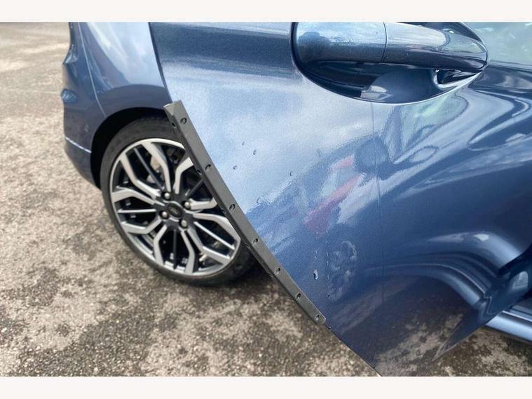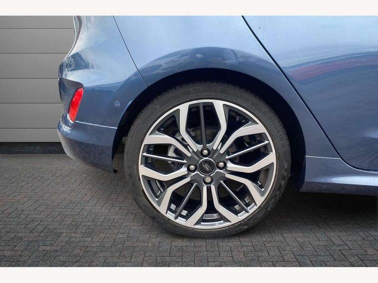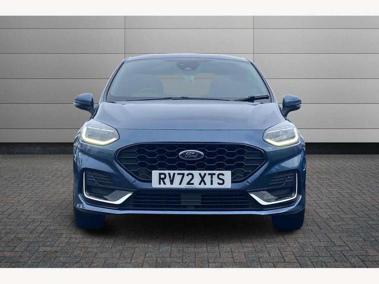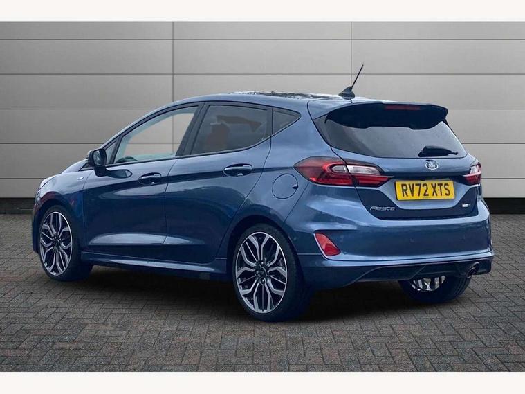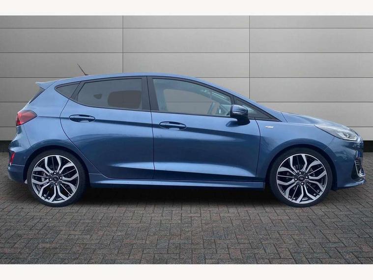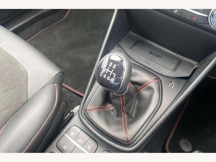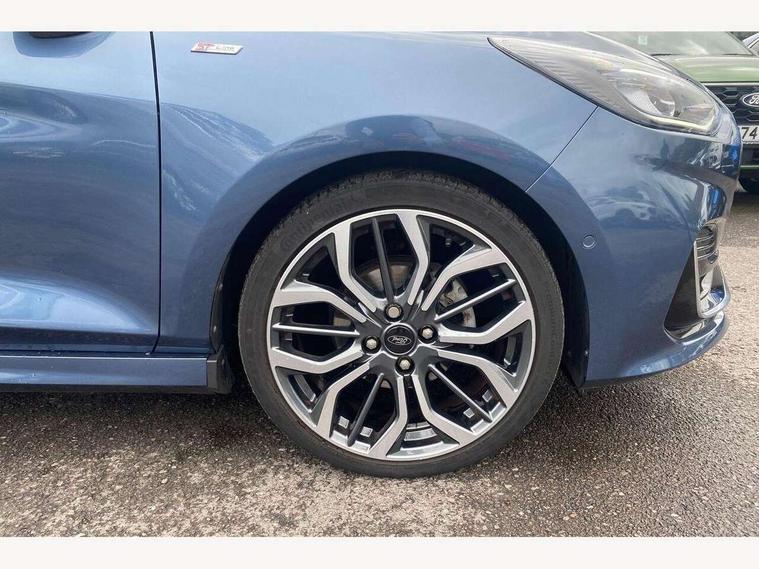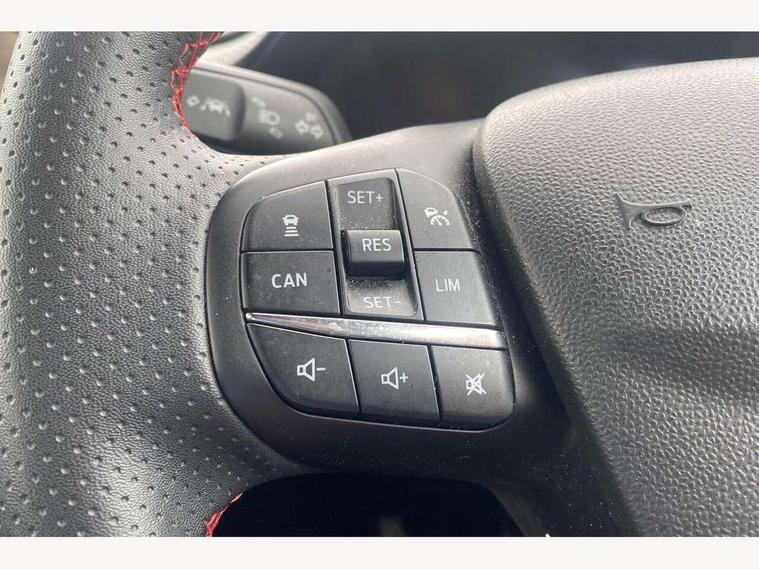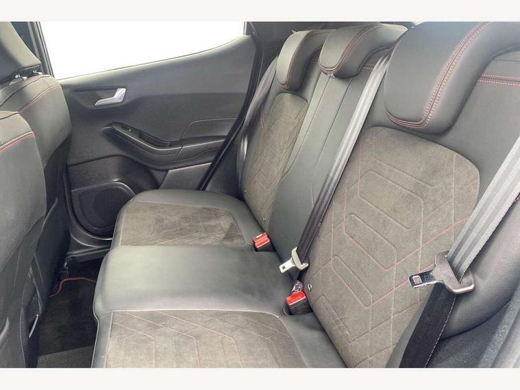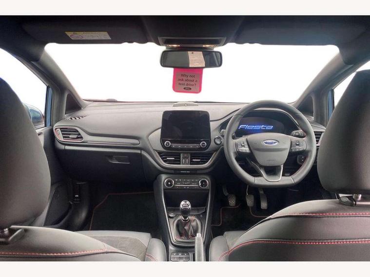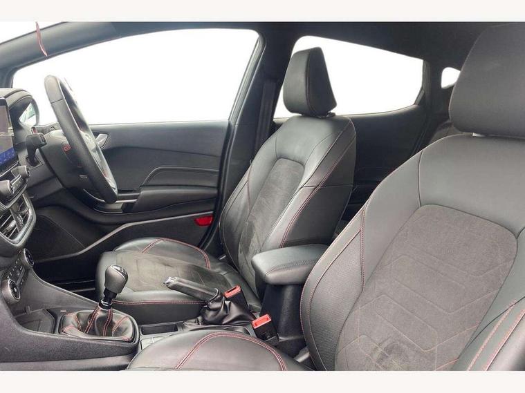 12.3" Full digital cluster, Driver alert system, Electric power steering, Ford easy fuel, Ford SYNC 3 Nav with DAB radio, 8" touch screen, voice control, emergency assist, Apple CarPlay/Android auto, 2x USB, 6 speaker, Ford pass connect, Rear parking distance sensors, Rear view camera, Selectable drive modes (Normal, Sport, Track), Speed sign recognition, Trip computer, Wrong way alert, Sports suspension, Auto high beam, Body colour bumpers, Body colour large rear spoiler, Body coloured electrically operated with side indicators, Electric front windows/one touch facility, Front unique ST scuff plates, LED Night signature to rear lights, LED third brake light, Quickclear heated windscreen, Rain sensing wipers and auto dimming rear view mirror, Rear privacy glass, Rear side wing doors, Rear wiper, Unique ST-Line upper grille & full bodystyling kit with ST-Line wing badges, 3 seat bench in 2nd row, 4 way manually adjustable passenger seat, Adjustable head restraints, Black headlining, Centre console with opening armrest, 2x cupholders, 12v and USB, Drivers and Passenger lumbar support, EATC - Electronic Auto Temperature control, Front floor mats in velour, Leather gaiter, LED ambient lighting, Manual 4-way driver seat adjust, Sensico partial premium leather upholstery with red stitching, Sensico wrapped steering wheel, Single front passenger seat, NCAP Pack - Fiesta, Winter pack [GTBAB]- Fiesta, 3 point seatbelts on all rear seats, Electronic stability control with hill start assist, Manual child lock in rear doors, Tyre pressure monitoring system, Ford keyfree system with Keyless entry and keyless start, MyKey system, Remote central locking, Thatcham alarm with power door dead locks, 18" 5x2 spoke alloys with pearl grey machined finish,