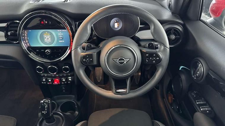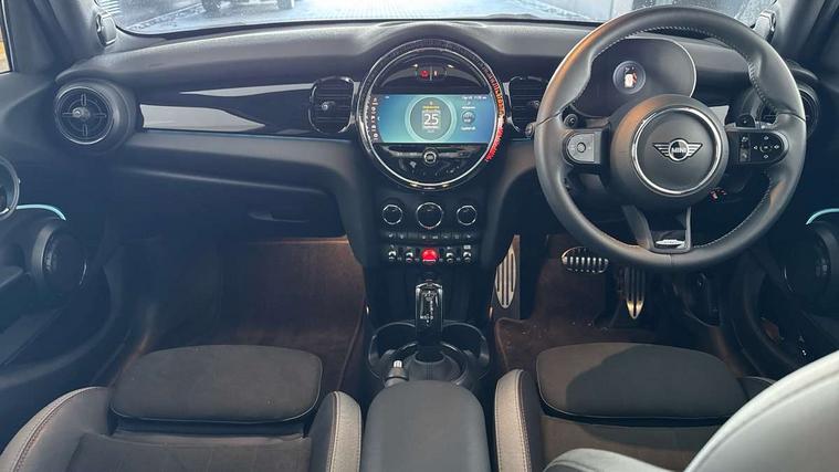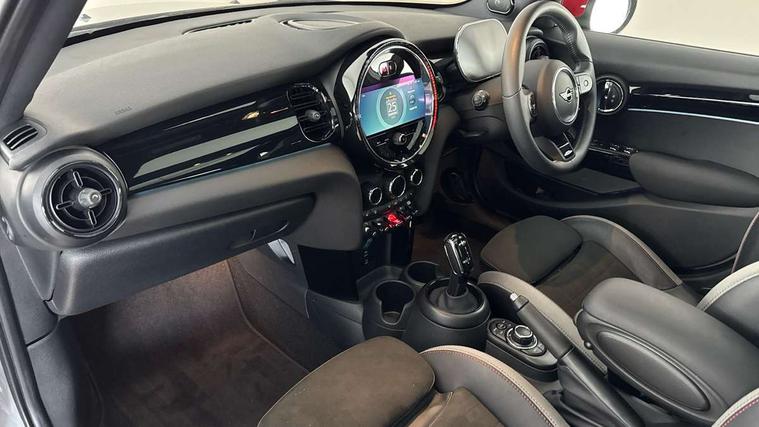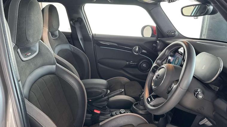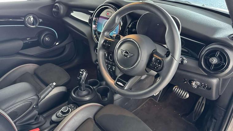 Apple CarPlay, Automatic start/stop function with brake energy recuperation, Compatible mobile phone bluetooth with audio streaming, Electro-mechanical speed dependant steering assistance, Flexible car sharing preparation, MINI Driving Modes - centre toggle switch to control driving setting (sport, mid and green), Mini E-call, MINI TeleServices, On board computer, Rear park distance control, Service interval indicator, Adaptive suspension, Double Vanos system, Fully variable valve control, Gear change indicator display, High precision injection, Performance Control, Steptronic sport transmission with double clutch and steering wheel paddles, 8.8" touchscreen with LED ring, FM tuner and DAB digital radio, 3rd brake light, Automatic headlight activation switch, Bonnet scoop, Dynamic brake lights, Electric front+rear windows, Heated rear window, Heated windscreen washer jets, JCW Aerodynamic kit - Front and rear bumpers with sporty JCW styling and part-painted side sills with MINI John Cooper Works door sill finishers, John Cooper Works rear spoiler, Metal door sill strips with Cooper S imprint, Model logo Cooper S on right of tailgate, Radiator grille chrome border with honeycomb structure including S Badge, Rain sensor window wipers, Rear fog lights, Rear LED lights with union jack design, Rear side wing doors, Rear window wiper, Side scuttle panel with integrated indicator, Sun/heat protection glass, Two central exhaust tailpipes with chrome finisher, White indicator lenses, 12V Accessory socket in centre console, 3 seat bench in 2nd row, 4 lashing eyes in luggage compartment, 60/40 split folding rear seat, Anthracite headliner including grab handles and clothes hooks, Carbon black colour line - Knee roll and door armrest, Chrome interior highlights, Cupholders, Front and rear isofix with front passenger airbag deactivation, Front and rear velour floor mats, Glove compartment, Height and length steering column adjustment, Interior lighting with 12 different colours across the dashboard, underneath door bezel with illuminated laser-engraved design on central display, JCW Sport seats with integrated headrests, adjustable thigh support and John Cooper Works logo, Leatherette gearshift lever and handbrake gaiters, LED reading lights, vanity mirror lights, front foot well light and spotlight on front seats, Mechanical seat adjustment - forward/back & backrest for front seats and driver seat height adjust, Multifunction steering wheel, Single front passenger seat, Sport leather steering wheel with speed limiter and audio/communication controls, Storage compartments in doors, Storage pocket on back of front seats, Sunvisors with vanity mirrors, Tool kit, Walknappa leather steering wheel with grey seam and John Cooper Works badge on Piano Black lower steering wheel spoke, Piano black exterior pack - Mini Hatchback Cooper S, 3 point seatbelts on all five seats, 6 Airbags - front, side, head and seat belt tensioners, Anti-lock braking system (ABS), Child locks on rear doors, DSC - Dynamic Stability Control, Front and rear disc brakes, Hill start assist, Two tone horn, Tyre pressure monitoring system, Alarm system with tilt sensor, monitoring doors, bonnet interior and tailgate, Electronic vehicle immobiliser, Start/stop toggle with keyless go, Piano black interior trim,