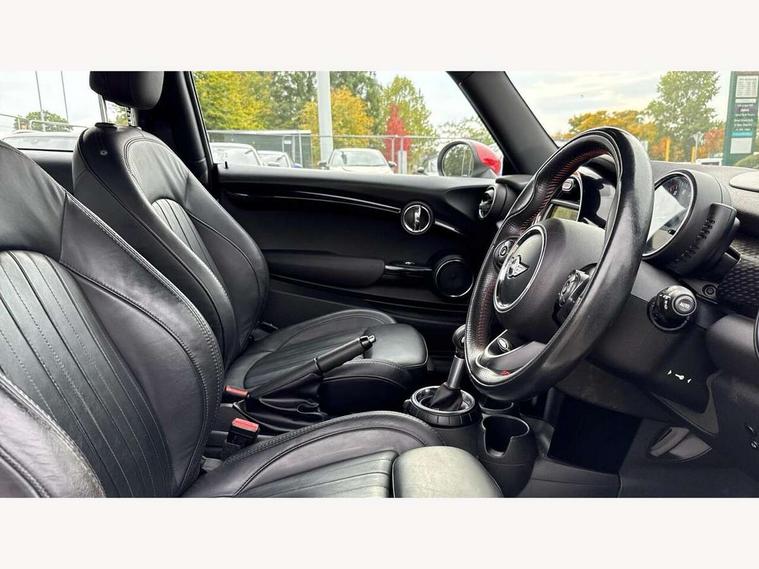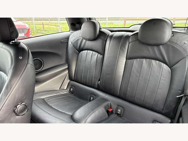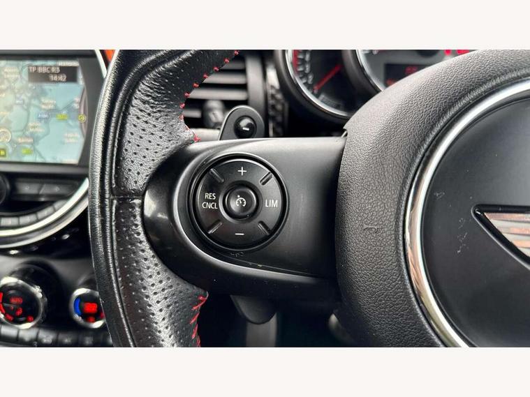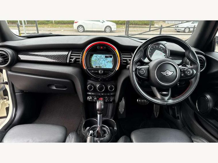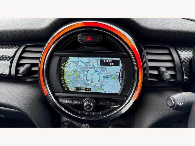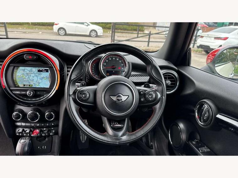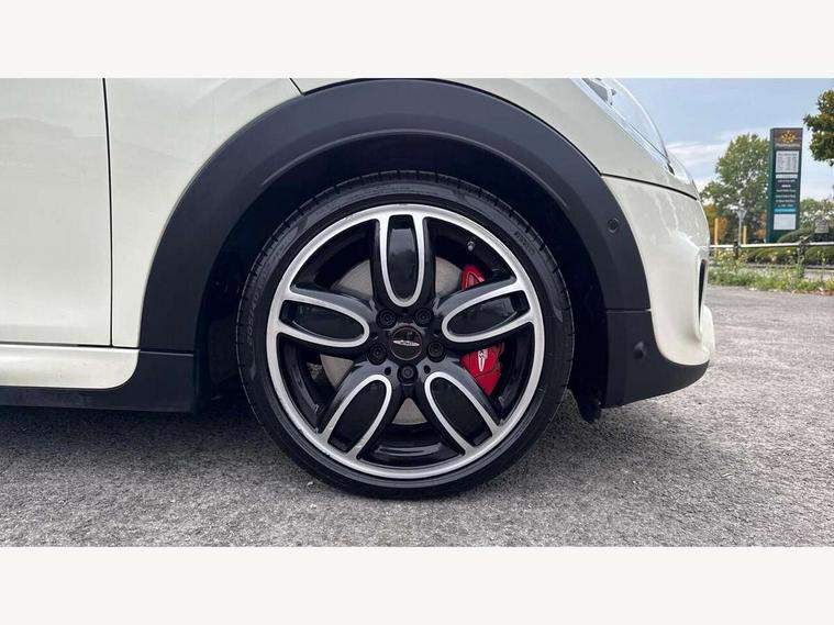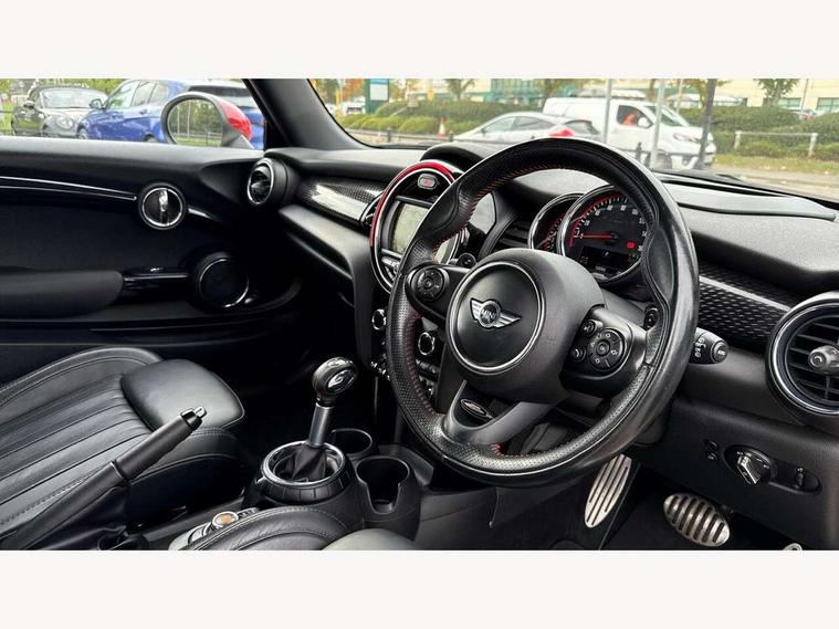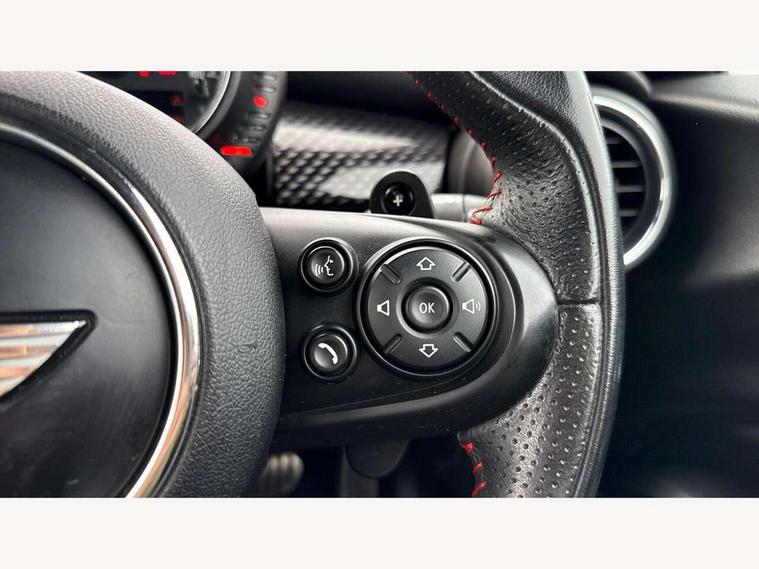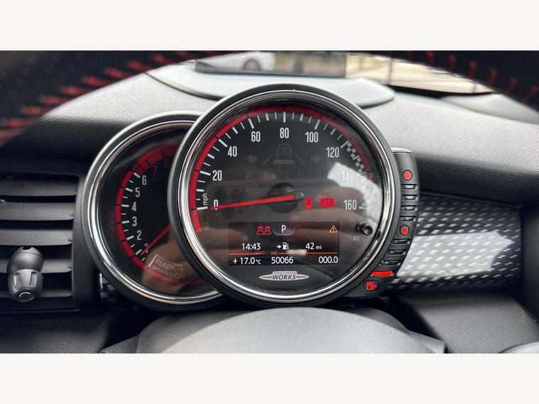 Acoustic seat-belt warning, Brake fluid level warning light, Brake pad wear indicator warning light, DTC - Dynamic traction control, Exterior temperature gauge, MINI Driving Modes - centre toggle switch to control driving setting (sport, mid and green), Oil level indicator, On board computer, Push button starter, Service interval indicator, Servotronic PAS, Electronic differential lock, Performance Control, Auxiliary input socket, DAB digital radio module, 2 speed wipers+intermittent wipe, Anti dazzle mirror, Anti trapping/one touch open close front windows, Body colour scoop integrated into engine- compartment lid, Body coloured bumpers, Chili red grille bar, Chrome bezels around rear lights and headlights, Chrome door handles, Chrome plated fuel cap, Chrome plated trim on bottom edge of window, Chrome strip on lower grille, Electric front windows, Electrically adjustable door mirrors, Extended wheel arches, Follow me home headlights, Green tinted heat insulating glass, Heated door mirrors/heated windscreen washers, Heated rear window with auto timer, High gloss black tailgate, Honeycomb radiator grille, John Cooper Works roof spoiler, Metal look door sill finishers, Rear wiper, Side scuttles, Twin chromed exhaust pipes, White indicator lights, 2 rear head restraints, 4 boot load lashing points, 6 way manually adjustable passenger seat, 6-way manually adjustable driver's seat, Active carbon filter, Air recirculation system, Anthracite headlining, Auxiliary socket in centre console storage compartment, Centre console storage, Driver's seat height adjuster, Driver/passenger sunvisors, Easy entry seats, Front and rear cupholders, Front head restraints, Front interior light, Front passenger grab handle, Front seat backrest storage nets, Front sports seats, Gear/selector and handbrake in artificial leather, Internal chrome door handles, Isofix child seat preparation, Luggage compartment lighting, Multifunction steering wheel, Passenger seat height adjuster, Reach + rake adjustable steering column, Rear grab handles, Rear storage trays, Split folding rear seats, Storage compartments in doors, Toolkit in luggage compartment, Vanity mirrors, 3 point seatbelts, ABS/EBD, ASC+T, Brake calipers in red, Cornering brake control (CBC), Crash Sensor - activates hazard/interior lighting + unlocks doors, Driver and passenger airbags, Driver/front passenger side airbags, DSC - Dynamic Stability Control, Fuel cut off safety device, Head airbags, Hill start assist, Passenger airbag deactivation system, Seatbelt pretensioners, Tyre pressure warning, Ventilated front disc brakes, Drive away door locking, Locking wheel bolts, Remote central locking/doors+fuel cap+tailgate, Second remote key, Thatcham category 1 alarm + immobiliser,