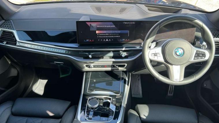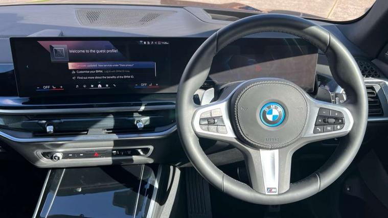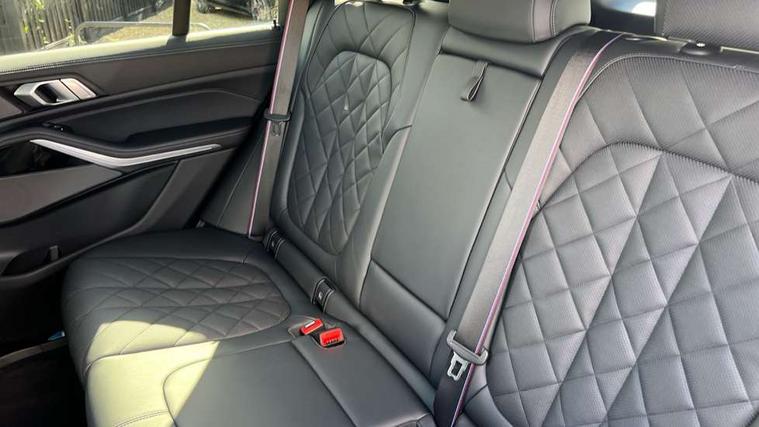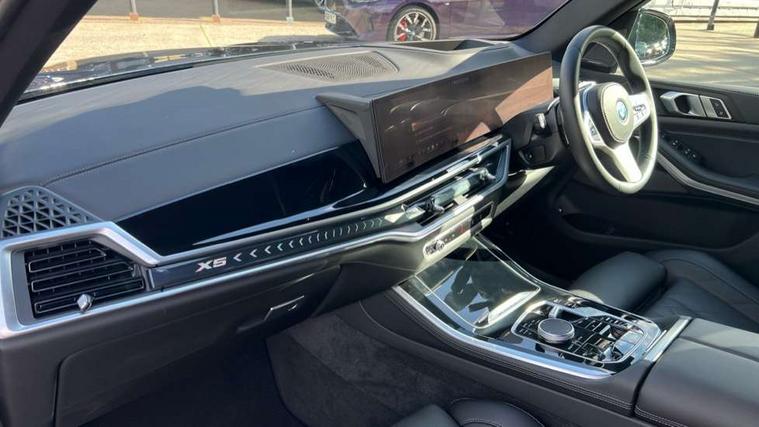 Attentiveness assist, Automatic tailgate operation, BMW ConnectedDrive online services, BMW live cockpit + with curved 12.3 instrument cluster/14.9 central display, nav/Tuner with diversity reception, RDS/4GLTE/remote software upgrade, BMW Teleservices, Condition based service, Cruise control with brake assist, eCall emergency call system, Enhanced bluetooth with wireless charging, Integrated owner's handbook, PAS, Speed limiter, Wi-Fi hotspot, AC Fast charging preparation (Maximum charging power 11kW), Adaptive 2-axle Front and rear air suspension, Drive performance control with ECO PRO comfort + sport mode, Eight speed steptronic sport automatic transmission and gearshift paddles on the steering wheel, Adaptive LED Headlights, Front and rear electric windows, High beam assistant, High gloss black shadow line roof rails, LED daytime running lights, Rain sensor, Rear side wing doors, Third brake light in rear spoiler, Variable intermittent rear wash/wipe, 12V - Power sockets with 2x centre console and 1x luggage compartment, 3 seat bench in 2nd row, Foldable rear centre armrest with 2 cupholders and storage compartment, Front and rear side armrest integrated into door trim, Headrests for all seats, Luggage compartment separating net, Lumbar support with height and depth adjustment in backrest, Single front passenger seat, Three spoke sport M leather steering wheel, Velour floormats, Ambient light interior pack - X5, Driving assistant pack with radar based driver assistance system - X5, Expanded exterior mirror pack - X5/X5 M, M aerodynamics pack - X5, Parking assistant pack - X5, 3 rear seatbelts, Acoustic protection for pedestrians, Active protection, Airbags - driver/front passenger, rear and side, first and second row seats head airbags, front passenger seat airbag deactivation + knee airbag, Anti-lock braking system (ABS), Automatic Stability Control (ASC), Brake energy regeneration, Cornering brake control (CBC), Crash sensor activating central locking release, hazard warning lights, fuel cut off, interior lighting + activation of safety battery terminal clamp, DSC - Dynamic Stability Control, Dynamic Traction Control - DTC, Electromechanical parking brake with automatic drive away release and auto hold function, Electronic brake force distribution, Hill start assistant, M Sport blue painted brake calipers with 'M' designation, Mechanical child proof lock on rear doors, Tyre pressure monitoring system, Tyre pressure sensors, Ventilated front and rear disc brakes, Warning triangle and first aid kit, Alarm system, Closing system with central locking, Comfort access system, Locking wheel bolts,