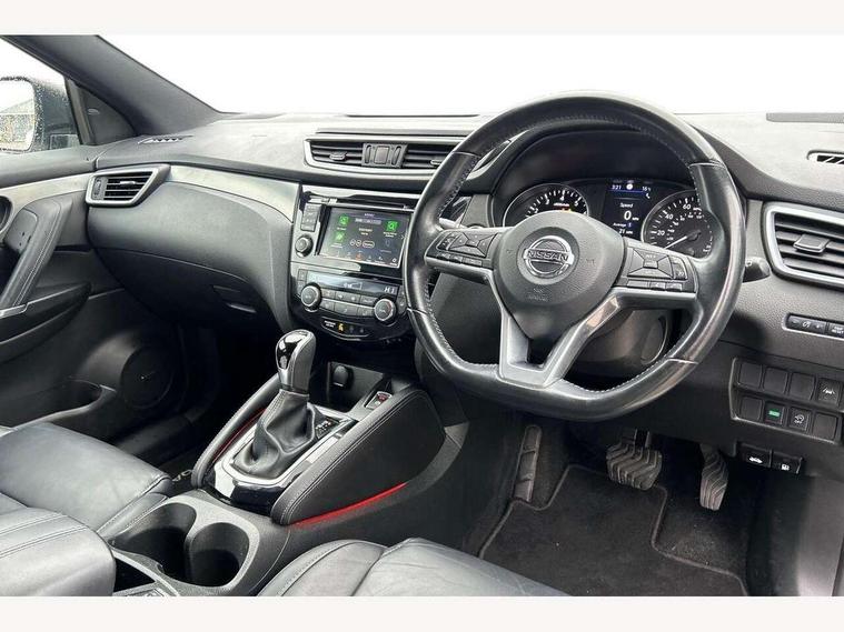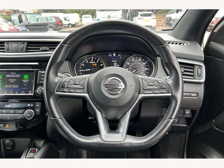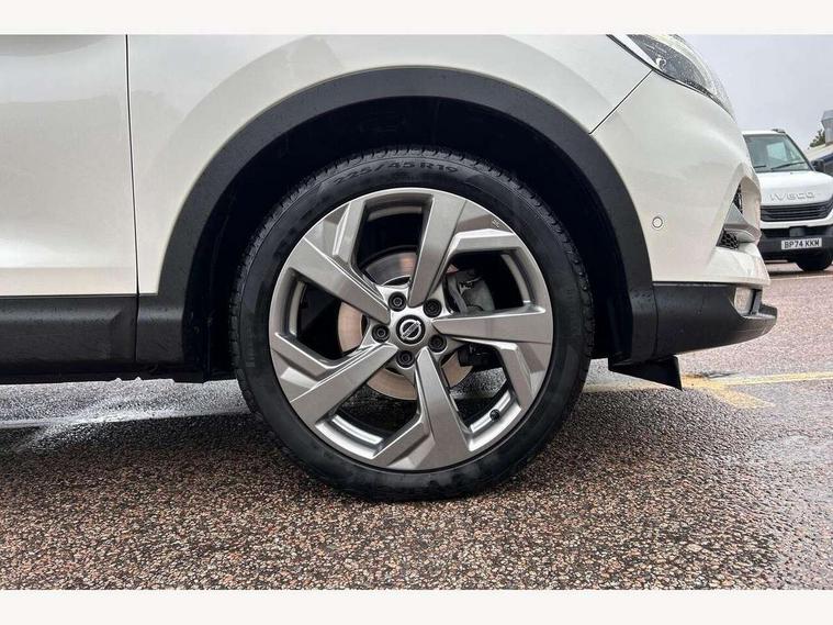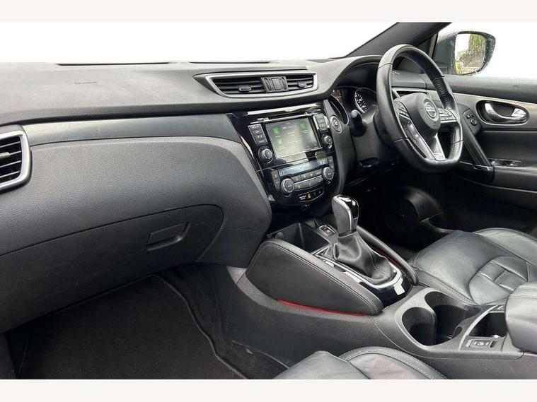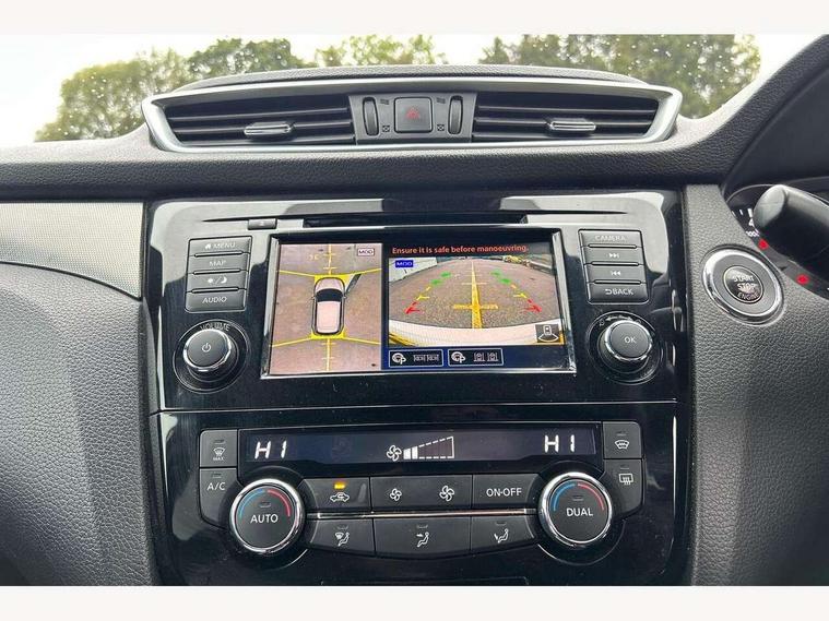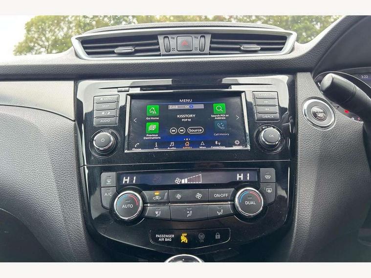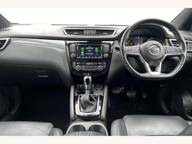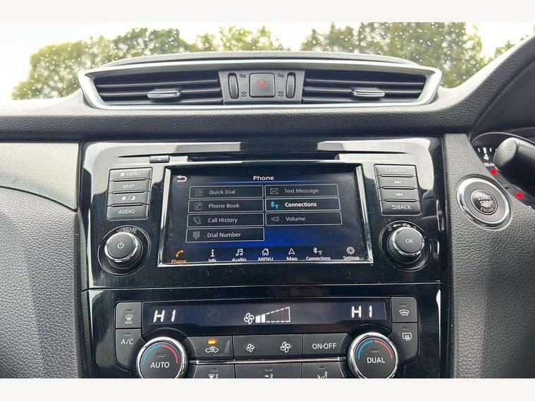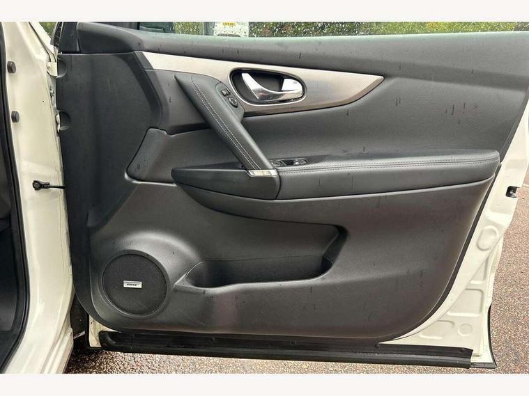 Advanced drive assist display 5'' TFT coloured screen, Android Auto, Apple CarPlay preparation, Bluetooth connectivity, Cruise control + speed limiter, Electric speed sensitive power steering, Front parking sensors, Intelligent around view monitor, Intelligent parking assist, Lane departure warning system, Nissan connect evo 7" touchscreen navigation and entertainment system, Normal or sport selectable steering, Outside temperature sensor, Push button starter, Rear parking sensors, Rear view camera, Service interval indicator, Smartphone integration, Stop/start system, Tomtom connected services, Traffic sign recognition, Trip computer, Voice control system, Nissan chassis control (intelligent ride control, intelligent trace control, intelligent engine brake), AM/FM radio, CD audio system, Aux-in socket, Bose premium 8 speaker system, DAB Digital radio, Steering wheel mounted audio controls, USB port, Anti dazzle rear view mirror, Auto wipers, Body colour bumpers, Body coloured door handles, Chrome window surround, Daytime running lights dip function when turn signal applied, Electric folding door mirrors, Electric front and rear windows with one touch illuminated window controls, Electric front/rear windows, Electrically adjustable door mirrors, Front fog lights, Gloss silver door mirror caps, Heated door mirrors, High beam assist, Intelligent auto headlights, LED indicators in door mirrors, Matt silver roof rails, Panoramic sunroof with one touch shade, Privacy glass, Rear roof spoiler, Rear wiper with reverse link, Shark fin antenna, Underbody vortex generators, 2 X front 12v power sockets, 3 height adjustable rear headrests, 60/40 split folding rear seat, Ambient lighting in centre console, Boot lighting, Centre console storage box/armrest, Chrome interior door handles, Configurable luggage board system, Dark headlining, Dual zone climate control, Electric 4-way lumbar support for drivers seat, Electrically adjustable driver seat, Electrically adjustable passenger seat, Front and rear door pockets with bottle holders, Front and rear seat belt pre-tensioners with load limiters, Height adjustable front headrests, Individual rear seat reading lights, Leather D shaped steering wheel, Leather gear lever, Leather knee pad, Manual lumbar support on passenger seat, Map reading lamp, Memory for drivers seat/door mirrors, Monoform front seats with plastic backboard, One touch electric shade, Parcel shelf stow function under luggage board, Pollen filter, Rear armrest with 2 cupholders, Synthetic leather wrapped door handle with contrasting stitching, Tilt/telescopic adjustable steering wheel, Heat package - Qashqai, LED pack - Qashqai, Safety shield plus pack - Qashqai, 6 airbags - Driver, front passenger, curtain and side airbags, ABS, ESP, EBD and brake assist, Auto hold function, Child locks on rear doors, Electronic parking brake, Front and rear seat belt warning, Front passenger airbag deactivation, Height adjustable front seatbelts, Hill start assist, Intelligent emergency braking with pedestrian recognition, Three 3 point rear seatbelts, Tyre pressure monitoring system, Anti-theft immobiliser, Intelligent Key, Remote central locking, Thatcham Cat.1 alarm, Carbon graphite dash trim, Tyre puncture repair kit,