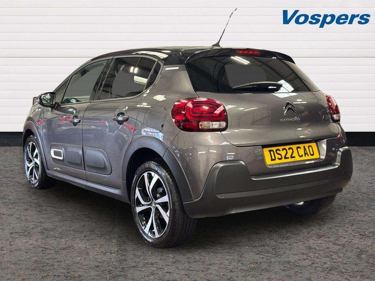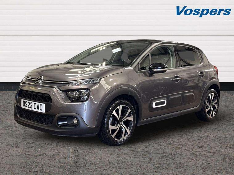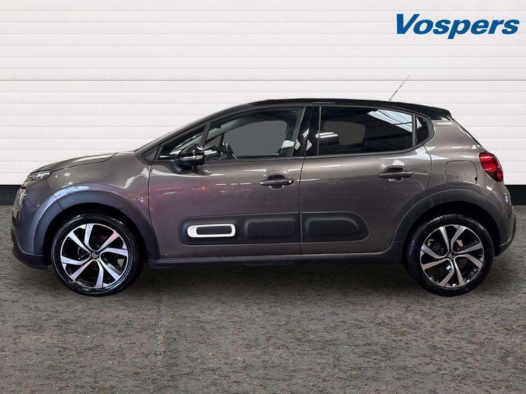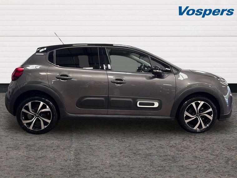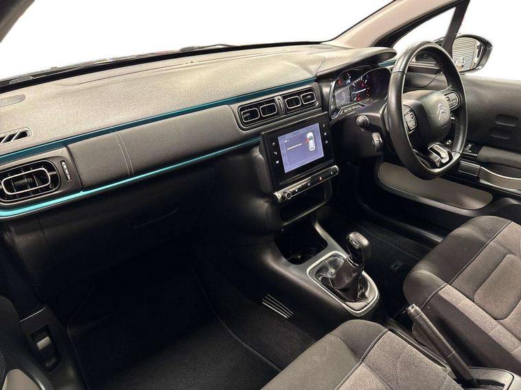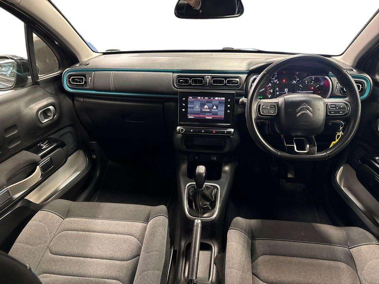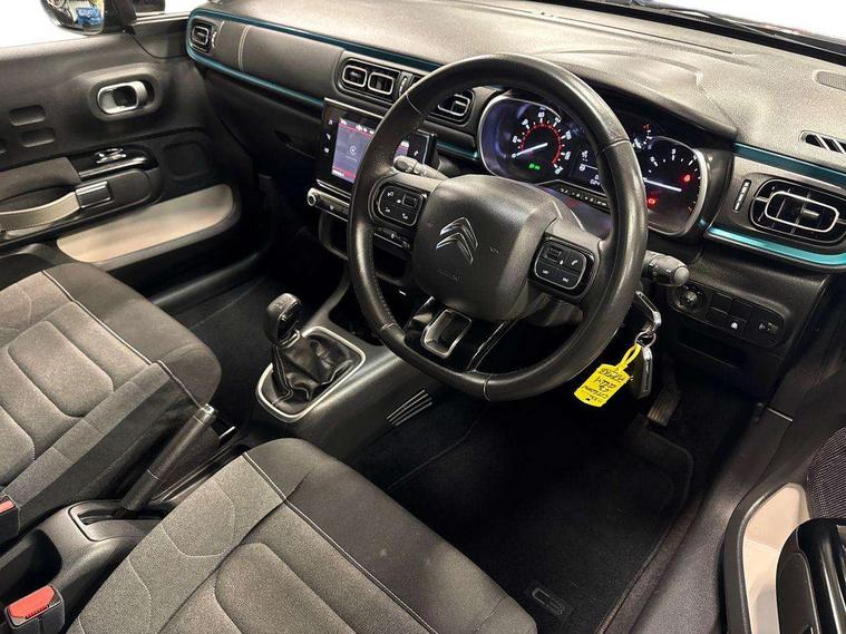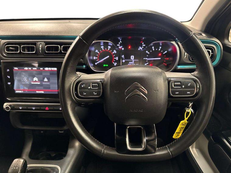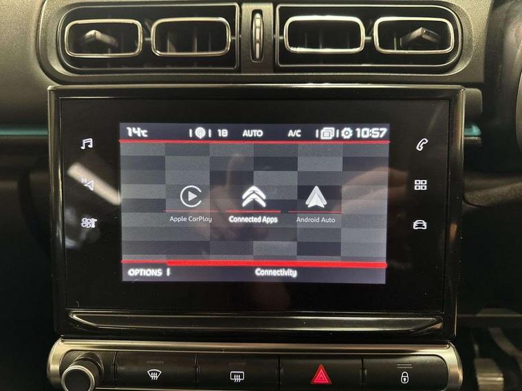 Citroen connect box emergency and assistance system, Citroen connected nav with DAB, 6 speakers, 7" captive touch screen, mirror screen includes apple carplay/android auto and bluetooth, Coffee Break Alert, Cruise control + speed limiter, eCall emergency call system, Exterior temperature display, Multi function trip computer, Reversing camera, Satin chrome surround instrument cluster with white LCD and analogue gauges, Variable assistance power steering, USB connection, 3D rear light signature, Airbump on side door panel, Auto dimming electrochrome rear view mirror, Auto headlights, Automatic activation of hazard warning lights, Body colour bumpers, Body colour door handles, Chrome decoration on front face, under chevrons and around daytime running lights, Citroen illuminated signature in LED headlights and LED daytime running lights, Dark tinted tailgate and rear side windows, Electric folding and heated door mirrors, Fog lights integrated into front bumper, Front sequential electric windows with one-touch open/close and anti-pinch system, Front windscreen wipers with two speeds and intermittent mode linked to vehicle speed, Gloss black finish B pillar, LED Headlights, LED third brake light, Rear sequential electric windows with one-touch open/close and anti-pinch system, Rear side wing doors, Rear windscreen wiper with intermittent mode linked to vehicle speed and automatic activation when reverse gear selected, Roof colour rear view mirror caps, 1/3 to 2/3 split folding rear seat, 12V socket, 3 seat bench in 2nd row, Automatic air conditioning, Boot light, Cloth/leather effect upholstery, Driver and passenger's sun visor with courtesy mirror, Driver's central armrest, Driver's seat height adjustment, Front lighting panel with map reading lights, Front seats adjustable with forward back slide and adjustable backrest, Height adjustable front head restraints, Height/reach adjust steering wheel, ISOFIX mounting on outer rear seats with top tether and labels indicating fixing points, Leather steering wheel with gloss black + satin chrome elements and audio/telephone controls, Leather trimmed gear lever with leather effect gaiter and overstitching, Map pockets in back of driver and front passenger seats, Parcel shelf, Seatbelt unfastened on the move audible and visual alert for front and rear seats, Single front passenger seat, Storage space under touchscreen with rubber mat, Three rear headrests, Upholstered armrest in front and rear doors, Safety pack 1 - C3, Safety pack 2 - C3, Visibility pack with automatic lights - C3, ABS with Electronic brakeforce distribution and Emergency braking assistance, Driver and front passenger seatbelts with pyrotechnic pretensioners and force limiters, Driver's airbag, Electric child locks, ESP with anti skid system, Front passenger airbag, Front passenger airbag deactivation, Front side airbags + front/rear curtain airbags, Hill start assist, Manual parking brake with leather handle and chrome finish button, Mono-tone horn, Outer rear seats with pretensioners and force limiters, Three rear 3-point seatbelts, Tyre pressure monitoring system, Anti theft alarm, Automatic door and boot locking when moving off with automatic unlocking in case of impact, Central locking with locked indicator and interior one touch lock button, Immobiliser, Remote control central locking with two plip keys, 17" Vector diamond cut alloy wheels, Tyre puncture repair kit,