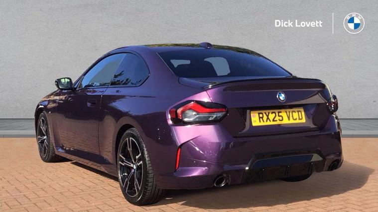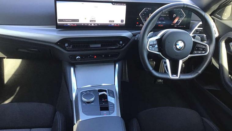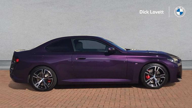 2 USB connections for charging and transferring data, Active guard plus, Attentiveness assist, Bluetooth with USB, BMW ConnectedDrive online services, BMW Intelligent Personal Assistant, BMW Live cockpit plus, BMW operating system 8 with variable, configurable widgets display information in real time, BMW Teleservices, Check Control warning system for monitoring of lights and door/luggage compartment open warning, Control Infotainment, Direct selection buttons, Drive off assistant, Eco pro mode, Electric power steering, eSim with 5G connectivity, Front and rear parking sensors, iDrive controller with turn and press function, Integrated owners handbook, Intelligent functions, Oil sensor for level and grade, Optimum shift indicator, Personal Profile, Smartphone integration, Touch operation on control display, Variable sport steering, Widescreen multi-media display, WiFi interface for wireless connection of mobile terminal devices, Aluminium lightweight construction, Balancer shaft, BMW TwinPower Turbo four-cylinder petrol engine, Double VANOS, Drive performance control with ECO PRO comfort + sport mode, Electronic differential lock, High precision injection, M sport suspension, Petrol Particulate Filter, Steptronic transmission with gearshift paddles, Twin scroll turbocharger with Valvetronic, DAB tuner, Acoustic windscreen wipers for reduced driving noise, Automatic windscreen wipers and automatic headlight, Body colour door handles flush with door surface, Body colour door mirrors, Body colour front and rear bumpers, Daytime running lights, Electric windows - front and rear, with open/close fingertip control and trap release, Exhaust tailpipes x2 - 90mm in left and right, Fading support, Front and rear bumper system with replaceable deformation elements, Front door sill finishers in black plastic with BMW designation, Front windscreen wipers with integrated washer jets, Green tinted heat protection glazing, High beam assistant, High gloss black sill, bumper trim sides and diffuser insert, High level third brake light, Indicators integrated int mirror housing, Interior rear-view mirror with automatic anti-dazzle function, LED registration plate light, LED technology rear tail lights, brake lights and turn indicators, Lightweight engineering, M high gloss shadowline, One piece kidney grille with hight gloss chrome surround, Rear boot, Rear fog lights, Reversing light in rear light cluster, Shark fin antenna, Single part LED rear lights with smoked glass components, Trailer stabilisation logic, Visible VIN plate, 12V power socket in front centre console with blanking plug, 2 cupholders in front centre console, 2 zone automatic air conditioning, Ambient lighting, Compartment in front of cupholder, Conditioned based service, English handbook, Folding rear seat head rests, Front and rear side armrests integrated into door trim, Front armrest, Front door pockets, Front head restraints, Heated front seats, Illuminated glove compartment with separate small compartment, M headliner Anthracite, M sport leather steering wheel, Manually adjustment steering wheel column, Rear seat backrest with manual 40:20:40 split folding, Rear seat centre foldable armrest with integrated cup holder, Single front passenger seat, Storage compartment between rear seats, Storage tray and compartment with cover in centre console, Sun visors with vanity mirrors and insert tab, Through loading system with 40/20/40 split folding 2 rear seat in 2nd row, Velour floor mats, Additional storage compartment pack without USB - 2 Series Coupe, Connected pack professional - 2 Series Coupe, 2 tone horn, Anti lock braking system (ABS) with cornering brake control, Automatic Stability Control (ASC), BMW emergency call, Brake drying, Child seat ISOFIX attachment for the two outer rear seats, Crash sensor activating of airbags, Unlocking doors, hazard warning lights, fuel cut off, interior lighting+activation of safety battery terminal clamp, Deactivation of fuel pump in the event of a crash, Driver and front passenger airbags, Driver and front passenger side airbags, integrated in the door side seat backrest bolsters for all seat variants, Dynamic brake control, Dynamic stability control + (DSC+), Dynamic Traction Control - DTC, Electrically operated hand brake including automatic hold function and automatic release when driving off, Front and rear disc brakes, Front centre airbag between driver and front passenger seats, Front passenger airbag deactivation, Head airbags for all 4 outer seats, PC iBrake (Post crash approach control warning with light braking function), Seat belt security check for driver and front passenger, Seatbelt warning, Side impact protection, Three point seat belts on 4 seats including front belt stopper, pyrotechnic belt tensioners and belt force limiters, Tyre pressure monitoring system, Warning triangle and first aid kit, Alarm system (Thatcham 1) with remote control and electronic engine immobiliser, Central locking switch for all doors, fuel filler cap and luggage compartment, Deadlocking function system to all doors, Drive away locking system on all doors and luggage compartment, Locking wheel bolts, Start/Stop button (illuminated) in centre console with keyless engine start and Auto Start-Stop deactivation button, Two remote control key with integrated key - one button for open and close doors/fuel flap/tailgate and separate button for unlock luggage compartment, Electrically powered 12V compressor, Reduced rolling resistance tyres, Tyre repair kit,