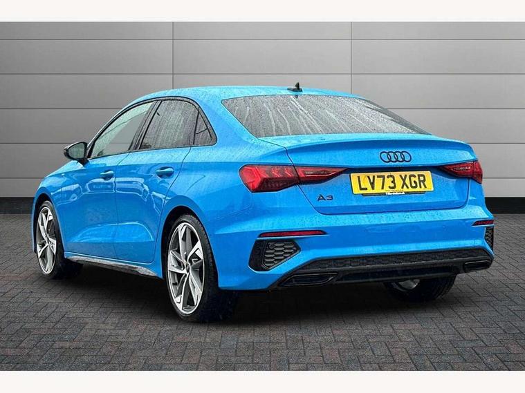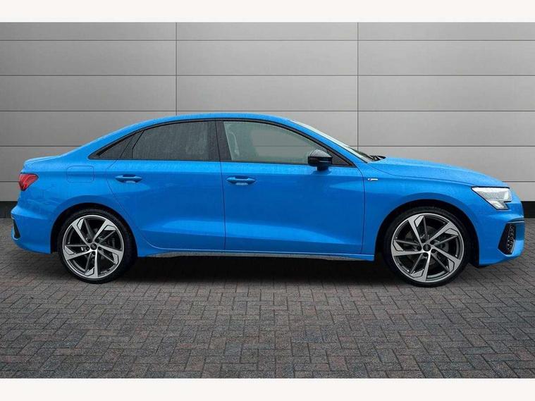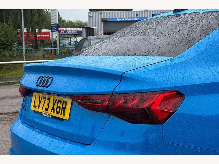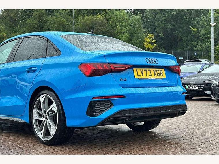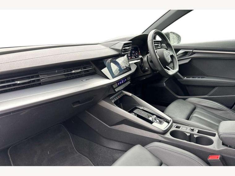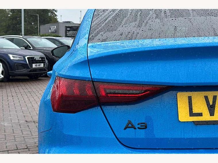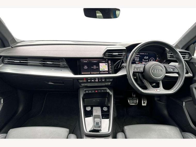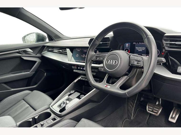 Audi drive select (Auto, Comfort, Dynamic, Efficiency and Individual), Audi smartphone interface, Audi Virtual Cockpit - 10.25" digital and colour instrument cluster, Automatic start/stop system with recuperation, Bluetooth interface, Camera based traffic sign recognition, Collision avoidance assistant, e-Call (emergency call), Electromechanical power speed sensitive steering, Lane departure warning system, MMI Navigation Plus with high resolution 10.1" colour touch screen display, Service indicator, Trip computer, Voice control system with natural language interaction, Sports suspension, 2xUSB-C connection with data and charging functions, 6 passive loudspeakers, CD player, DAB Digital radio, 3rd brake light, Acoustic glass windscreen, Audi beam uses LEDs to project the Audi logo onto the ground as you exit your A3, Auto dimming frameless rear view mirror, Electrically adjustable/heated/folding/auto dimming door mirrors with integrated LED indications + kerb view function for passenger side, Front electric windows, Illuminated door sills with aluminium inserts at the front with S logo, LED daytime running lights, LED headlights with LED rear lights and dynamic rear indicators, Light and rain sensors, Model and engine designation badges at rear, Privacy glass - dark tinted rear window, rear door and side windows, Rear boot, Rear electric windows, Rear side wing doors, S roof spoiler, 12V socket and storage compartment in front centre console, 3 seat bench in 2nd row, 3 spoke flat bottomed leather multifunction sport steering wheel with gear shift paddles, 4 way electrically adjustable lumbar support for driver and front passenger, 60/40 split folding rear seat bench, Black cloth headlining, Dual zone electronic climate control, Front and rear centre armrest in artificial leather, Front and rear headrests, Front/rear floor mats, Height and reach adjustable steering wheel, Interior lighting - glove compartment light and right hand side, Luggage compartment floor covering, Manual boot compartment lid, Single front passenger seat, Stainless steel pedals and front footrest in black, Twin leather upholstery with front sports seats S embossed logo, Aluminium interior elements pack - A3, Black styling pack - A3 Saloon/Black edition, LED interior lighting pack - A3 Saloon, 3x3 point rear seat belts, Driver and front passenger airbag with passenger airbag deactivation, Electronic Stabilisation Control (ESC) including ABS, ASR and EDL, First aid kit with warning triangle and 2 safety vests, Front side airbags with head airbags and interaction airbag, Pre-sense front with pedestrian and cyclist detection, Seatbelt monitoring, Tyre pressure loss indicator, Anti theft alarm, Anti-theft wheel bolts, Electronically operated child locks, Immobiliser, Remote control central locking, Aluminium air vent surrounds, Dark spectrum aluminium inlays, accent surfaces in the dashboard and centre console in platinum grey silk effect paint finish, 19" 5 arm trapezoid design alloy wheels in matt grey with diamond cut finish,