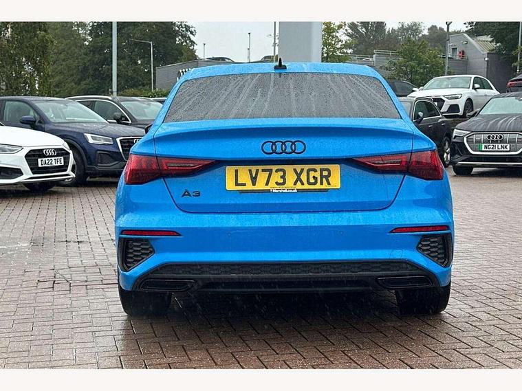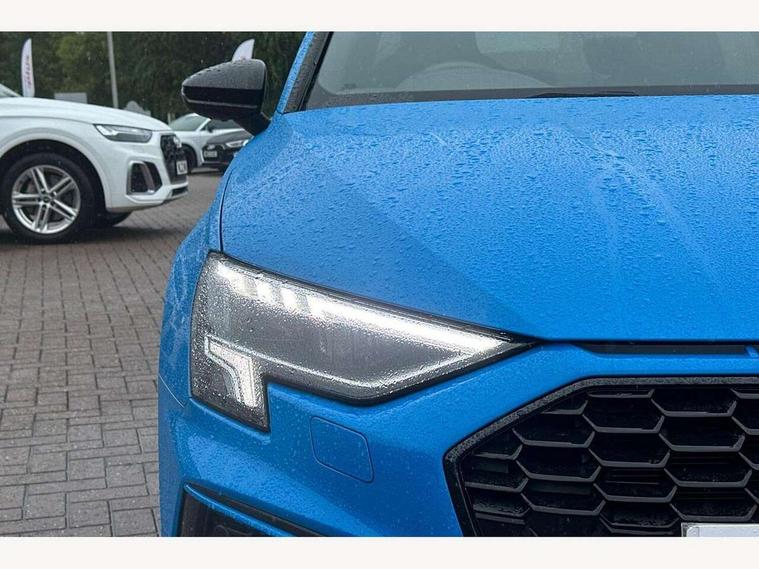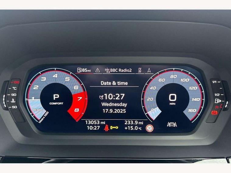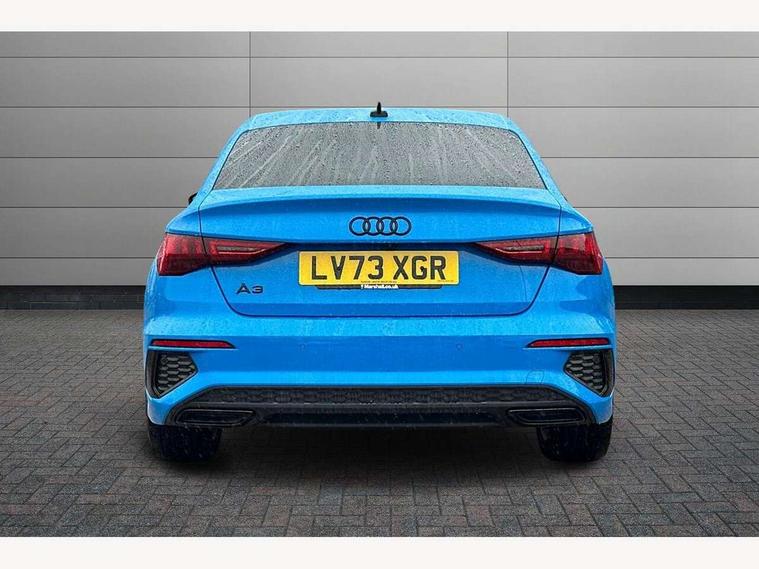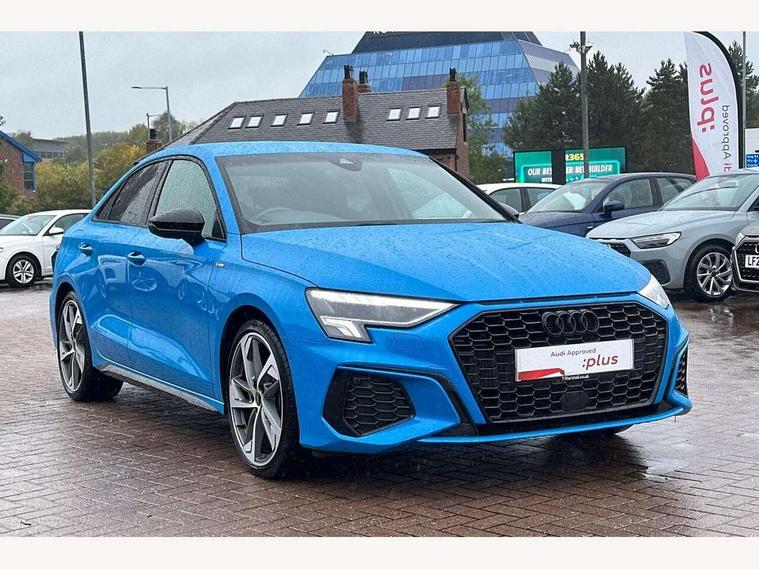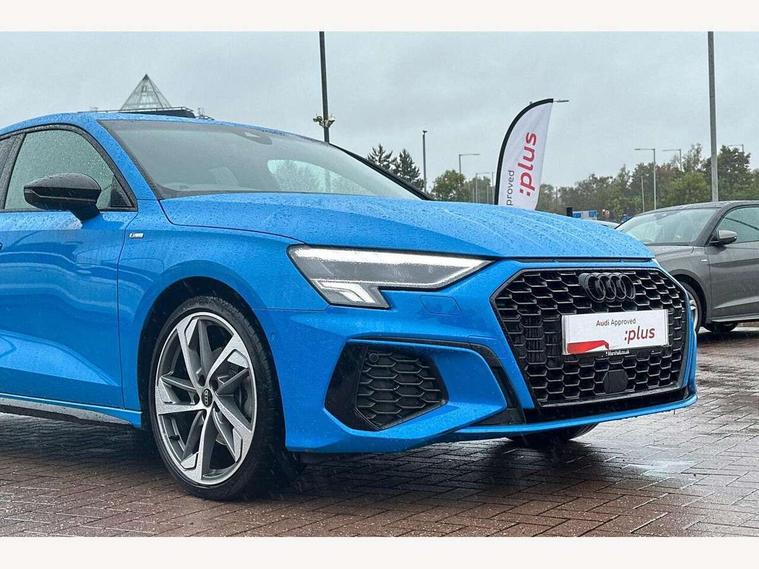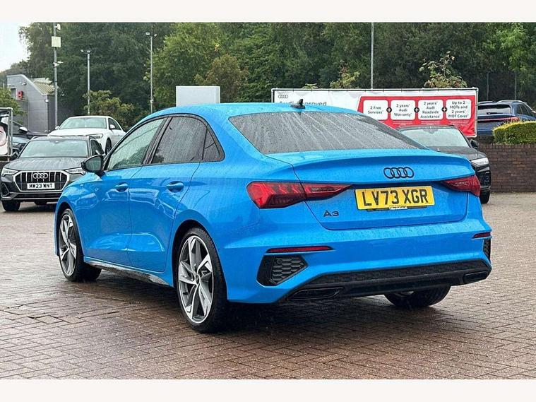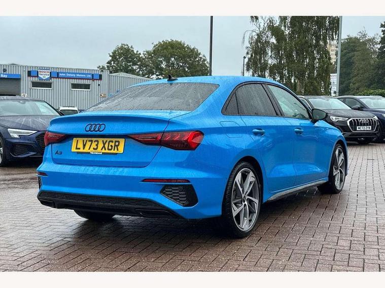 Audi drive select (Auto, Comfort, Dynamic, Efficiency and Individual), Audi smartphone interface, Audi Virtual Cockpit - 10.25" digital and colour instrument cluster, Automatic start/stop system with recuperation, Bluetooth interface, Camera based traffic sign recognition, Collision avoidance assistant, e-Call (emergency call), Electromechanical power speed sensitive steering, Lane departure warning system, MMI Navigation Plus with high resolution 10.1" colour touch screen display, Service indicator, Trip computer, Voice control system with natural language interaction, Sports suspension, 2xUSB-C connection with data and charging functions, 6 passive loudspeakers, CD player, DAB Digital radio, 3rd brake light, Acoustic glass windscreen, Audi beam uses LEDs to project the Audi logo onto the ground as you exit your A3, Auto dimming frameless rear view mirror, Electrically adjustable/heated/folding/auto dimming door mirrors with integrated LED indications + kerb view function for passenger side, Front electric windows, Illuminated door sills with aluminium inserts at the front with S logo, LED daytime running lights, LED headlights with LED rear lights and dynamic rear indicators, Light and rain sensors, Model and engine designation badges at rear, Privacy glass - dark tinted rear window, rear door and side windows, Rear boot, Rear electric windows, Rear side wing doors, S roof spoiler, 12V socket and storage compartment in front centre console, 3 seat bench in 2nd row, 3 spoke flat bottomed leather multifunction sport steering wheel with gear shift paddles, 4 way electrically adjustable lumbar support for driver and front passenger, 60/40 split folding rear seat bench, Black cloth headlining, Dual zone electronic climate control, Front and rear centre armrest in artificial leather, Front and rear headrests, Front/rear floor mats, Height and reach adjustable steering wheel, Interior lighting - glove compartment light and right hand side, Luggage compartment floor covering, Manual boot compartment lid, Single front passenger seat, Stainless steel pedals and front footrest in black, Twin leather upholstery with front sports seats S embossed logo, Aluminium interior elements pack - A3, Black styling pack - A3 Saloon/Black edition, LED interior lighting pack - A3 Saloon, 3x3 point rear seat belts, Driver and front passenger airbag with passenger airbag deactivation, Electronic Stabilisation Control (ESC) including ABS, ASR and EDL, First aid kit with warning triangle and 2 safety vests, Front side airbags with head airbags and interaction airbag, Pre-sense front with pedestrian and cyclist detection, Seatbelt monitoring, Tyre pressure loss indicator, Anti theft alarm, Anti-theft wheel bolts, Electronically operated child locks, Immobiliser, Remote control central locking, Aluminium air vent surrounds, Dark spectrum aluminium inlays, accent surfaces in the dashboard and centre console in platinum grey silk effect paint finish, 19" 5 arm trapezoid design alloy wheels in matt grey with diamond cut finish,