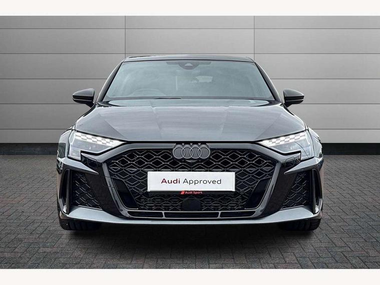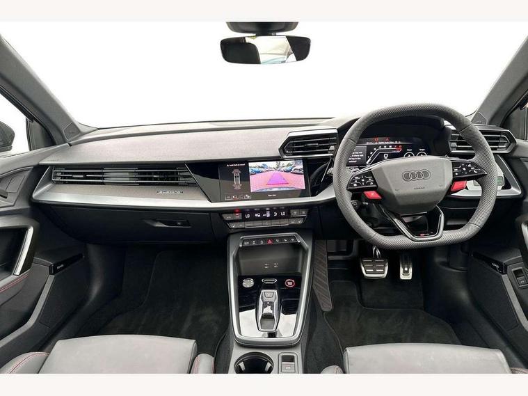 Adjustable speed limiter, Audi drive select comfort, auto, dynamic and efficiency, Audi smartphone interface with app store includes wireless Apple carplay, Android auto and Amazon alexa integration, Audi virtual cockpit plus with RS specific design and 12.3" display with additional graphic display options, Automatic start/stop system with recuperation, Bluetooth interface, Camera based traffic sign recognition, Collision avoidance assistant, Distraction and Fatigue warning, e-Call (emergency call), Lane departure warning system, MMI Navigation Plus with high resolution 10.1" colour touch screen display, Park Assist with parking system Plus, Progressive steering, RS specific driving modes - RS Individual, RS Performance and RS Torque rear, Voice control system with natural language interaction, Quattro permanent four wheel drive, Audi Phonebox light with wireless charging, DAB Digital radio, USB ports with charging function in the rear, All weather light, Audi beam LED projection of RS logo on ground as you exit, Audi darkened matrix LED headlights with dynamic light sequencing and dynamic indicator, Auto dimming frameless rear view mirror, Automatic dynamic range control, Carbon door mirror housings, Carbon fibre engine cover, Dipped beam, main beam, position light and turning light, Dynamic RS specific light sequencing of the coming home and leaving home function, Electrically adjustable/heated/folding/auto dimming door mirrors with integrated LED indications + kerb view function for passenger side, Exterior model badging, Front electric windows, Headlight cleaning system, Heat insulating glass windscreen, Intersection light, LED 3rd brake light, LED brake lights, LED rear lights with dynamic light sequencing and dynamic indicator, LED rear number plate lights, LED reverse light, LED tail lights, Light and rain sensors, Manoeuvring light, Motorway light, Privacy glass - dark tinted rear window, rear door and side windows, Rear electric windows, Rear side wing doors, Rear wiper, Roof edge spoiler in carbon, RS dual branch exhaust system with two chrome plated oval tailpipe trims, Static Cornering lights, Visually upgraded RS specific daytime running light choice of 4 digital signature in chequered flag design within the headlight, 12V socket and storage compartment in front centre console, 3 seat bench in 2nd row, 3 Spoke flat top and bottomed black leather multi function steering and gear shift paddles, 3-zone deluxe automatic air conditioning, 40/20/40 split folding rear seat bench, Black cloth headlining, Black front and rear floor mats, Front and rear headrests, Front centre armrest, Front door sill trims with RS 3 logo, Front sports seats RS embossed logo, Heated front seats, Height and reach adjustable steering wheel, Manual boot compartment lid, Manually adjustable front seats, Rear centre armrest with cupholder, Seat side bolsters, Single front passenger seat, Stainless steel pedals and front footrest in black, Vanadium look - Interior door handles, Door trim, power latching, Air vents, window controls, mirror adjust, rear door lock, Selector lever in centre console, Black Styling plus package - RS3, Extended ambient lighting package Pro with Multi-coloured contour lighting of instrument panel - RS3, RS exterior features pack in carbon and gloss black - RS3, RS sport suspension pack - RS3, Storage package - RS3 Sportback, Technology package without speed limiter - RS3, 3x3 point rear seat belts, Driver and front passenger airbag with passenger airbag deactivation, Electronic Stabilisation Control (ESC) including ABS, ASR and EDL, First aid kit with warning triangle and 2 safety vests, Hill hold assist, Pre-sense front with pedestrian and cyclist detection, RS steel brakes, Seatbelt monitoring, Tyre pressure loss indicator, Anti theft alarm, Anti-theft wheel bolts, Electronically operated child locks, Immobiliser, Remote central locking with safelock, Black dashboard, Inlays in carbon atlas structure, 19" 10 cross spoke silk matt grey alloy wheels, Tyre repair kit,