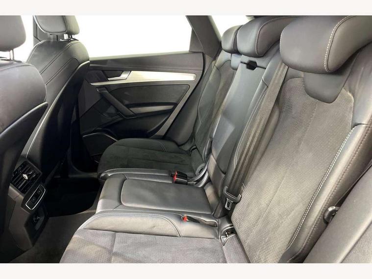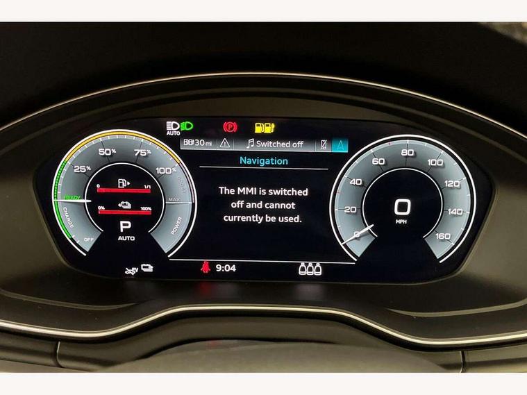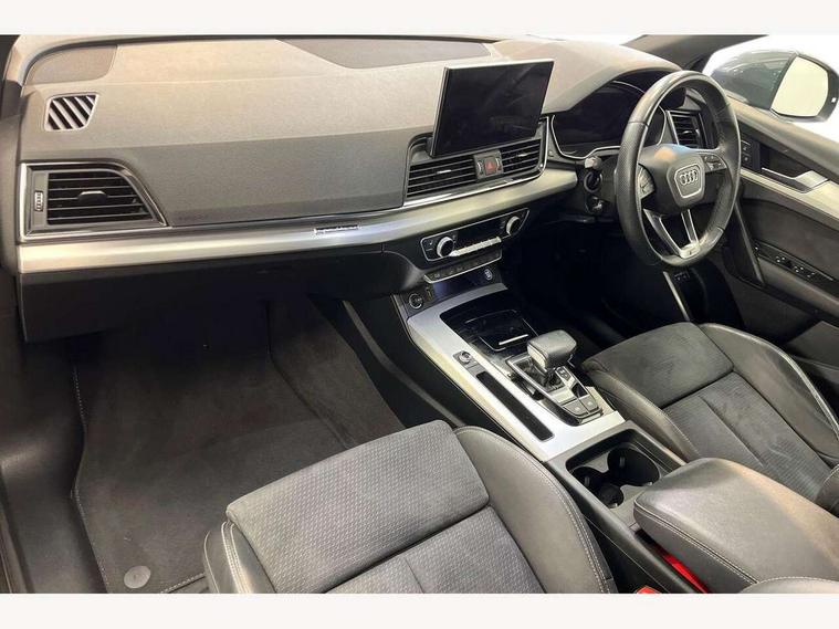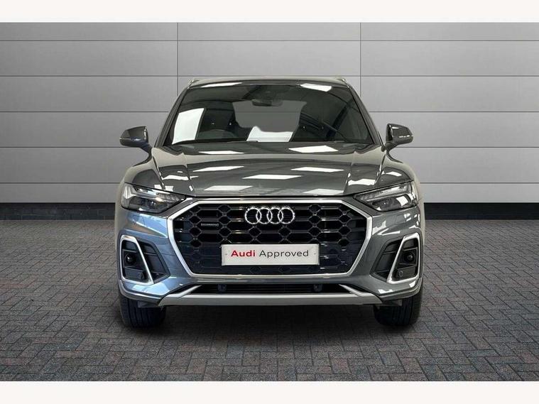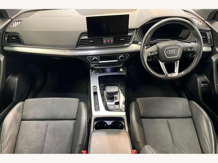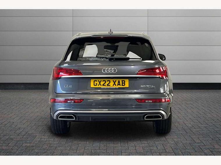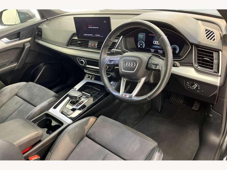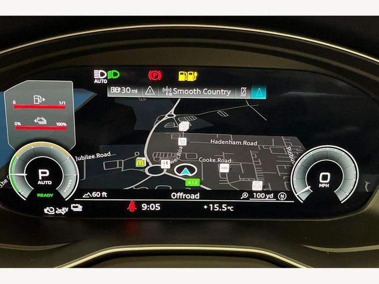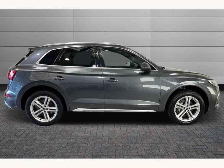 Audi connect safety and service (e-call), Audi connect with Amazon Alexa Integration, Audi drive select, Audi virtual cockpit plus with 12.3" screen and three different layout designs, Audi wireless smartphone interface, Automatic start-stop system with coasting functionality and efficiency programme, Bluetooth interface, Electro - mechanical power assisted steering, MMI navigation plus with 10.1" touch screen, Power tailgate, Reversing camera, Service interval indicator, Voice control system with Audi hotword activation "Hey Audi", 3 pin 10 amp domestic charging cable, 7.4 kW onboard charger, Dynamic suspension, Quattro on demand, Type 2 mode 3 22kW 32 amp charging cable, Type 2 socket for AC charging, 2 x USB charging port with aux input socket, DAB Digital radio, 3rd brake light, Acoustic windscreen, Aluminium roof rails, Audi matrix LED headlights with dynamic front and rear indicators, Auto dimming door mirrors, Auto dimming rear view mirror, Automatic headlights and windscreen wipers, Body colour bumpers, Body colour door mirrors, Body colour rear diffuser with matt aluminium silver surrounds, Body colour underbody protection, Chrome plated exhaust trims, Daytime running lights, Door sills in Selenite silver, Electric adjustable/heated/folding door mirrors, Front air inlet surrounds in aluminium, Front and rear electric windows, Front radiator grille in honeycomb design, Headlight washers, Lower bumpers painted in contrast Manhattan grey, Rear chrome trim strip below lights, Rear privacy glass and rear side windows, Rear side wing doors, Rear wiper, Roof bars, S Line badges on the front wings, S Line front and rear bumpers, S Line rear spoiler, S Line side skirts, 3 rear headrests, 40:20:40 split folding 3 rear bench seat in 2nd row with rear centre armrest, Black cloth headlining, Comfort front centre armrest, Contrast stitching on seats, steering wheel and gear lever gaiter, Deluxe 3 zone electronic climate control, Front/rear floor mats, Gear lever in black leather, Heated front seats, Height adjustable front head restraints, Height/reach adjustable steering column, Illuminated door sill trims with S logo, ISOFIX child seat mounting and top tether, Manual seat adjustment with 4-way electric lumbar support, Rear seat bench plus, Single front passenger seat, Sunvisors with vanity mirrors, Trunk roller cover, High gloss pack - Q5, LED interior light pack - Q5, 3 point seatbelts on all seats, 6 airbags - Driver, front passenger, curtain and side airbags, Electrically operated child locks on rear doors, Electromechanical parking brake, Electronic stabilisation control including ABS, ASR and EDL, Front passenger airbag deactivation, Hill descent control, Hill hold assist, Multi collision brake assist, Pop-up bonnet for pedestrian protection, Pre sense city, Seat belt force limiter, Seatbelt monitoring, Tyre pressure warning, Warning triangle and first aid kit, Anti theft alarm, Anti-theft wheel bolts, Keyless Go access/ignition system, Remote central locking, Matt brushed aluminium inlays, Tool kit, Tyre repair kit,