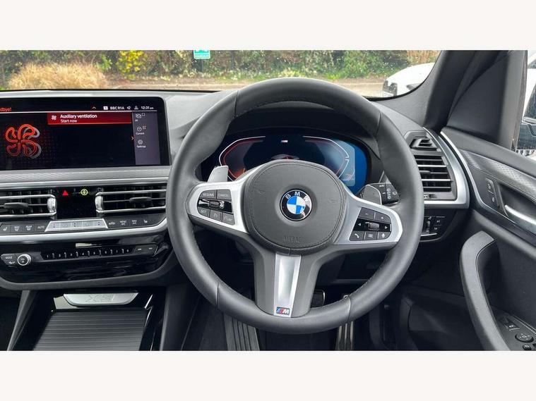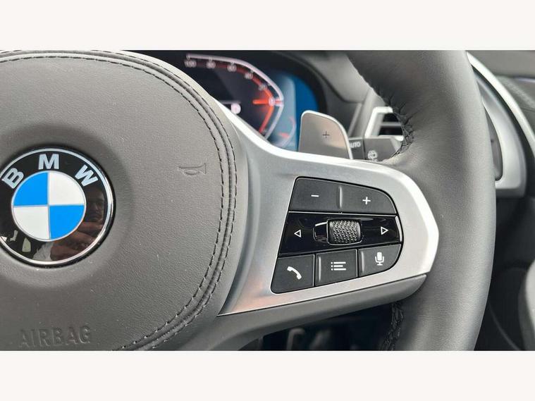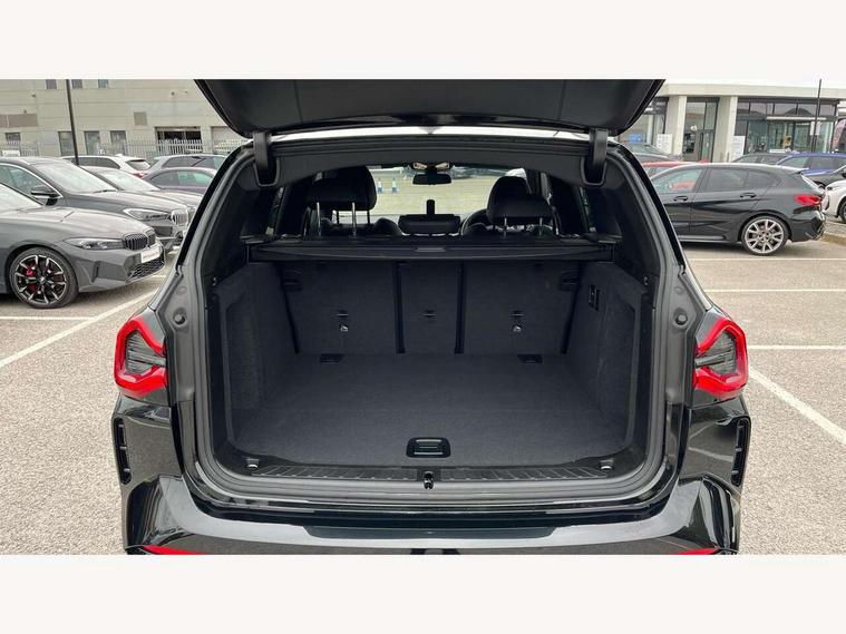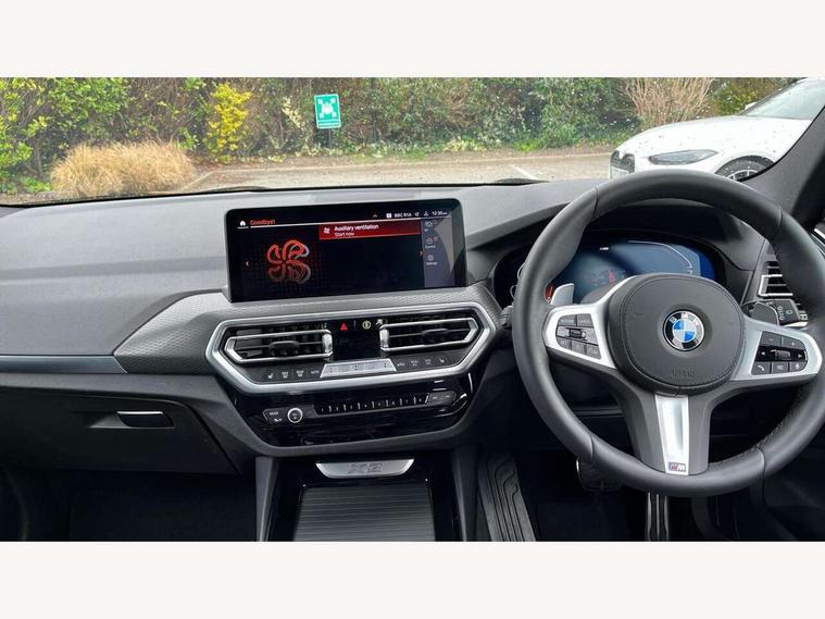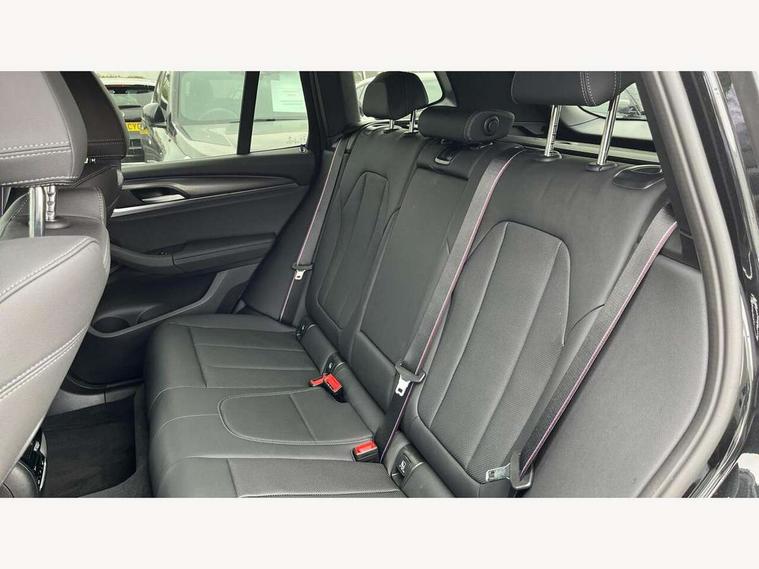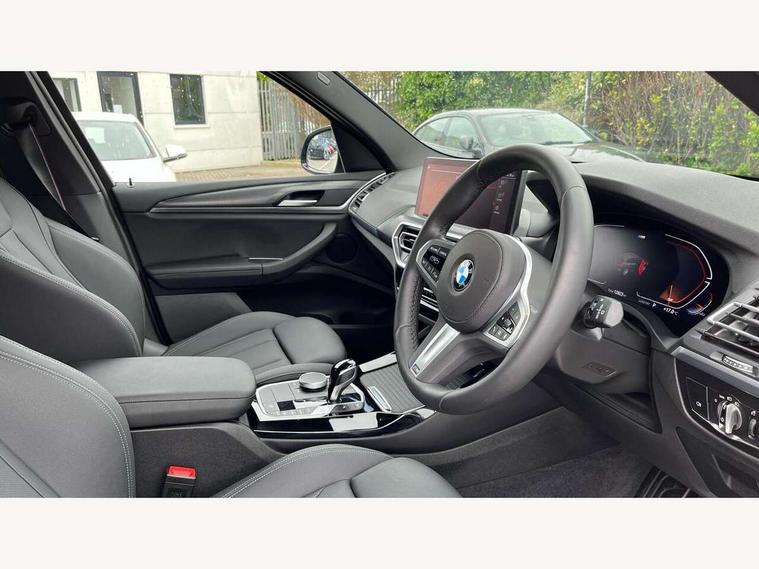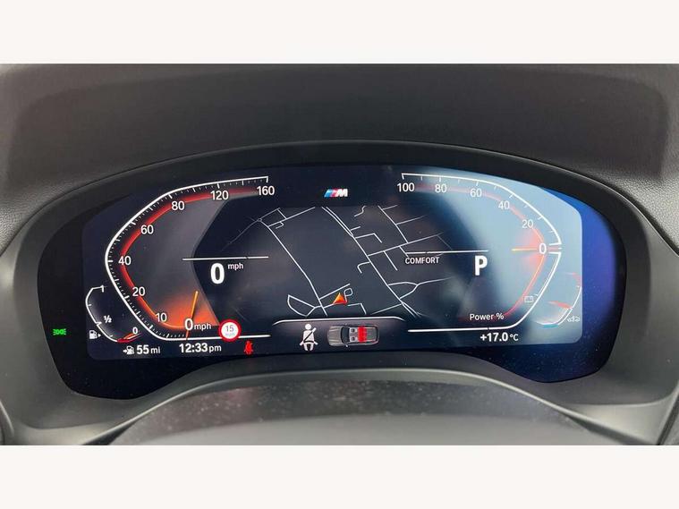 Active Guard, Attentiveness assist, BMW Live Cockpit Professional nav system including 12.3" instrument display + 12.3 high resolution control display, BMW Online services, BMW Teleservices, Brake pad wear indicator in front and rear, Check Control warning system for monitoring of lights and door/luggage compartment open warning, Condition based service - BMW service history, electronic service booklet, integrated owner's handbook, Connected drive services, Electric boot lid, Front/rear Parking distance control, iDrive touch controller with 8 favourite buttons, Instrument cluster with speedometer with mph readout, tachometer, fuel gauge and oil temperature gauge, Lights on warning by audio warning signal when ignition is switched off, Oil sensor for level and grade, warning by check control system, On board computer - average speed+fuel consumption, service interval, clock/date, odometer/trip meter, outside temperature display and ice warning, Optimum shift indicator, Personal Profile - automatic lock when driving away selectable, Run flat indicator, Stop/start system, Variable sports power steering with drive performance control Sport+ mode, Automatic transmission with gearshift paddles, Incorrect fuelling protection, M sport suspension, Multi-link rear suspension, BMW professional radio/CD/MP3, DAB tuner, Acoustic glazing, Automatic windscreen wipers and automatic headlight, Black finish on B pillars, Body colour door handles, Body colour electric adjust heated aspherical door mirrors, Body colour roof mouldings, Body coloured bumpers, Direction indicator, side repeaters, integrated in exterior mirrors, Dynamic brake lights, Exhaust tailpipes - dual, round, split left and right with chrome finisher, Fingertip control / anti-trap function on electric window, Folding wing mirrors with auto dimming, Follow me home headlights, Front and rear bumper system with replaceable deformation elements, Front and rear electric windows, Gloss chrome tailpipes finishers, Green tinted heat insulating glass, Heated windscreen washer jets, High beam assistant, High gloss black shadow line roof rails, High gloss shadowline exterior trim in decorative moulding side frame/recess cover/guide rail/B, C pillars/mirror frame and triangle with mirror base, High level 3rd brake light incorporating LED Technology, Interior rear view electrochromatic mirror with automatic anti dazzle function, LED tail lights, Lightweight engineering, M aerodynamic bodystyling, M Sport entry door sill strips, Model designation, Rain sensor, Rear side wing doors, Rear wing door, Rear wiper, Shark fin antenna, Side exterior M designation badges, Visible VIN plate, Welcome lighting, Windscreen wipers with adjustable interval, 12V power point in luggage area, 12V power socket in front centre console, 2 x USB Type C ports for charging and data transmission (front centre console) and 2 x USB Type C ports for charging (rear centre console), 3 rear headrests, 3 seat bench in 2nd row, 3 zone automatic air conditioning, 4 lashing points to secure luggage, 40:20:40 split folding rear seat with loading system, Ambient lighting, Anthracite headlining, Automatic interior light when door is opened/ignition switched off or via remote key, Floor mats in velour, Foldable storage floor with compartment, Four grab handles integrated in roof lining, Front and rear bottle holders integrated into door trim storage compartments, Front and rear side armrests integrated into door trim, Front centre armrest with storage compartment, Front footwell lights, Front head restraints, Front passenger seat, Front sports seats, Front/rear courtesy lights with soft on/off dimming, Front/rear reading lights, Heated front seats, Isofix rear child seat preparation, Leather gear knob, Lockable glove compartment, Luggage area underfloor compartment, Luggage compartment lighting, M sport leather steering wheel, Multifunction steering wheel, Parcel shelf removeable and storable under boot floor, Reach and rake adjustable steering column, Rear centre armrest with 2 cupholders, Removable / retractable luggage cover, Slope adjustable rear seats, Storage compartment in rear centre console and front/rear door trims, Sun visors with vanity mirrors and ticket pocket, Toolkit located in luggage compartment, Two front cupholders with removable oddments tray/lid, Connected pro pack - X3, ADB - Automatic Differential Brake, Anti-lock braking system (ABS) with brake assist, Automatic Stability Control (ASC), Battery safety cut-off, BMW emergency call, Brake drying, Brake energy regeneration, Braking pre-tensioning, Child locks on rear doors, Cornering brake control (CBC), Crash Sensor - activation of central locking release, hazard warning light and interior lighting, Deactivation of fuel pump in the event of a crash, Driver and front passenger front and side airbags with passenger deactivation and ITS front and rear head airbags, Driver and front passenger knee airbag, DSC+, Dynamic brake control, Dynamic Traction Control - DTC, Electromechanical parking brake, Hill descent control, Hill start assist, Seatbelt security check for front seats, Side impact protection, Three point seatbelts to all seats with front and outer rear pyrotechnic belt tensioners and seat belt force limiters, Two tone horn, Tyre pressure sensor, Ventilated front and rear disc brakes, Warning triangle and first aid kit, Central locking switch for all doors, fuel filler cap and luggage compartment, Electronic engine immobiliser, Locking wheel nuts, Remote control including two integrated key - one button for open/close all lockable content, windows and separate button for open luggage compartment, Remote control Thatcham category 1 alarm, Start/stop button with Comfort Go keyless engine start and auto Start/stop deactivation button, Low rolling resistance tyres,