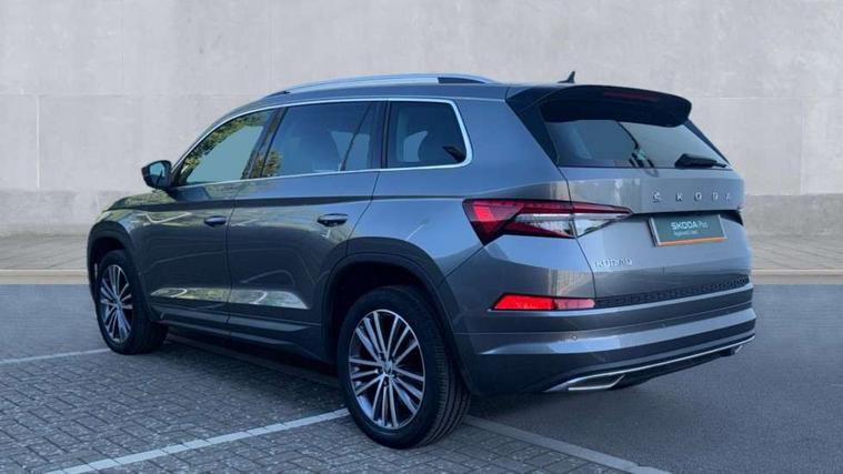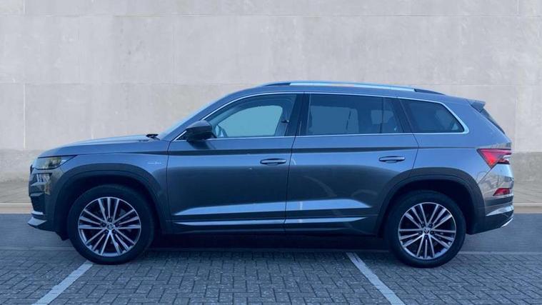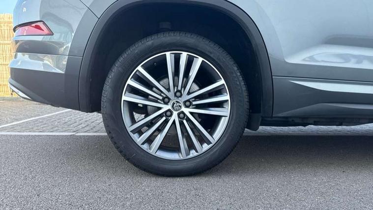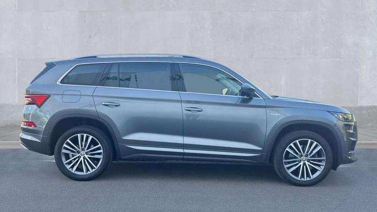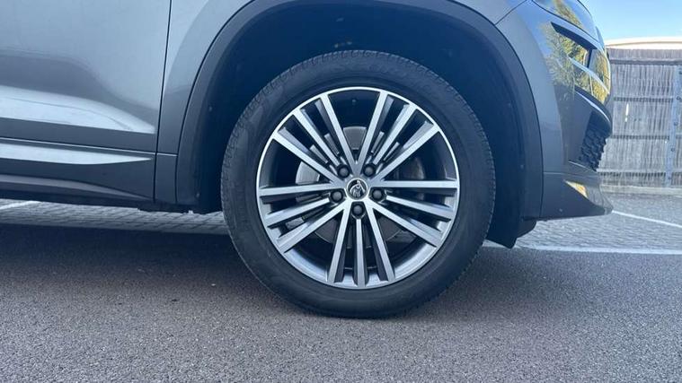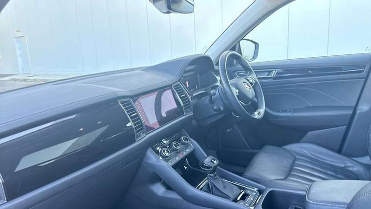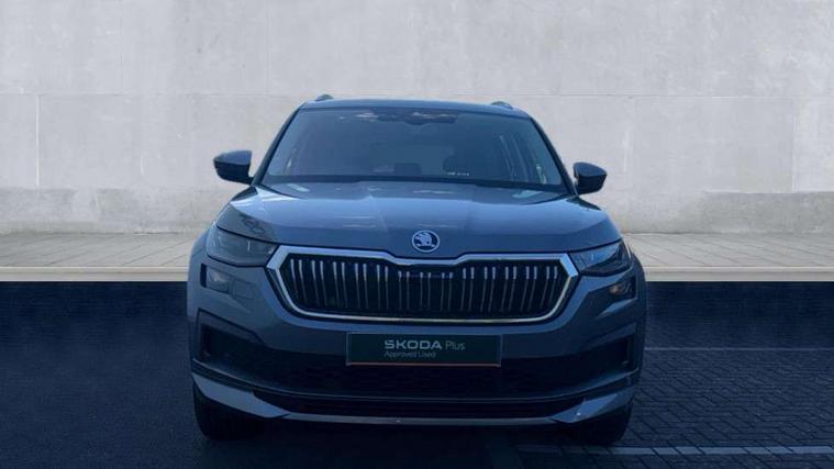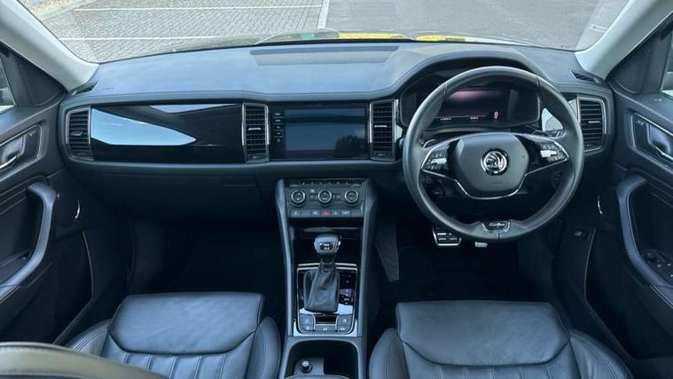 Area view, Bluetooth system, Columbus satellite navigation with 9.2" touchscreen, integrated Wi-Fi, web radio, E-call, ECO Stop/start function, Exterior temperature indicator, Progressive steering, Smartlink wireless for apple carplay and wired for android auto, Speed limiter, Tailgate unlocking from outside, USB C Port x 2 in front centre console, Virtual Cockpit - 10.25" digital display, Wireless charging, Canton sound system, DAB Digital radio, Aero front windscreen wipers with intermittent function, Aero rear window wiper, Auto dimming rear view mirror, Black wheel arch surrounds, Body colour bumpers, Body colour door mirrors and handles, Body colour door panels, Chrome front grille, Chrome roof rails with chrome window surround, Electric front and rear windows, Extended rear spoiler with finlets in gloss black, Front fog lights, Full LED matrix headlights with AFS (adaptive front light system), cornering function and AWL (all weather lighting system), Headlight washers, Heated rear window, Invisible tailpipe, L&K front and rear bumpers including lower rear chrome strip, LED daytime running lights, LED rear fog light, LED third brake light in rear spoiler, Off-road style lower front bumper element, Panoramic sunroof, Privacy glass, Rain and light sensors, Rear LED lights (high functionality) with welcome effect and dynamic indicators, Safety reflectors on front and rear doors, Window control switches with black trim, Without engine designation, 12V socket in boot, 2 rails with 2 hooks, 4 foldable roof handles with rear coat hooks, 60:40 foldable rear seat with sliding adjustment and backrest angle adjustment, Aluminium pedals, Bottle holders in door panel in the 1.5 litre front and 1 litre rear, Cargo storage compartments, Chrome headlight control button, Chrome interior door handles, Coat hooks on B pillar, Covered storage compartment on driver side, Decorative door sills in the front and rear, Front centre armrest with storage compartment, cup holder and 12V socket, Front courtesy lights, Gear shift lever with chrome frame and black gloss insert, Grey stitching in front and rear armrests and door armrests + door inserts, Height adjustable front headrests, Illuminated and cooled glovebox, Illuminated luggage compartment, Isofix child seat fittings in outer rear seats with top tether, Manually adjustable steering column, Net programme in boot (1x horizontal Net, 2x vertical Nets), Overhead glasses storage compartment, Pollen filter, Rear centre armrest with cupholders, Sliding trunk cover, Small Bags on the inner sides of the front backrests, Sunvisors with illuminated vanity mirrors, Three rear height adjustable headrests, Ticket holder on A Pillar, Umbrella in door panel, Variable boot floor, LED Interior light pack - Kodiaq, Auto door release and activation of warning lights in the event of an accident, Driver and front passenger airbag with knee airbag and front passenger airbag deactivation, Electronic parking brake with hill start assist, Emergency rear braking signal, ESC (incl. ABS+MSR+ASR+EDS+HBA+DSR+RBS+MKB), Front assist with autonomous emergency braking, Front side airbags with curtain airbags, Fuel cut off safety device, Height adjustable front 3 point seatbelts + pretensioners, Hill hold control, Rear disc brakes, Safety vest holder in door, Seat belt reminder for all seats, Three point rear seat belts, Two tone horn, Tyre pressure monitor, Alarm with interior monitoring and tilt sensor with safe function, Anti-theft wheel bolts, Immobiliser, Keyless entry and start system (KESSY), Remote central locking with 2 keys, Grey stitching in dashboard, Piano black decorative inserts, Plaquette L&K front fenders, Temporary spare wheel (space saver),